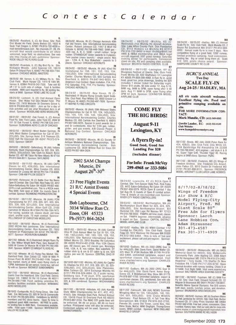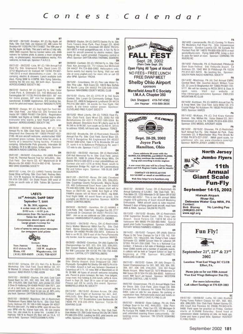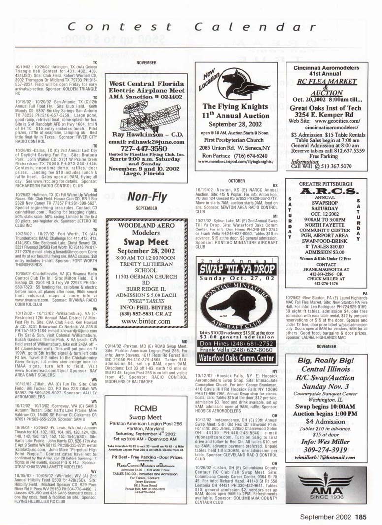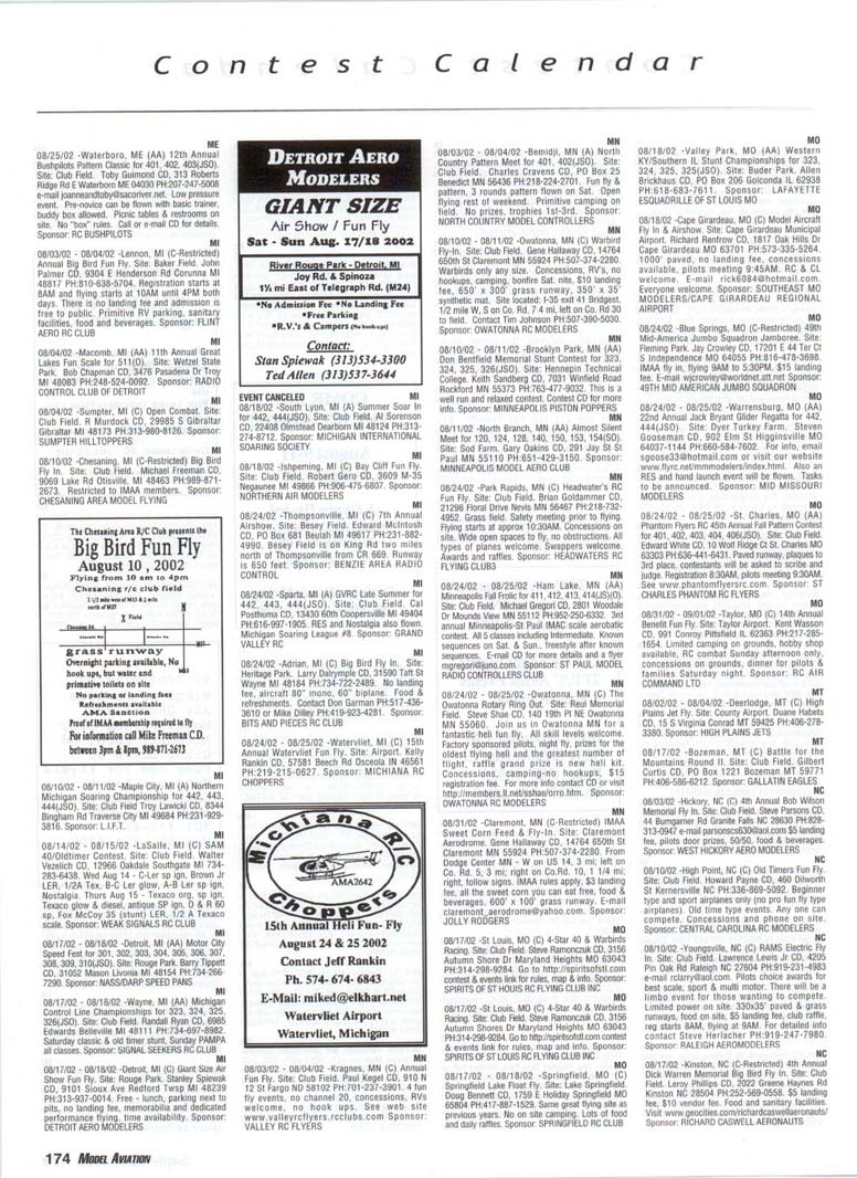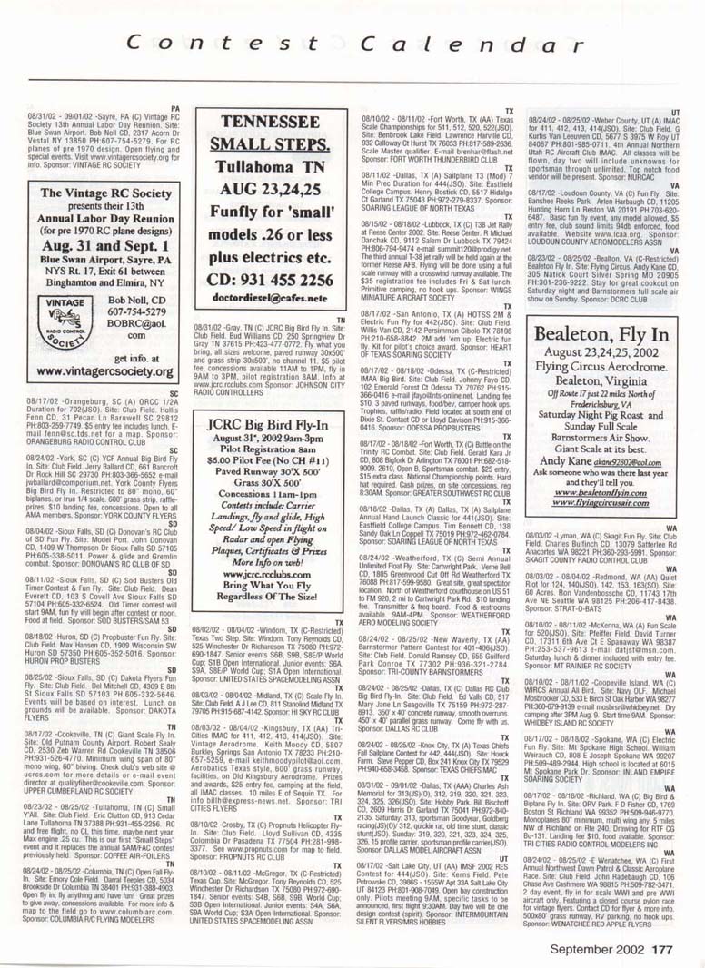 Contest Calendar Revised 2002 Sanction List TYPES OF EVENTS FAI Evenls marked wrth ' OUTDOOR FREE FLIGHT Category I, II, or III only if event is marked with * 101 1/2AGas .... 102AGas ....... . 103BGas ...... 104 C Gas ...... . 105 D Gas ....... 106 Payload .. ... - 107 Cargo 120 Mulvihill ....... . 121 Big E ...... . 122 Dawn Unlimited 124 P-30 125 Omithopler 126 Autogiro 127 Helicopter 128 Moflett 129 Bostonian ........+ 130 Rubber Speed 140 HL Glider 142 Catapult Glider 150 F A-A2 Glider . " 151 F B Wakefield . ." 152 F C Power ....... ' 153 F G Coupe tfHiver ' 154 F H Al Glider 155 F J 1/2A Power 156F KCO-2 . .. . 157 F E SJp. Srg. Glider + 160Eleclric A .........+ 161 EleclhcB .........+ 162 Rocket ..........+ 163 CO 2 164 Large Co-2 INDOOR FREE FLIGHT Categonesl.lt. III. and IV 201 HL Stick 202 Immediate Stick 203 F1D Rubber . . .' 204 Cabin 205 Manhattan 206 Easy B 207 Pennyplane 208 Limited Pennypiane 209 Helicopter 210Omithopter 211 Autogiro 212HLGlKter 213 Kit Plan Scale 214 HOG Stick 215Boslonian 216 Experimental Autogiro 217F1LEZB ..........' 218 Std Class Cat. GWr. 219UntimrtedQass. Catapult Glider 220 Mini Stick CONTROL LINE 301 1/2A Speed 302 A Speed 303 B Speed 304 D Speed 305 1/2A Profile Prolo 306 .21 Proto 307 21 Sport Speed 308 Formula 40 309 Jet 310 F2A Speed 311 Rat Racing 312 Slow Rat 313 1/2A Mouse-1 314 1/2A Mouse-11 315 1/2A Scate-l 316 1/2 A Scale-11 317 Sea le Racing 31B F2C Team Race 319 Navy Camer-l 320 Navy Camer-ll 321 Navy Carrier (Profile) 322 Precision Aerobatics 323 Beginner Skill Class 324 Intermedate Skill Class 325 Advanced Skill Class 326 Expert Skill Class 327 F2B Aerobatics 328 Combat 329 Stow Combal 330 1/2A Combat 331 F2D Combat. . ' 332 Endurance 333 Orve Bombing ft Slrafing RC AEROBATICS 401 Sportsman Pattern 402 Intermediate Pattern 403 Advanced Pattern 404 Masters Pattern 406 F3A Pattern . . . .' 411 Scale Aerobatics/Basic 412 Scate Aerobatcs/ Sportsman 413 Scale Aerobatics/ Advanced 414 Scale Aerobatics/ Unlimited RC PYLON RACING 421 Formula I Pylon 422 Q-40 Pylon 423 1/2A Pylon 424 Q-500 Sport 425Q-15 427 F3D Pylon . 428 Q-500 RC HELICOPTER 431 Class I 432 Class II 433 Class III 434 F3C Helicopter .....' RC SAILPLANE 441 Thrml. Soanng-HL (A) 442 Thrml Soanng-2-Mtr. (B) 443 Thrml. Soanng-Std. (C) 444 Thrrrt. Soaring-Unfm (D) 445 F3B Thrml Soanng • 446 F3H Cross Country / 451 Slope Soanng-HL (A) 452 Slope Soanng-2-Mtr. (B) 453 Slope Soanng-Std. (C) 454 Slope Soanng-Unkm (D) 455 F3F Slope Soanng .' 456 F3J Thermal Duration Glidei SCALE 501 Peanut (Outdoor) 503 Flying Rubber (Outdoor) 504 Gas (Outdoor) 505 Peanut (Indoor) 507 Flying Rubber (Indoor) 508 CL AMA Precision 509 CL Sport Scate 510 F4BCL Scale 511 RC Sportsman Spt Scale 512 RC Expert Sport Scale 513 RC Sportsman/ Exp. Comb. 515 RC Designer Scale 516 F4 RC Scale ......' 517 RC Sport Scale Soaring 518 RC Helicopter 519 FF Indoor Power 520 RC Fun Scale 521 CL Profile 522 RC Team Scale ELECTRIC 601 F5B RC Soanng . . . • 602 F5A RC Aerobatics ' 603 F5D RC Pyton . . . • 606 Class A-CL Speed 607 Class B-CL Speed 608 CL Prec. Aero 609 RC Class A Sailplane 610 RC Class A Sailplane (LMR) 611 RC Class B Sailplane 612 RC Class B SailplanelLMR) 613 RC Class B Sailplane Endur. 614 RC Class A Pylon 615 RC Class B Pylon 616RCOtd-TimerTexaco 6l7RCCIassAOId-Timer 618 RC Class A OkJ-Timer (LMR) 619RCCIassBCHd-Timer 620 RC Class B CHd-Timer (LMH) 621 RC "Oldie Texaco" 622 RC Class A "OWw" 623RCCIassA-Okfe" (LMR) 624 RC Class B "Oid.e11 625 RC a B"Otte"(LMR) 626 RC Prec Aero. 627 Ind. Etec Dur. 628 Etec. ROW RC Seaplane SPECIAL EVENTS 701 AMA Vintage 702 RC Duration 703 Climb and Glide 704 WWII Combat .....' 705 RC Competition Fun Fly INTERPRETATION OF EVENT LISTINGS: 101-104 means that events numbered 101. 102. 103, and 104 are to be flown separately. (101-104) means that events numbered 101, 102, 103. and 104 are combined. 101, 104 means only events 101 and 104 are flown, and that they are flown separately. (101, 104) means only events 101 and 104 are flown, but that they are combined for competition. NOTE: To assure quick response, be certain to send a stamped, self-addressed envelope to the listed Contest Director along with your request for information about an event. The letters in parentheses (A, B, AA, etc.) immediately following the date and location of an event refer to sanction classification, as explained in the AMA rule book B" indicates a restriction of entry in some fashion, and the event's contact person should be queried to obtain more details and to possibly avoid misunderstanding or disappointment by the intended participant, particularly if considerable travel may be involved. (T) indicates a traditional event (one which has occurred for a number of years at the same date and place and with the same sponsor) Contest Calendar is sorted by date within each state Flying AUGUST AL 08/03/02 - 08/04/02 -Huntsville. AL (C) Rocket City Radio Controllers War Bird Fly In. Site: Capt Trey Wilbourn Field. John Pieczynski CD. 801 Vestavia Cir Huntsville AL 35802 e-mail johnandjan@knology.net Any size war bird, jets welcome. RVs welcome, no hook ups, food & drinks available. Trophies and door prizes. Sponsor: ROCKET CITY RADIO CONTROLLERS AL 08/24/02 -Ft.Payne. AL (C) DRCF Big Bird Fly In. Site: Jacoway RC Field. Boyd Johnson CD, 403 B 5th St NE Ft. Payne AL 35967 PH:256-845-3019. 80" mono, 60" bipe or true 1/4 scale, static display, awards, hourly prizes, cash grand prize. 80' x 500' smooth grass runway. $10 landing fee, on site concessions, gates open at SAM. Sponsor: DEKALB RC FLYERS CA 08/10/02 -Long Beach, CA (A) EDSF Hand Launch for 441(0). Site: El Dorado Park-William Duncan CD, 5462 Cerulean Ave Garden Grove CA 92845 PH:714-892-8665. Sponsor: EL DORADO SILENT FLYERS CA 08/10/02 - 08/11/02 -Ojai. CA (C) Fun Float Fly. Site: Lake Casitas. Bernard Hammer CD, 4530 Syracuse Dr Oxnard CA 93033 PH:805-488-5179. Sponsor: VENTURA CO COMETS CA 08/10/02 - 08/11/02 -Riverside. CA (AA) Riverside 