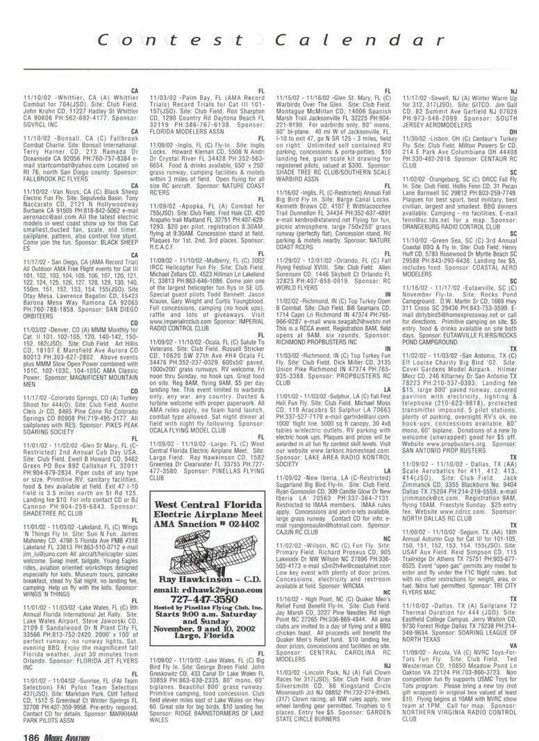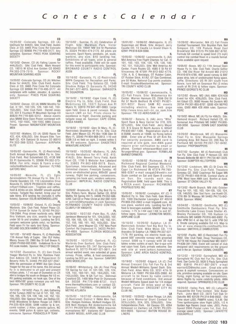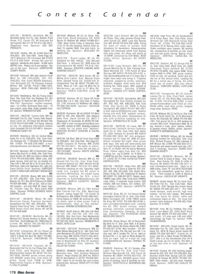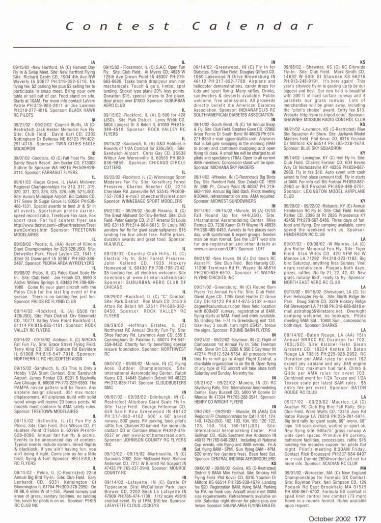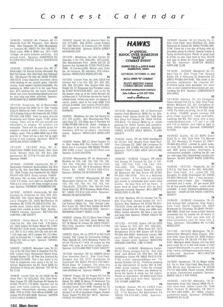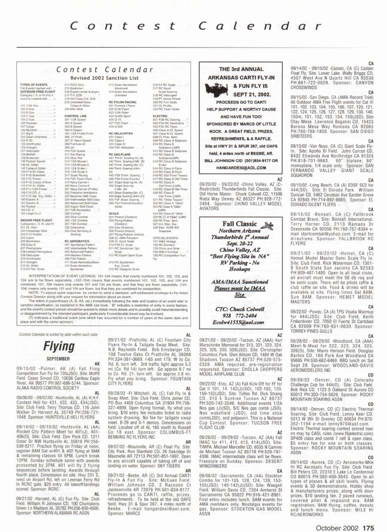 Contest Calendar Contest Calendar Revised 2002 Sanction List TYPES OF EVENTS FAI Events marked with -' OUTDOOR FREE FLIGHT Category I. II. or III only i! event is marked with ....•*• 101 1/2AGas .- ...... 102 A Gas ..... .. 103 B Gas . . ... . 104 C Gas ... .... . 105 D Gas ....... . 106 Payload . ... 107 Cargo 12DMulvihill ...... 121 Big E . . 122 Dawn Unlimited 124P-30 125Omilhopler 126 Autogifo 127 Helicopter 128 Moffett 129Bostonian .... .-130 Rubber Speed 140 HL Glider 142 Catapult Glider 150 F1A-A2 Glider 151 F1B Wakefield . . 152 F1C Power ... .. 153 F1G Coupe d'Hiver 154F1H A1 Glider . .. 155 F1J1/2A Power . . 156F1KCO-2 ....... 157 FIE Sip Srg. Glider l60EleclricA . . . . . 161 Eleclnc B 162 Rocket ... ... . 163 CO-2 164 Large Co-2 INDOOR FREE FLIGHT Categories I. II, III. and IV 201 HL Stick 202 Immediate Stick 203 F1D Rubber .......' 204 Cabin 205 Manhattan 206 Easy B 207 Penn/plane 208 Limited Pennyplane 209 Helicopter 210 Ornithopter 211 Autogiro 212 HL Glider 213 Kit Plan Scale 214 ROG Slick 215 Bostonian 216 Experimental Autogiro 217F1LEZB . ... . . . • 218 Std Class Cat. Gide. 219 Unlimited Class. Catapult Glider 220 Mini Stick CONTROL LINE 301 1/2A Speed 302 A Speed 303 B Speed 304 O Speed 305 1/2A Profile Proto 306 .21 Proto 307 21 Sport Speed 308 Formula 40 309 Jet 310 F2A Speed . . . * 311 Rat Racing 312 Slow Rat 313 l/2AMouse-l 314 1/2A Moose-11 315 1/2AScale-l 316 1/2 A Scale-11 317 Scale Racing 318 F2C Team Race . ' 319 Navy Carner-l 320 Navy Carrier-ll 321 Nawy Carrier (Profile) 322 Precision Aerobatics 323 Beginner Skill Class 324 Intermediate Skill Class 325 Advanced Skill Class 326 Expert Skill Class 327 F2B Aerobatics . . ' 328 Combal 329 Slow Combat 330 1 /2A Combat 331 F2D Combal 332 Endurance 333 Dive Bombing & Strafing RC AEROBATICS 401 Sportsman Pattern 402 Intermediate Patlein 403 Advanced Pattern 404 Masters Pattern 406 F3A Pattern . • 411 Scale Aerobatics/Basic 412 Scale Aerobatic s.' Sportsman 413 Scale Aerobatics* Advanced 414 Scale Aerobatics; Unlimited RC PYLON RACING 421 Formula I Pylon 422 CMO Pylon 423 1/2A Pylon 424 Q-500 Sport 425Q-15 427 F3D Pylon . . .* 428 Q-500 HC HELICOPTER 431 Class I 432 Class II 433 Class III 434 F3C Helicopter .....* RC SAILPLANE 441 Thrml Soaring-HL(A) 442 Thrml. Soaring-2-Mtr (B) 443 Thrml Soaring-Sid. (C) 444 Thrml Soanng-Unlim. (D) 445 F3B Trirml. Soaring .' 446 F3H Cross Country .' 451 Slope Soanng-HL (A) 452 Slope Soanng-2-Mtr. (B) 453 Slope Soaring-Std. (C) 454 Slope Soanng-Unlim (D) 455 F3F Slope Soaring .' 456 F3J Thermal Duration Glider SCALE 501 Peanut (Outdoor) 503 Flying Rubber (Outdoor) 504 Gas (Outdoor) 505 Peanut (Indoor) 507 Flying Rubber (Indoor) 508 CL AMA Precision 509 CL Sport Scale 510F4BCL Scale 511 RC Sportsman Spt Scale 512 RC Expert Sport Scale 513 RC Sportsman/ Exp. Comb 515 RC Designer Scale 516 F4 RC Scale .......' 517 RC Sport Scale Soaring 518 RC Helicopter 519 FF Indoor Power 520 RC Fun Scale 521 CL Profile 522 RC Team Scale ELECTHtC 601 F5B RC Soaring . ' 602 F5A RC Aerobatics .' 603 F5D RC Pylon . ..." 606 Class A-CL Speed 607 Class B-CL Speed 608 CL Prec. Aero 609 RC Class A Sailplane 610 RC Class A Sailplane (LMR) 611 RC Class B Sailplane 612 RC Class B Sailplane(LMR) 613 RC Class B Sailplane Endur 614 RC Class A Pylon 615 RC Class B Pylon 616 RC Old-Timer Texaco 617 RC Class A Old-Timer 618 RC Class A Old-Timer (LMR) 619RCCIassBOW-Timer 620 RC Class B Old-Timer (LMR) 621 RC "Oldie Texaco" 622 RC Class A "Oldie-623 RC Class A "Oldie" (LMR) 624 RC Class B "OWie" 625 RC Cl. B -Oldie" (LMR) 626 RC Piec. Aero 627 Ind. Elec. Dur. 628 Etec ROW R/C Seaplane SPECIAL EVENTS 701 AMA Vintage 702 RC Duration 703 Climb and Glide 704 WW II Combal . . . .' 705 FtC Compelition Fun Fly INTERPRETATION OF EVENT LISTINGS: 101-104 means that events numbered 101. 102. 103, and 104 are to be flown separately. (101-104) means that events numbered 101. 102, 103. and 104 are combined- 101, 104 means only events 101 and 104 are flown, and that they are flown separately- (101. 104) means only events 101 and 104 are flown, but that they are combined for competition. NOTE: To assure quick response, be certain to send a stamped, self-addressed envelope to the listed Contest Director along with your request for information about an event. The letters in parentheses {A, B. AA. etc.) immediately following the date and location of an event refer to sanction classification, as explained in the AMA rule book. "B" indicates a restriction of entry in some fashion, and the event's contact person shouki be queried to obtain more details and to possibly avoid misunderstanding or disappointment by the intended participant, particularly if considerable travel may be involved, (T) indicates a traditional event (one which has occurred for a number of years at the same date and place and with the same sponsor) Contest Calendar is sorted by date within each state Flying SEPTEMBER AK 09/15/02 -Palmer. AK (A) Fall Fling Competition Fun Fly for 705(JSO). Site: Moffit Field. Casey Smoot CD. 10036 Caribou Eagle River, AK 99577 PH:907-696-5744. Sponsor: ALAKA RADIO CONTROL SOCIETY AL 09/06/02 - 09/07/02 -Huntsville. AL (A) H.H.F. Contest Heli for 431. 432. 433, 434(JSO). Site: Club Field. Terry Tbomas CD. 116 John Walker Dr Harvest AL 35749 PH:256-721-1048. Sponsor: HUNTSVILLE HELI FLYERS AL 09/14/02 - 09/15/02 -Huntsville. AL (AA) Rocket City Pattern Meet for 401 (J), 401-406(0). Site: Club Field. Don Peck CD, 1311 Oster Dr NW Huntsville AL 35816 PH:256-539-5217. Practice flying on Friday at noon, register SAM Sat w/401 & 402 flying at 9AM & remaining classes till 5PM. Lunch break 12PM. Sunday schedule same with awards presented by 3PM. 401 will fly 2 flying sequences before landing. Awards through fourth place. Concession on site. Hwy 231 S. west on Airport Rd. left on Leeman Ferry Rd to RCRC gate. $20 entry. All takeoff/landings scored. Sponsor: RCRC AL 09/21/02 -Harvest, AL (C) Fun Fly, Site: Club Field. William R Johnson C