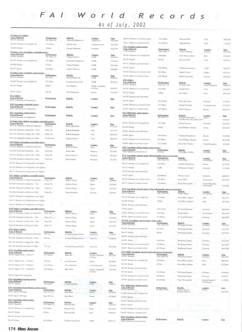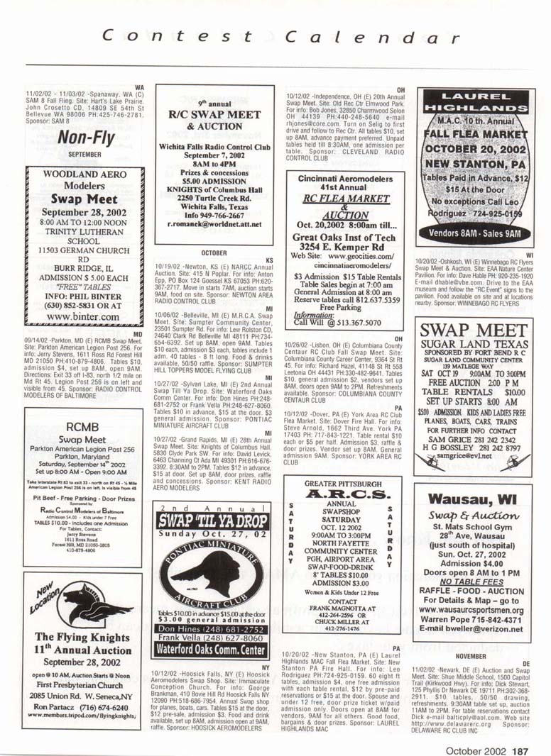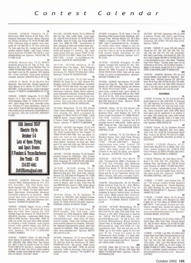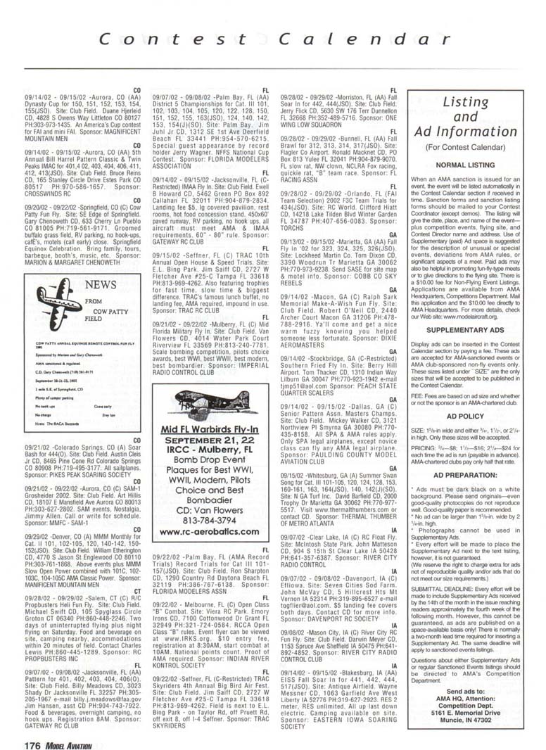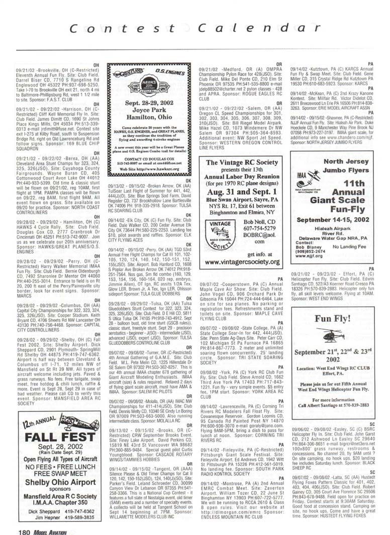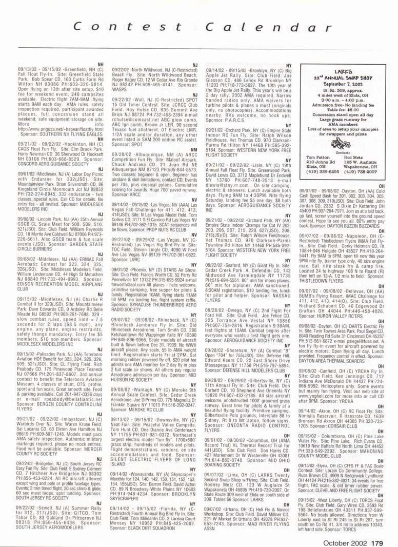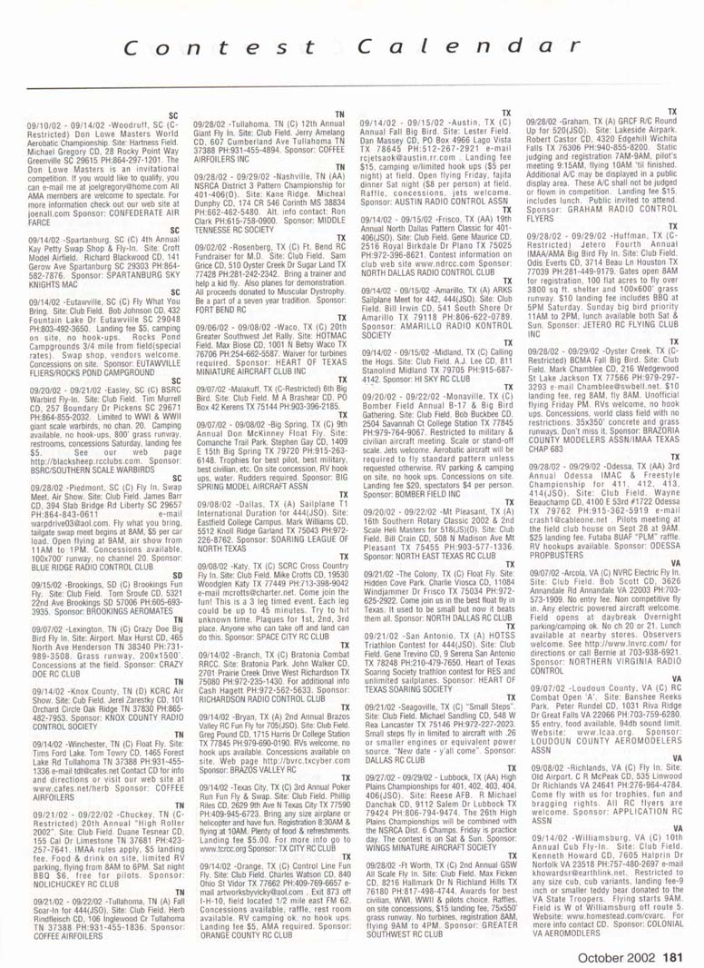 Contest Calendar Contest Calendar Revised 2002 Sanction List TYPES OF EVENTS FAI Events marked with -' OUTDOOR FREE FLIGHT Category I. II. or III only i! event is marked with ....•*• 101 1/2AGas .- ...... 102 A Gas ..... .. 103 B Gas . . ... . 104 C Gas ... .... . 105 D Gas ....... . 106 Payload . ... 107 Cargo 12DMulvihill ...... 121 Big E . . 122 Dawn Unlimited 124P-30 125Omilhopler 126 Autogifo 127 Helicopter 128 Moffett 129Bostonian .... .-130 Rubber Speed 140 HL Glider 142 Catapult Glider 150 F1A-A2 Glider 151 F1B Wakefield . . 152 F1C Power ... .. 153 F1G Coupe d'Hiver 154F1H A1 Glider . .. 155 F1J1/2A Power . . 156F1KCO-2 ....... 157 FIE Sip Srg. Glider l60EleclricA . . . . . 161 Eleclnc B 162 Rocket ... ... . 163 CO-2 164 Large Co-2 INDOOR FREE FLIGHT Categories I. II, III. and IV 201 HL Stick 202 Immediate Stick 203 F1D Rubber .......' 204 Cabin 205 Manhattan 206 Easy B 207 Penn/plane 208 Limited Pennyplane 209 Helicopter 210 Ornithopter 211 Autogiro 212 HL Glider 213 Kit Plan Scale 214 ROG Slick 215 Bostonian 216 Experimental Autogiro 217F1LEZB . ... . . . • 218 Std Class Cat. Gide. 219 Unlimited Class. Catapult Glider 220 Mini Stick CONTROL LINE 301 1/2A Speed 302 A Speed 303 B Speed 304 O Speed 305 1/2A Profile Proto 306 .21 Proto 307 21 Sport Speed 308 Formula 40 309 Jet 310 F2A Speed . . . * 311 Rat Racing 312 Slow Rat 313 l/2AMouse-l 314 1/2A Moose-11 315 1/2AScale-l 316 1/2 A Scale-11 317 Scale Racing 318 F2C Team Race . ' 319 Navy Carner-l 320 Navy Carrier-ll 321 Nawy Carrier (Profile) 322 Precision Aerobatics 323 Beginner Skill Class 324 Intermediate Skill Class 325 Advanced Skill Class 326 Expert Skill Class 327 F2B Aerobatics . . ' 328 Combal 329 Slow Combat 330 1 /2A Combat 331 F2D Combal 332 Endurance 333 Dive Bombing & Strafing RC AEROBATICS 401 Sportsman Pattern 402 Intermediate Patlein 403 Advanced Pattern 404 Masters Pattern 406 F3A Pattern . • 411 Scale Aerobatics/Basic 412 Scale Aerobatic s.' Sportsman 413 Scale Aerobatics* Advanced 414 Scale Aerobatics; Unlimited RC PYLON RACING 421 Formula I Pylon 422 CMO Pylon 423 1/2A Pylon 424 Q-500 Sport 425Q-15 427 F3D Pylon . . .* 428 Q-500 HC HELICOPTER 431 Class I 432 Class II 433 Class III 434 F3C Helicopter .....* RC SAILPLANE 441 Thrml Soaring-HL(A) 442 Thrml. Soaring-2-Mtr (B) 443 Thrml Soaring-Sid. (C) 444 Thrml Soanng-Unlim. (D) 445 F3B Trirml. Soaring .' 446 F3H Cross Country .' 451 Slope Soanng-HL (A) 452 Slope Soanng-2-Mtr. (B) 453 Slope Soaring-Std. (C) 454 Slope Soanng-Unlim (D) 455 F3F Slope Soaring .' 456 F3J Thermal Duration Glider SCALE 501 Peanut (Outdoor) 503 Flying Rubber (Outdoor) 504 Gas (Outdoor) 505 Peanut (Indoor) 507 Flying Rubber (Indoor) 508 CL AMA Precision 509 CL Sport Scale 510F4BCL Scale 511 RC Sportsman Spt Scale 512 RC Expert Sport Scale 513 RC Sportsman/ Exp. Comb 515 RC Designer Scale 516 F4 RC Scale .......' 517 RC Sport Scale Soaring 518 RC Helicopter 519 FF Indoor Power 520 RC Fun Scale 521 CL Profile 522 RC Team Scale ELECTHtC 601 F5B RC Soaring . ' 602 F5A RC Aerobatics .' 603 F5D RC Pylon . ..." 606 Class A-CL Speed 607 Class B-CL Speed 608 CL Prec. Aero 609 RC Class A Sailplane 610 RC Class A Sailplane (LMR) 611 RC Class B Sailplane 612 RC Class B Sailplane(LMR) 613 RC Class B Sailplane Endur 614 RC Class A Pylon 615 RC Class B Pylon 616 RC Old-Timer Texaco 617 RC Class A Old-Timer 618 RC Class A Old-Timer (LMR) 619RCCIassBOW-Timer 620 RC Class B Old-Timer (LMR) 621 RC "Oldie Texaco" 622 RC Class A "Oldie-623 RC Class A "Oldie" (LMR) 624 RC Class B "OWie" 625 RC Cl. B -Oldie" (LMR) 626 RC Piec. Aero 627 Ind. Elec. Dur. 628 Etec ROW R/C Seaplane SPECIAL EVENTS 701 AMA Vintage 702 RC Duration 703 Climb and Glide 704 WW II Combal . . . .' 705 FtC Compelition Fun Fly INTERPRETATION OF EVENT LISTINGS: 101-104 means that events numbered 101. 102. 103, and 104 are to be flown separately. (101-104) means that events numbered 101. 102, 103. and 104 are combined- 101, 104 means only events 101 and 104 are flown, and that they are flown separately- (101. 104) means only events 101 and 104 are flown, but that they are combined for competition. NOTE: To assure quick response, be certain to send a stamped, self-addressed envelope to the listed Contest Director along with your request for information about an event. The letters in parentheses {A, B. AA. etc.) immediately following the date and location of an event refer to sanction classification, as explained in the AMA rule book. "B" indicates a restriction of entry in some fashion, and the event's contact person shouki be queried to obtain more details and to possibly avoid misunderstanding or disappointment by the intended participant, particularly if considerable travel may be involved, (T) indicates a traditional event (one which has occurred for a number of years at the same date and place and with the same sponsor) Contest Calendar is sorted by date within each state Flying SEPTEMBER AK 09/15/02 -Palmer. AK (A) Fall Fling Competition Fun Fly for 705(JSO). Site: Moffit Field. Casey Smoot CD. 10036 Caribou Eagle River, AK 99577 PH:907-696-5744. Sponsor: ALAKA RADIO CONTROL SOCIETY AL 09/06/02 - 09/07/02 -Huntsville. AL (A) H.H.F. Contest Heli for 431. 432. 433, 434(JSO). Site: Club Field. Terry Tbomas CD. 116 John Walker Dr Harvest AL 35749 PH:256-721-1048. Sponsor: HUNTSVILLE HELI FLYERS AL 09/14/02 - 09/15/02 -Huntsville. AL (AA) Rocket City Pattern Meet for 401 (J), 401-406(0). Site: Club Field. Don Peck CD, 1311 Oster Dr NW Huntsville AL 35816 PH:256-539-5217. Practice flying on Friday at noon, register SAM Sat w/401 & 402 flying at 9AM & remaining classes till 5PM. Lunch break 12PM. Sunday schedule same with awards presented by 3PM. 401 will fly 2 flying sequences before landing. Awards through fourth place. Concession on site. Hwy 231 S. west on Airport Rd. left on Leeman Ferry Rd to RCRC gate. $20 entry. All takeoff/landings scored. Sponsor: RCRC AL 09/21/02 -Harvest, AL (C) Fun Fly, Site: Club Field. William R Johnson C