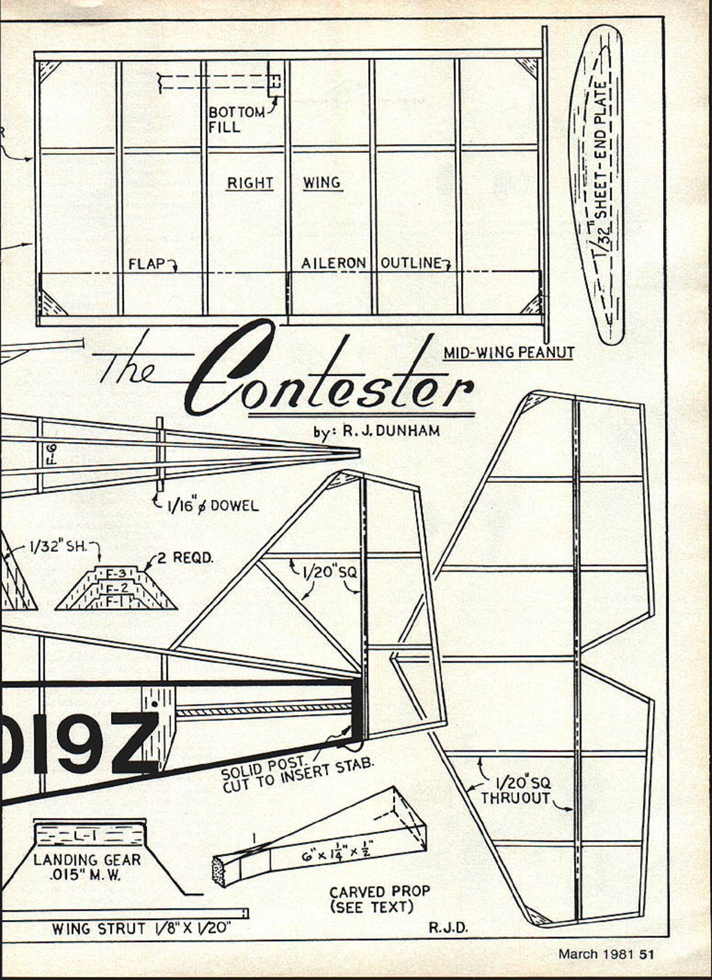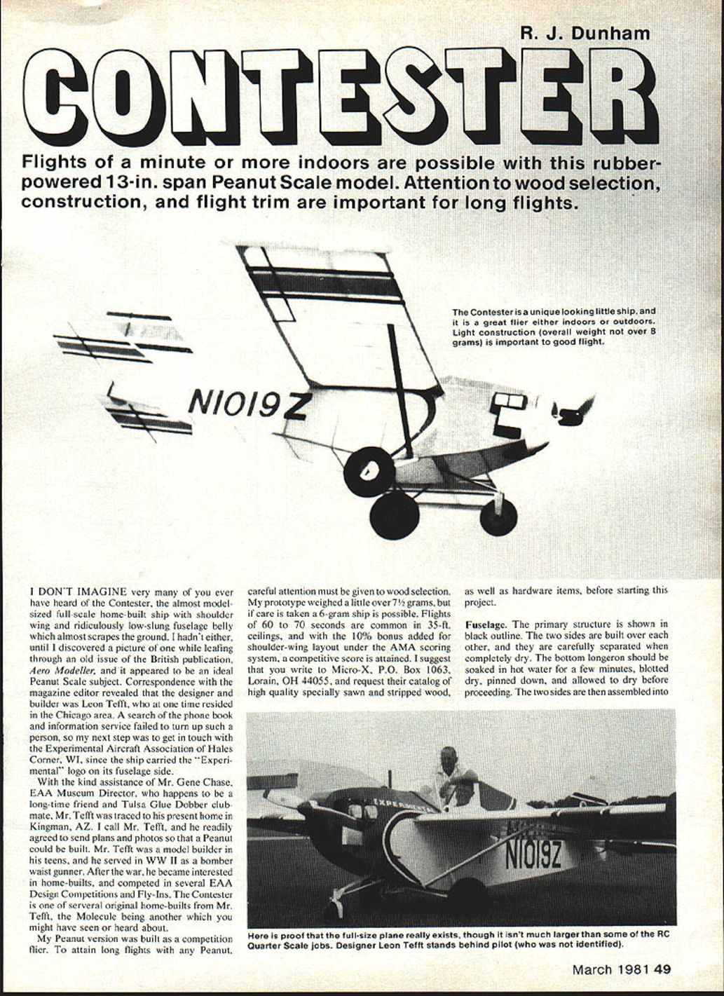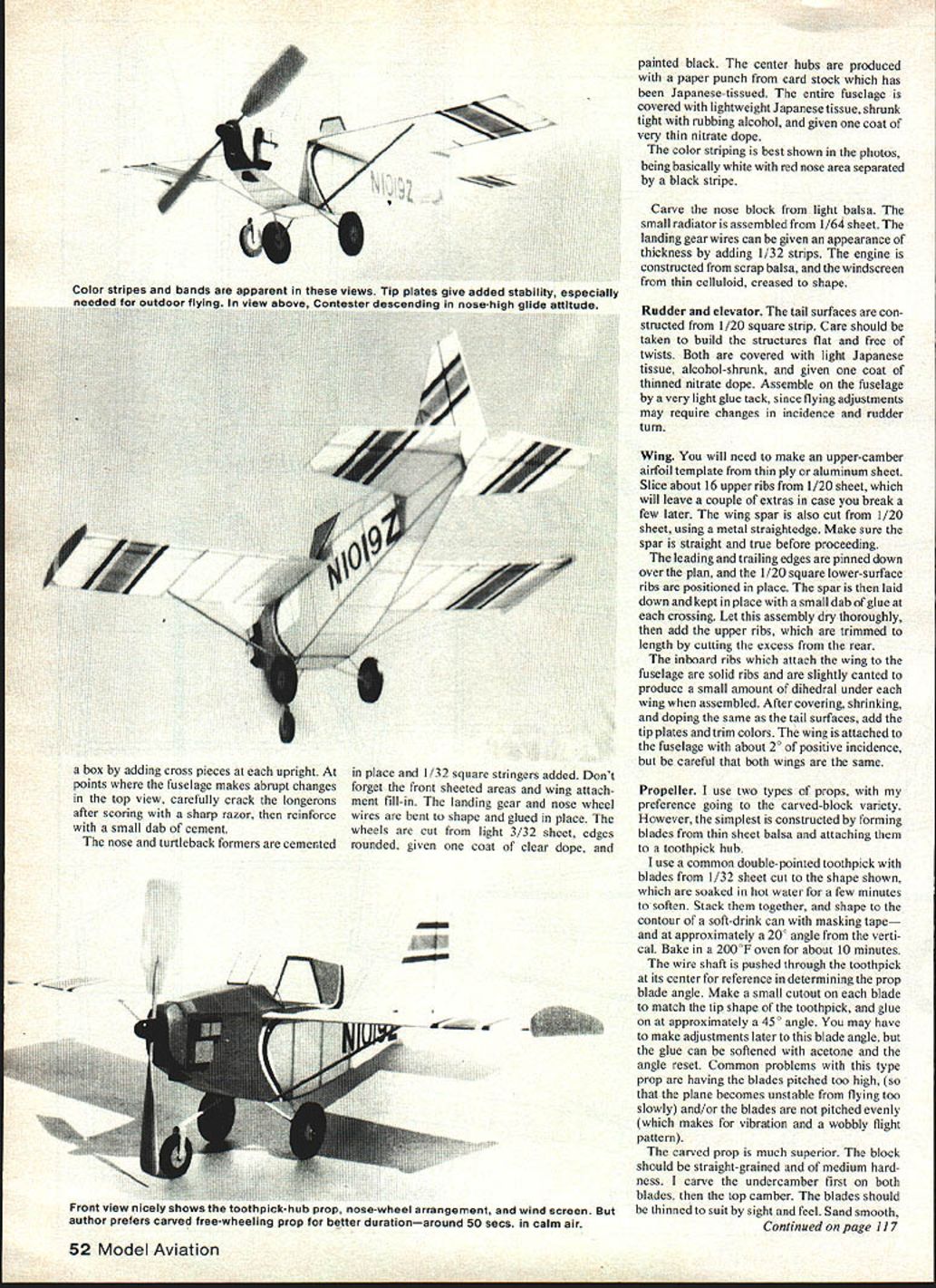 Flights minute indoors powered 13-in span Peanut Scale model construction flight trim imp NIOI9Q DONT IMAGINE very ever have heard Contester almost modelsized full-scale home-built ship shoulder wing ridiculously low-slung fuselage belly almost scrapes ground hadnt either until discovered picture leafing through old issue British publication Aero Modeller appeared ideal Peanut Scale subject Correspondence magazine editor revealed designer builder Leon Teift time resided Chicago area search phone book information service failed turn up such person next step get touch Experimental Aircraft Association Hales Corner WI since ship carried Experi mental logo its fuselage side kind assistance Mr Gene Chase EAA Museum Director happens long-time friend Tulsa Glue Dobber clubmate Mr Teift traced present home Kingman AZ call Mr Teift readily agreed send plans photos Peanut could built Mr Teift model builder teens served WW II bomber waist gunner After war became interested home-builts competed several EAA Design Competitions Fly-Ins Contester serveral original home-builts Mr Tefft Molecule being another might have seen heard about Peanut version built competition flier attain long flights Peanut careful attention must given wood selection prototype weighed little over 712 grams care taken 6-gram ship possible Flights 60 70 seconds common 35-ft ceilings 10% bonus added shoulder-wing layout under AMA scoring system competitive score attained suggest write Micro-X PO Box 1063 Lorain OH 44055 request catalog high quality specially sawn stripped wood March 1981 49 well hardware items before starting project Fuselage primary structure shown black outline two sides built over other carefully separated completely dry bottom longeron should soaked hot water few minutes blotted dry pinned down allowed dry before proceeding two sides assembled proof full-size plane really exists tflough Isni mucn iarger man some inc n Quarter Scale lobs Designer Leon Tefft stands behind pilot identified f-I r-C V3ZSc24 CflU CC END RI _______ I/20X MSLANT JDIHEDF LEFTWING J 3 1/20 -0 SHEET ___________ _____yRIB N___-- _____ 0 ________ I/16X I/&j ________ _______ A Ill COLOR DATA WHITE WITH RED______ AND BLACK TRIM SEE TEXT 8c PHOTOS1DIHEDRAL 2 ALUMTUBEWASHER-NI-I _0a-ULii 11Pi-II * 5I -BALSASCRAP Dt Ji POWER 16LOOP IH I07WIDEa 111 II500TURNS trN0 XPERIMEN AIf0 OjtjI o -c FILLIIION SIDES FUSE AGE LONGE NS AND __EPOXY L2CR05 PIECES AREAj3~~ UNLESS 7-BGR 50 Model Aviation jEThd FLAPj BOTTOM FILL RIGHT WING ILERON OUT LI N E3 WING PEANUT RJ DUNHAM 9 Lj DOWEL 2 REQDI/20SQV 311 I/2OUSQ THRUOUT cL-I 27j LANDING GEAR 015 MW 1 CARVED PROP SEE TEXT RJD N March 1981 51 IIi 1101 iLi IIiI I~I rjI ii 1 WING STRUT I/8X 1/20 box adding cross pieces upright place 1/32 square stringers added Dont points fuselage makes abrupt changes forget front sheeted areas wing attachin top view carefully crack longerons ment fill-in landing gear nose wheel after scoring sharp razor reinforce wires bent shape glued place small dab cement wheels cut light 3/32 sheet edges nose turtleback formers cemented rounded given coat clear dope painted black center hubs produced paper punch card stock has Japanese-tissued entire fuselage covered lightweight Japanese tissue shrunk tight rubbing alcohol given coat very thin nitrate dope color striping best shown photos being basically white red nose area separated black stripe Carve nose block light balsa small radiator assembled 1/64 sheet landing gear wires can given appearance thickness adding 1/32 strips engine constructed scrap balsa windscreen thin celluloid creased shape Rudder elevator tail surfaces con structed 1/20 square strip Care should taken build structures flat free twists Both covered light Japanese tissue alcohol-shrunk given coat thinned nitrate dope Assemble fuselage very light glue tack since flying adjustments may require changes incidence rudder tum Wing will need make upper-camber airfoil template thin ply aluminum sheet Slice about 16 upper ribs 1/20 sheet will leave couple extras case break few later wing spar also cut 1/20 sheet using metal straightedge Make sure spar straight true before proceeding leading trailing edges pinned down over plan 1/20 square lower-surface ribs positioned place spar laid down kept place small dab glue crossing Let assembly dry thoroughly add upper ribs trimmed length cutting excess rear inboard ribs attach wing fuselage solid ribs slightly canted produce small amount dihedral under wing assembled After covering shrinking doping same tail surfaces add tip plates trim colors wing attached fuselage about 20 positive incidence careful both wings same Propeller use two types props preference going carved-block variety However simplest constructed forming blades thin sheet balsa attaching toothpick hub use common double-pointed toothpick blades 1/32 sheet cut shape shown soaked hot water few minutes soften Stack together shape contour soft-drink can masking tape approximately 20 angle verti cal Bake 2000F oven about 10 minutes wire shaft pushed through toothpick its center reference determining prop blade angle Make small cutout blade match tip shape toothpick glue approximately 450 angle may have make adjustments later blade angle glue can softened acetone angle reset Common problems type prop having blades pitched too high plane becomes unstable flying too slowly and/or blades pitched evenly makes vibration wobbly flight pattem carved prop much superior block should straight-grained medium hard ness carve undercamber first both blades top camber blades should thinned suit sight feel Sand smooth Continued page 117 52 Model Aviation Color striDes bands afloarent views Tip plates give added stability especially dacending nose-high glide attitude Front view nicely snows toothpick-hub prop nose-wheel arrangement wind screen author prefers carved free-wheeling prop better durationaround 50 secs calm air area Try soldering up two holes using tubing smaller *-in feed vent lines
