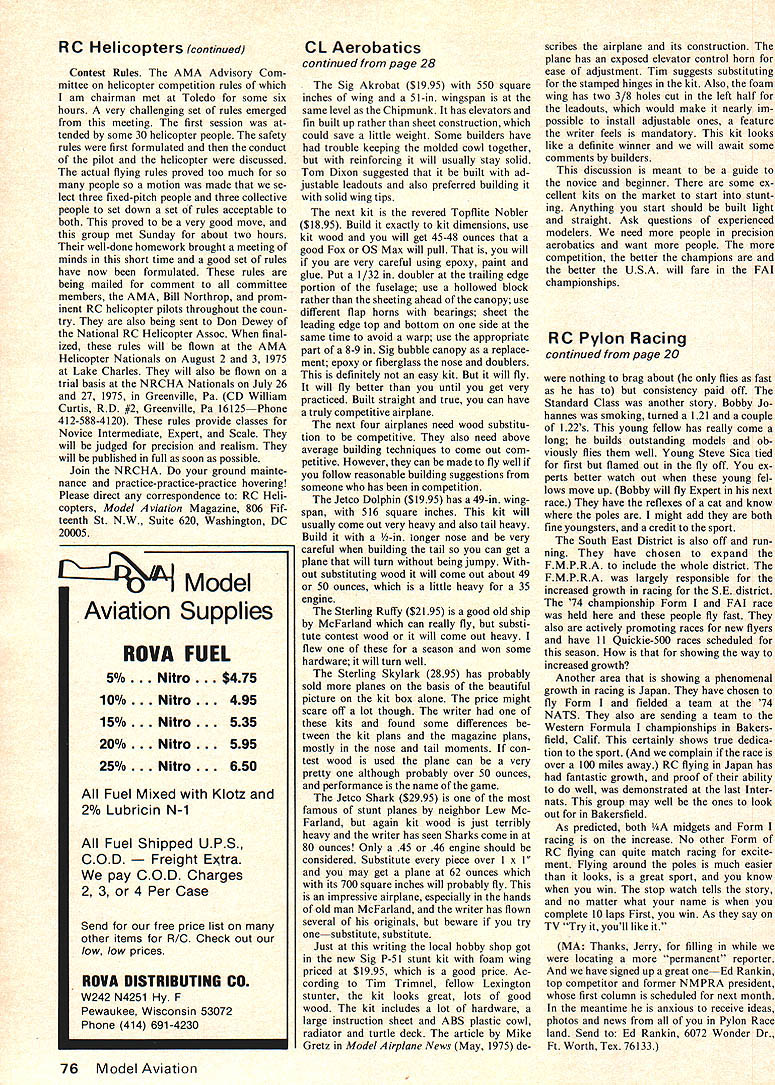 Control Line Aerobatics Wynn Paul SO YOU WANT get Stunt So times hear words What should get stunt contemplating stunt certain way go before selecting kit writer will present some ideas get started entirely possible use commercial kits finish high Nationals requires some careful selec tion some long nights building first thing use profile kit learn basics pattern before going built up model possible build two three pro files same engine mounting can fly repairing another favorite profile other people may prefer something dif ferent Midwest Magician 35 $1595 48-in wingspan probably best around kit beginning stunt Build flaps certain sand wing spar will weaken wing substitute 1/16 thicker stabilizer elevator assembly big improvement would mount engine up right tank middle fuselage Upright engines run better dont cut out have less vibration plane capable winning contests built straight light second choice profile Sig Ban shee $12 95 49-in wingspan flaps Navy Carrier Richard L Perry WAS quite pleased Carl Wheeley asked write column Navy Carrier events have little publicity past few years am hoping column can provide focal point Carrier activities valuable forum exchange ideas information like think CL modelers Carrier flyersthose actively participate event havent yet tried hope provide good reading both en courage havent yets come aboard find Out what have miss ing Future columns will contain some contest re sults details equipment used winning flyers across country design philosophy construction methods information full-scale carrier aircraft sources equipment information have questions about phase Carrier flying need formation about particular aircraft let know am certain someone among modelers read column will have necessary information column succeed will support Carrier modelers ideas welcomed encouraged AMA will pay five dollars ideas photographs used column submitting photographs please send black-and-white glossy prints pref erably 5 x 7 size larger Send conBob Emmett designed Miss Chev white gold black trim Great wind flyer Has McCoy 40 spans 56 in. 50 long Third choice Midwest profile series P-SI favorite although P-63 ME-109 good profiles will fly lot better engine mounted upright Ringmasters have always popular As learners airplane tried true Ringmaster Profile $1195 good solid plane learn inverted flight inside outside loops squares Presently about eight built up stunt airplanes market can built competitive flying will come out little heavy dont substitute contest balsa writer will review according personal rating no intention criti cism toward manufacturers its just some kits lacking top-level competition charac teristics tributions comments questions meat 5016 Angelita Ave Dayton Ohio 45424 NATS Carrier events NATS year will changed slightly past years age groups will combined Class Class II expected after extremely poor attendance junior se nior age categories last year contestant poor participation representative interest Carrier events exists areas primary cause poor attendance Carrier events has location Nats Lake Charles anything hotbed Carrier activity nearest concentration contestants some 600 miles away hope Sig Super Chipmunk $1995 really competitive machine wood excellent 53 wingspan has enough square inches job can come out weighing 48 ounces competitive Several flyers have stated Chips come out nose heavy would prefer coming out tail heavy Tom Dixon Atlanta Ga suggests tail moment should lengthened ch sub stitution made 3/8 stabilizer ele vators good 35 engine plane can flown well enough win anything Gerry Solo mon Cincinnati used strictly stock Chip munk kit 1972 place 8th Nationals used 46 power because excess weight picked up good finish continued page 76 picture will brighter year want can encourage good turn-out Carrier need keep up good level par ticipation Carrier expect have events returned full status NATS move convenient location flying Carrier various parts coun try have noticed differences models equip ment techniques NATS provides excellent opportunity see what happening other areas Ill hope see Rules numerous Carrier proposals before Control Line Contest Board time read CLCB will have decided proposals will final ballot September havent voiced opinion rules yet now time hope will last NATS under existing Profile Carrier engine rules reason now have rule modelers dissatisfied CLCB members received almost no input Carrier modelers districts 1973 very little Carrier experience CLCB no participation part model ers chances making decision re flected desires modelers small Navy Carrier Advisory Committee NCAC formed certain CLCB would have benefit some inputs Carrier matters future NCAC has representatives across country NCAC hopes its opinions representative feelings majority us Carrier modelers CLCB members best source information about modelers district modelers themselves continued page 78 28 Model Aviation US NAVY MARKINGS WING 1917 1919-19421918 RUDDER 11111 REDEli WWITEBLUE R C Helicopters continued Contest Rules AMA Advisory Com mittee helicopter competition rules am chairman met Toledo some six hours very challenging set rules emerged meeting first session tended some 30 helicopter people safety rules first formulated conduct pilot helicopter discussed actual flying rules proved too much people motion made se lect three fixed-pitch people three collective people set down set rules acceptable both proved very good move group met Sunday about two hours well-done homework brought meeting minds short time good set rules have now formulated rules being mailed comment committee members AMA Bill Northrop prom inent RC helicopter pilots throughout coun try also being sent Don Dewey National RC Helicopter Assoc final ized rules will flown AMA Helicopter Nationals August 2 3 1975 Lake Charles will also flown trial basis NRCHA Nationals July 26 27 1975 Greenville Pa CD William Curtis RD #2 Greenville Pa 16125Phone 412-588-4120 rules provide classes Novice Inte