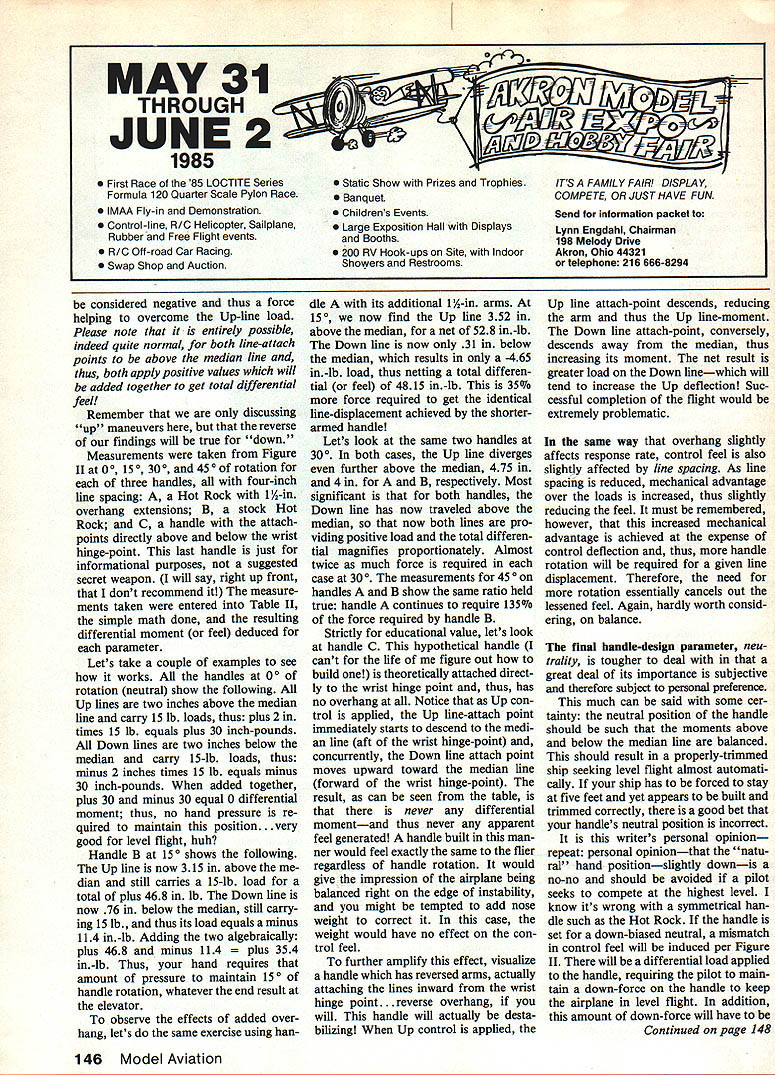 Control Line r Aerobatics Ted Fancher LAST MONTHS discussion devoted lowly control handle strictly mechanical examination control response rate did necessarily repre sent what feel handle better understand much work have put flying beast have check out handles overhang its affects control feel Just make sure keep things straight lets repeat definition overhang distance wrist hinge-point outermost point control handle leadout wires emerge confinement han dle structure have assumed distance wrist hinge-point front handle grip 3 Both Figure II Table II derived reasonably-accurate full-scale drawings rather being done mathe matically three control handles studied respective overhangs could derived measuring distance front handle grip lineattach points adding value 34 used grip-to-wrist-hingepoint distance couple other items should men tioned too Although relatively minor overhang handle has impact line displacement therefore con trol sensitivity measurements taken control feel table Table II found overhang decreased line displacement given handle rota tion increased 300 handle rotation four-inch spacing additional line displacement measured between longest overhang experimental zero-overhang handle big deal sensitive control system can certainly felt Continued Page 145 WRI V Ted continues discussing tne sectors wnicn enter now control hanais feeis fly Stunter Last month discussed effects line spacing time heii taik about effects overhang Theres might think up M X 0 5 0 9 475 169 4575 465 ± 14 number years ago Ai Rabe popuiarlzed seml-scaie type Stunter beautifui Bearcat LTed believes its Jim Lynchs typifies concept PAM PAs 1984 presIdent Denny Adamisin has dveioping iong-winged Eoiipse design R sey erai years two shades blue plus white What looks like dark paint stripe edges shadow caused flash 70 Model Aviation U J LINE_ LB 15 ilor actually son ecial leave Navy enable sposition household items operty itself just sold Fur ermore young man intended ss some 20-odd antique engines sorted modeling paraphernalia ash can very next morning want immediate solution Obviously ir man Robert offered fellow pedient alternative cleanup oblem Supposedly brothers owned casting business back Forties id being interested Control Line eed performed some hop-up exper ients various engines such cx riment apparently special rearurn-rotor downdraft-venturi arrange ent wild exhaust extension e Brown Jr shown photo b found engine finished Lrts another set unfin ied castings among other engines id accessories also numer sketches plans CL Speed odels drawn back sllpaper evidence brothers 4 quite successful extruding ry commendable 105 mph out Hornet iwered models 1945-46 era What really amazing though fact th brothers deaf mutes Since ither could hear would determine ak engine rpm settings placing nds model assessing engine ms models vibrations Unfortunately both brothers now ceased what amazing tales gine collectors can relateand love ery Thanks again Bob LM Champs date change 1985 t report stated 1985 Medera Champs would held June -20 time bonafide tes However Jack Jella SAM Champs tnager has since announced tes have now moved June 24-27 request Eastern Midstern modelers could accom date earlier schedule money rather lean toward ving dates further nmerto point returning vious schedule mid- late-July yway parts June simply too ly flying season expect peak rnpetition levels both engines dels after long winters layoff Most having similar climate have portunity stage maybe Timer contests point ng contest-ready SAM amps fleet mid-June exceptionaccomplishment say least [t understanding idea ving dates forward calendar s proposed possible remedy ape heat warmer climes Per ially think would prefer take inces heat rather models Signal Guard blocks random noise oft-frequency signals can cause loss control air land RC models Signal Guard responds sig nals its own precisely tuned fre quency ignoring static noise craft itself Plus additional amplification allows control operators visual limit want spend time flying less time money repairing crashed model Signal Guard answer Call toll-free 1-800-468-8215 order Signal Guard TM major credit card send $150 check money order m 1 riFTllSFF PO Box 30179 Portland OR 97230 Oregon call collect 503-257-0912 90 day warranW cted dealershIps avaIlable out trim engines wont start what know Im managementI just work here. See ya downwind Harry Murphy 3824 Oakwood Blvd Anderson IN 46011 CL Aerobatics/Fancher Continued page 70 understand affect overhang control feel necessary understand feel handle made up inputs both Up Down lines input line made up two elements actual tensionwhich have arbitrarily stated 15 lb per lineand vertical distance point tension force applied wrist hinge-point case will measure tension pounds distance components inches resulting moment being expressed inch-pounds Take look Figure II will notice horizontal line running wrist hinge-point horizontally through center handle large Plus above large Minus below median line distance measurement will taken Any lineattach point falling above line will considered positive value thus force overcome up maneuvers Any line-attach point below line will March 1985 145 MAY 31 THROUGH JUNE2DAO 1985 First Race 85 LOCTITE Series Formula 120 Quarter Scale Pylon Race IMAA Fly-in Demonstration Control-line RIG Helicopter Sailplane Rubber Free Flight events R/G Off-road Car Racing Swap Shop Auction Static Show Prizes Trophies Banquet Childrens Events Large Exposition Hall Displays Booths 200 RV Hook-ups Site Indoor Showers Restrooms ITS FAMILY FAIR DISPLAY COMPETE OR JUST HAVE FUN Send information packet Lynn Engdahl Chairman 198 Melody Drive Akron Ohio 44321 telephone 216 666-8294 considered negative thus force helping overcome Up-line load Please note entirely possible indeed quite normal both line-attach points above median line thus both apply positive values will added together get total differential feel Remember discussing up maneuvers re