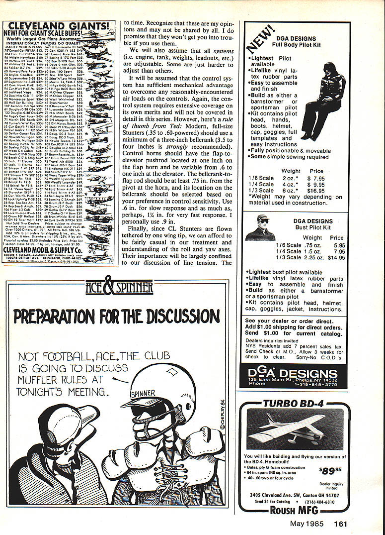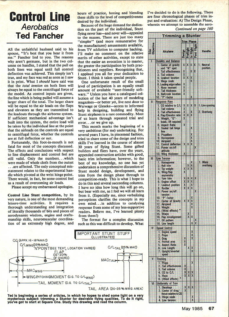 Control Line Aerobatics Ted Fancher AS unfaithful husband said spouse Its best hear Fancher lied reasons arent germane two col umns handles stated pull both lines equal until full control deflection achieved simply isnt true face red soon saw print What should have said total tension both lines will always equal centrifugal force model As control inputs given line being pulled will assume larger share total larger share will equal alr loads flaps elevators transmitted leadouts through alrborne system sufficient mechanical advantage isnt built system entire load will taken individual line point airloads controls equal centrifugal force whether controls full deflection Fortunately foot-in-mouth fatal concepts discussed effects conclusions respect line displacement control feel still valid Only numbers. made whole cloth outset affected conceptual mis statement relates experimental han dle pivoted wrist hinge point would fact some control feel result overcoming air loads Please accept embarrassed apologies Control Line Stunt competition its very nature demanding leisure-time activities requires thorough understanding integration literally thousands bits pieces aerodynamic wisdom engine crafts manship skills neuromuscular coordina tion extremely high degree hours practice honing blending skills level competitiveness desired individual Because huge demand dedica tion part individual Stunt flying never hasand never willappealed masses just too simpler remunerative manufacturer amusements available TV addiction computer hacking Ill make no comment relative merits other activities except state easier avocation master greater participation both prac titioners suppliers Recognizing applaud dedication Stunt think takes special people unfortunate result small level participation equally small amount available user-friendly soft ware Unless have catalogued col lection last 40 years modeling magazinesor better yet live next door Werwage Giesekeaccess informed help designing building flying Stunt airplanes rare commodity Most us learn through repeated trial error. up month marks beginning very ambitious undertaking several years have piecemeal fashion tried share some design trim skills Ive learned course almost 30 years flying Stunt Some gifted builders fliers have over years appended construction articles good basic trim information however best knowledge no has yet undertaken comprehensive discussion Stunt model design development trim design phase through competition-ready what hope several succeeding columns have no idea long will go bear feel will learn Especially since verbalizing perceptions clarifies concepts own mind ition catalyzing response some less-supportive readers Believe Ive learned plenty format complex discussion such difficult develop What MPORTANT STUNT STUFF IILLUSTRATED CG APPX 16- 18%MAC C/LWINGSS% MAO NPOINTSEE TEXT LOCATION VARIES C/LTAILZS% MAO FLAP 15-20%V OFOHORODMACTAIL MACWING ING&ITCHIN1MCMENT CG TO C/LWING TAIL MOMENT COG TO O/LTAIL TAIL AREA 20-25%WING AREA May1985 67 Ive decided following four chronological phases trim put evaluation Design Phase wherein attempt assemble aero ContinuedL 160 Ted beginning series articles hopes shed some light very mysterious subect trimming Stunter desirabie fiying quaiities right youve got start Square Study drawing read column leading trailing edges does include area chines As turned out Paul did fly GEMChineEquipped Modelat WC plans develop idea Reports full Goulburn FE Sympos ium Report 29-page document including new wind-tunnel tests Stuttgart Martin Simons Power Model Trim Stan Hines Lost Wax Engine Casting Dave Sugden available New South Wales FF Society have left FE Champs Planbook 162 pages competitors biographical technical philosophical details together threeview plans also excellent purchase $1000 plus postage NSW FF So ciety Committe 50 Brown St St Peters NSW 2044 Australia responding advertisers mention read about Model Aviation CL Aerobatics/Fancher Continued page 67 dynamic components vehicle hope will fly manner desired B Preflight Phasewhat Large James Greenaway termed bench-trimming love letter published Stunt News wherein assembled airplane configured design parameters ie balance etc C Flying Phase wherein empirically evaluate suc cess earlier two phases make appropriate adjustments necessary D Post-Flight Phase wherein evalu ate subjective objective evidence planes performance Throughout four trim phases attempt optimize six major trim objec tives Stabilitydoes go its pointed constant attention does exit corners hard flat II Response ratedoes turn readily controllably III Line Tensionwhat causes good/bad line tension what about IV Speed Control too fast too slow adjust V Trackingdoes fly consecutive maneuvers concentrically does wander fix VI Turn equalitydoes turn equally both inside outside four phases trim six trim objectives plotted accompany ing table Beside objective variety design parameters inflight factors have effect partic ular objective listed approxi mately descending order influence phase trim parameter con sidered marked X exam ple Stability objective leadout location element Phases B C whereas sealing flap hinge line strictly flying trim consideration C Note addition table brok en down happy airplane side happy pilot side very important realize stated earlier columns handles handle interface between airplane pilot means whereby make properlytrimmed aircraft compatible differ ent pilots often difficult make distinction should kept constantly mind handle should nt adjusted camouflage what aircraft deficiency except last resort discussion will concentrate happy-airplane side comments happy pilot absolutely necessary Next month will start Phase Design Trim address parameters six Trim Objectives Subsequent columns will same succeeding phase few final comments order what assumptions have made plus few definitions terms First no attempt will made quan tify parameter will discussing concepts principles gene