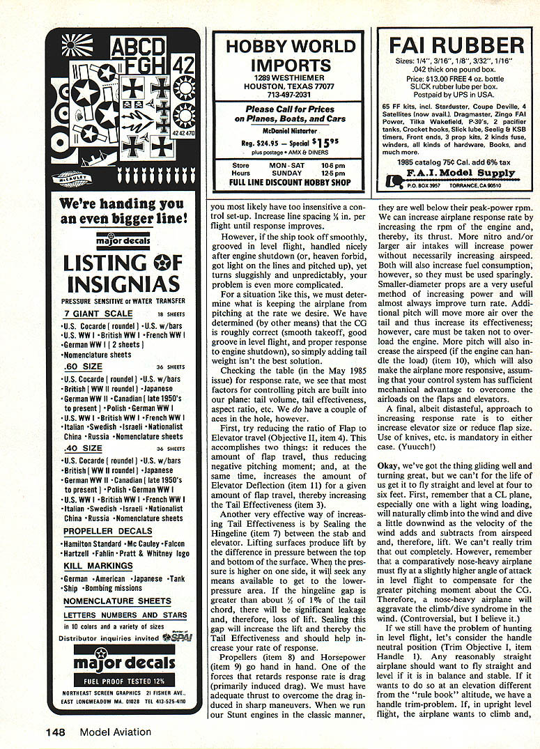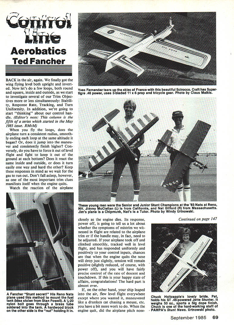 Aerobatics Ted Fancher BACK air again finally got wing flying level both upright invert ed Now lets few loops both round square inside outside start investigate several Trim Objec tives less simultaneously Stabili ty Response Rate Tracking Turn Uniformity addition going start thinking about control han dle Editors note column fifth series started May 1985 issue RMcM fly loops does airplane turn consistent radius smooth ly ending ioop same altitude began does jump maneu ver consistently finish higher Con versely have force out level flight fight keep out ground bottom Does react same inside outside does turn easily way hard other Keep responses mind wait gas run out Dont fall asleep however important trim clues manifests itself engine quits Watch reaction airplane closely engine dies Its response power off going tell us lot about whether symptoms mistrim wit nessed flight related airplane trim handle may fact need adjusted airplane took off climbed smoothly tracked well level flight has responded uniformly positively control inputs chances engine quits nose will drop just slightly tension will remain positive slightly reduced course power off will have fairly precise control rate descent touchdown happy state affairs congratulations hard part almost over other hand ship leaped air flew level flight everywhere except wanted maneuvered like drunken cat chasing mouse etc have bit work engine quit did airplane pitch noseSeptember 1985 69 Yves Fernandez tears up skies France beautiful Scirocco Craft has Super tigre 46 power uses 3-biaded 11 x 6 prop tricycle gear Photo Claus Maikis young men Senior Junior Stunt Champions 83 Nats Reno NV Jimmy IdoClellan L California Nat Gifford R Massachusetts Jims plane Chipmunk Nats Tutor Photo Windy Urtnowski Continued page 147 Fancher Stunt secretl Reno Nats plane used method mount fuel tank idea stolen Stan Powell 1120 nylon bolt goes through brass tube soldered tank hardwood block other side nut holding Chuck Holtzappies lovely bride Pat holds ST 46-powered Jette Stunter weighs 50 oz sports Sig dope finish Chuck hard-working staff PAMPAs Stunt News Urtnowski photo detail addition aircraft display Hangars Three Four museum has library facility located second floor Old Firehouse Bldg can used modelers research pur poses daily 900 am 430 pm Copies data found can made nominal cost Please note library cannot research mail due limited staff research must done premises have specific questions about use either museum library William Kaiser curator secretary Jenrue Satora can reached 516 222-1190 during library hours listed above visit museum use library free would sug gest small donation services offered way funds obtained museum materials re quired continue restoration work Hints workshop Bob Furr Orbiting Eagles Omaha NE says having trouble using cyano acrylates super glues idea makes using Elmers Titebond glues balsa sheeting almost easy using super glues heat-shrink iron turned near its highest setting will set either glues seconds Just hold sheet ing flat hand go over area glue applied very slowly iron irons heat accel erates glues setting action Send CL Scale items building tips photos Bill Boss 77-06 269th St New Hyde Park NY 11040 CL Aerobatics/Fancher Continued page 69 up Did line tension nearly disappear Did landing spot just appear rather being selected case have tail-heavy airplane dont care CG exactly Fancher told put Add nose weight till dont no ... airplane flew much same previous example engine WEEE EU EKE U U U U U U U U U U U U U U U I U U U U U U U U U U U I I I EEEEEEu.. SIG CHAMPION FUEL FREIGHT ICOLLECTfl PINTI55GALDRUMj ID~ U $31U 10%$395I$29500 15%$41559OOU THE CHOICE OF CHAMPION FLYEIS Dont misled price alone model fuels same Some cut-rate mail order fuel outlets selling 10% fuel really contains about 8% nitro skimp costly nitro formulating fuel weight basis rather thaI traditional percent-of-volume method Also some mail order fuelsare blendedwith aslittleas 15% totaloil ThatsOKif yougeta perfect needlesettingeverytimebut otherwise lean run can easily ruin engine Cuts quality like make easy blend com petitively priced fuel really getting quality want over 20 years SIG has blending fuel finest quality ingredients available alcohol 995% pure very best grade available nitro use 100% pure get honest portion based % volume maximum lubrication get perfect 50/50 blend Bakers AA Castor Oil Klotz Techniplate Racing Oil protect expensive engines finest quality fuel can made price Dont take word try some ludge yourself U U U U U U See dealer first available order direct Call U 800 247 5008 toll free orders Catalog 47 $300 SIG MANUFACTURING CO Montezuma IA 50171 •Pmbrtnhaeeithustmtm E.EEE.EE... quit nose did pitch up line tension did decrease control glide jerky unsmooth control system likely too sensitive add weight nose Reduce line spacing handle depend ing severity problem Reduc ing spacing little noticeable early coarse ad justment would go no less time point move both lines equal amount may yet have bias line spacing nowhere near ready quit trimming airplane yet Finally ship pulled air grooved smoothly level flight responded slowly control inputs FREE SHIPPING ON ORDERS OVER $1000 % ITRO 5% 10% 15% 25% 35%$550 QUARTGALLON El 4-STROKE FUE $1350 $1550 NEW SIG $525 $595 U U U U I U U U U U m U U U U U U showed almost no interest cornered maneuvers problem bit complex upon engine flameout airplane noticeably drops nose must react fairly quickly pull up smooth glide line tension remains good can whip readily extend glide airplane almost certainly nose-heavy appropriate adjust ments should made Things try clude lighter muffler lighter spinner etc oras last resortadd weight tail until response rate correct preceding Case fits observed performanceexcept glide smooth controllable no abrupt tendency drop nose engine quits aVO th8ticdtr taG Ls rante Ignition Engine Parts Only have parts inventory prompt delivery Over 235 items Send $200 current catalog 