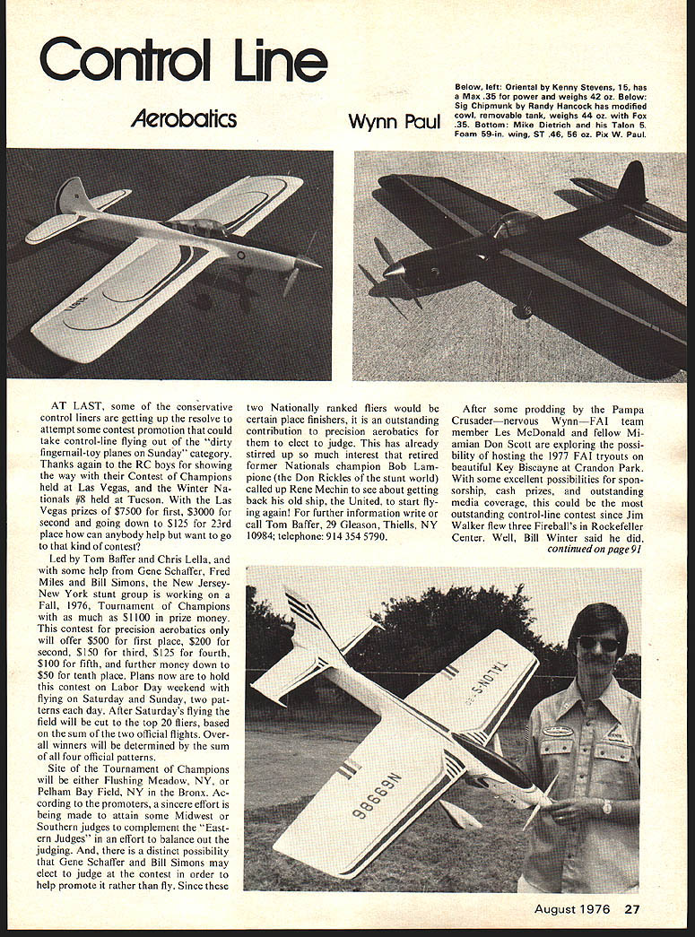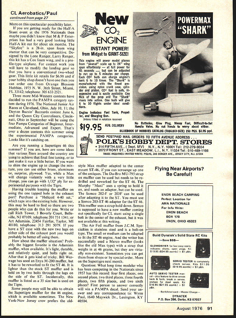 Control Line Aerobatks AT LAST some conservative control liners getting up resolve attempt some contest promotion could take control-line flying out dirty fingernail-toy planes Sunday category Thanks again RC boys showing way Contest Champions held Las Vegas Winter Na tionals #8 held Tucson Las Vegas prizes $7500 first $3000 second going down $125 23rd place can anybody help want go kind contest Led Tom Baffer Chris Lella some help Gene Schaffer Fred Miles Bill Simons New JerseyNew York stunt group working Fall 1976 Tournament Champions much $1100 prize money contest precision aerobatics will offer $500 first place $200 second $150 third $125 fourth $100 fifth further money down $50 tenth place Plans now hold contest Labor Day weekend flying Saturday Sunday two pat terns day After Saturdays flying field will cut top 20 fliers based sum two official flights Over winners will determined sum four official patterns Site Tournament Champions will either Flushing Meadow NY Pelham Bay Field NY Bronx Ac cording promoters sincere effort being made attain some Midwest Southern judges complement East ern Judges effort balance out judging distinct possibility Gene Schaffer Bill Simons may elect judge contest order help promote rather fly Since Wynn Paul two Nationally ranked fliers would certain place finishers outstanding contribution precision aerobatics elect judge has already stirred up much interest retired former Nationals champion Bob Lam pione Don Rickles stunt world called up Rene Mechin see about getting back old ship United start fly ing again further information write call Tom Baffer 29 Gleason Thiells NY 10984 telephone 914 354 5790 Below left Oriental Kenny Stevens 15 has Max 35 power weighs 42 oz Below Sig Chipmunk Randy Hancock has modified cowl removable tank weighs 44 oz Fox 35 Bottom Mike Dietrich Talon 5 Foam 59-in wing ST 46 56 oz Pix W Paul After some prodding Pampa Crusadernervous WynnFAI team member Les McDonald fellow Mi amian Don Scott exploring possi bility hosting 1977 FAI tryouts beautiful Key Biscayne Crandon Park some excellent possibilities spon sorship cash prizes outstanding media coverage could outstanding control-line contest since Jim Walker flew three Fireballs Rockefeller Center Well Bill Winter said did continued page 91 August1976 27 CL Aerobatics/Paul continued page 27 spectacular possibility later getting ready Half-A Stunt event 1976 Nationals maybe didnt know M & P Enter prises has very good looking little Half-A kit out about six months Skyfire 28-in span foam wing stunter can very competitive De signed Lone Ranger Larry Renger kit has Cox foam wing pro file-type airplane contest work will have modify landing gear have conventional two-wheel gear little kit retails $698 hobby shop doesnt have can order Orange Blossom Hobbies 1975 N W 36th Street Miami FL 33142 telephone 305 633 2521 Three Mid-Western contests have decided run PAMPA category sys tem during 1976 National Junior Air Races Cleveland Ohio July 10 II Dayton Buzzin Buzzards contest June 6 Queen City Controliners Cincin nati Ohio September will using four Pampa Categories Beginner Inter mediate Advanced Expert Thats over dozen contests summer using experimental PAMPA categories Looks like its catching Are running Supertigre 46 summer some ideas various fliers around country using achieve final fine tuning just make run little better want shim engine up change mix ture can use either brass aluminum surprise plywood Yes Max will change violently very little change can go 1/32 ply ex perimental purposes Tigre Having trouble keeping muffler using tapped hole exhaust port Purchase Helicoil 4-40 set taps existing hole However may hard find two people can Write call Rich Tower 3 Beverly Court Belle ville NJ 07109 telephone 201 751 1341 Art Adamisin 22454 Fairfax Taylor MI 48180 telephone 313 291 5079 have ST case new two lugs either side exhaust port would probably better off using about muffler situation Prob ably biggest favorite Adamisin muffler available Its light durable relatively quiet bolts right After gets kind tricky Bill Wer wage has used Enya M-200 muffler has reworked fit ST 46 lighter stock ST muffler held two bolts through lugs side ST Incidentally muffler listed 35 size used Tigre Some people may still able obtain Supertigre muffler 46 engine available sometimes New York-New Jersey crew prefers oldCo2 INSTANT POWER Midget GIANT-SIZE rhis engine will power model planes peanut scale up 24 wing span effortlessly power 45 seconds adjusted run up 5 minutes per charge I02 bulb can charge engines tank 6 10 times Shark manufactured finest pre cision using nylon crank case cylin der piston 3132 fuel safe expensive easily available flick prop Shark roars action bulb will give 6 10 flights under ideal condi tions Engine Includes Fuel Tank Propel ler Charging Gun Orders filled rotation received No Batteries Glow Plug Messy Fuel Difficult-to-Set $1995 AUG DELIVERY Needle Valve No cut hands worry about either BLUEBOOK OF HOBBIES CATALOG TABLOID-SIZE 150 PGS $395 ppd SEND POSTPAID MAIL ORDERS TO FIFTH AVENUE ADDRESS POLKS HOBBY DEPT STORES 314 FIFTH AVE MV NY N V 10001 Tel 212-279-9034 2072 FRONT ST EAST MEADOW LI NV 11554 Tel 516-489-1166 TRADE INQUIRIES INVITED WRITE POIKS 346 BERGEN AVE JERSEY CITY NJ 07304 style Max muffler adapted center mount ST-46 can scrounge up antiques Du-Bro MU-795 strap muffler can used needs re drilled reworked ST 46 Murphy Maxi uses spring hold needs adapter can used Semco 202-F 203F can used after adapting ST must use Semco 203-ET 46 adapter ST 46 muffler uses strap hold down Semco supposed have new muffler coming out specifically CL stunt using single bolt center exhaust available writing Air Foil muffler JCM Spe cialties stainless steel bolt-on type small medium can adapted fit ST 46 engine writer has successfully used Merco muffler looks like old Max type strap weighs 46 grams virtu ally non-existent Sometimes can get shops special order Supertigre next month Questio