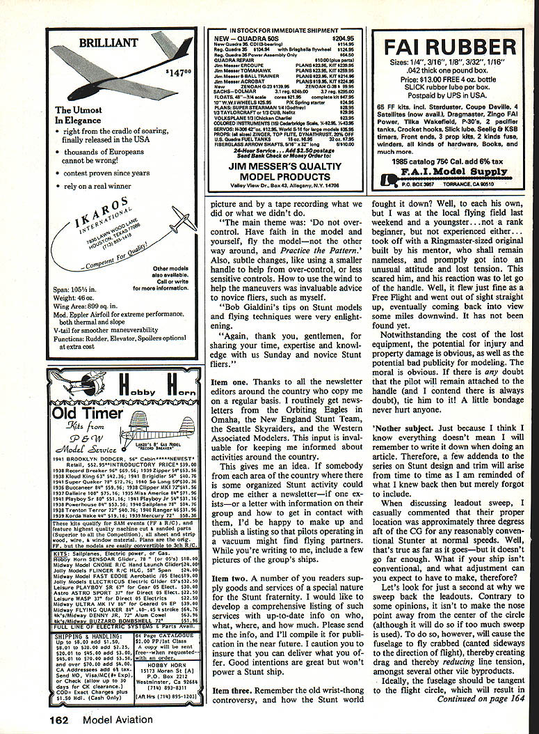 H Aerobatics Ted Fancher WELL Stunt fans now should have written feelings Appearance Points Builder Model Rule Skill Classes Nats havent done stop reading now Next month promised Im going expound length opin ions hope will contribute material following column March Its event lets hear month intend comment variety subjects None length no particular order just grist old thought processes received following letter Art Weber out Brookfield Wisconsin has some provocative points make rela tive broadening exposure public value experienced skilled fliers sharing time talents benefit event offer out further comment except personal Thank Art Archie Bill Bob Circle Masters Flying Club held Control Line Stunt Seminar targeted beginner novice Control Line Stunt modeler Jim Krueger organized semi nar approached invited ex perts deserves thanks recognition efforts making success ful two days seminar held Saturday June 15 Sunday June 16 1985 Milwaukee County Flying SiteDretzka Park Milwaukee WI Present Art Adamison son Archie Bill Zimmer came Milwaukee own expense Bob Gialdini lives Milwaukee area four gentlemen spent two days us sharing knowledge expertise time behalf Circle Masters Flying Club novice Stunt fliersthank personally learned two days learned last six years Because being public flying site non-AMA modelers pres ent talking modelers explaining what AMA club about surprising find out little general public knows about AMAand reason spectators express surprise Control Line flying still exists thought everything now radio controlled because expense volved phase hobby either able return modeling interested doing know because club involved kinds activities demonstrations try promote Control Line fly ing mall shows conjunction RC clubs Boy Scout demonstrations miscellaneous other opportunities perfect example non-support Control Line flying AMA booth another Circle Master member displayed models put limited flying demonstration single photo Control Line model No wonder people out think Control Line flying no longer exists Also try purchase Con trol Line kit hobby shop find some advertised cant sell what dont have advertise Continued page 160 Frances Yves Fernandez built magnificent Mikado 1designed Marc Lavalatte Marco 49 powers Photo Malkis Justin Spahr Rthe 1984 Junior Nats champwas 2nd 1985 Heres new OS 35powerad Stunter Pic Windy Urtnowski Eric Janneen tried Suite 45 fourstroker new Stunter 1 probiems liked wiii change two stroke Prop Graupner 3biade Note custom venturi ada p tar Photo Claus Maikis Bob Whlteiy some wins 84 twinMax 35powared Stunter first place Southwest Reglonais third California NS Championships Bob Eiiis photo 72 Model Aviation light bulbs top box sure bulbs touch box would afire hazard Attach apiece clear plastic opening front box use four five large thumbtacks hold place Place humidity gauge inside can buy about $300 hardware store Turn lights drop plastic over front half-hour humidity will down around 20% 30% 900 1000 temperature Place part covered condenser paper box half-hour remove excess moisture ready covering raise plastic about half way can get inside work used thinned Micro-X condenser paper cement adhere covering works great condenser paper plastic film remove covered part high temperature low humidity box condenser paper will get limp Since will seldom fly humidity less 20% 30% temperature exceeding 900 1000 model should never warp cause condenser paper shrinkage parts finished time final assembly Glue tissue wing sock ets onto fuselage put wing posts sockets Glue wing wing posts Offset wing left center looking rear modelwhich makes wing panel longer inside left-hand circle Glue stabilizer fuselage mak ing sure trailing edge higher leading edge Glue rudder et turn Glue subrudder center Glue /n-in shim right side fuselage nose get left thrust Glue tissue landing gear sockets fuselage youre ready Test flying Start out using 25-in loop 085 rubber rubber use obtained FM Model Supply Put about 50 turns motor launch model hand should fly left circles 2530-ft diameter As add turns rubber torque will have put about in left wing panel Also use about washin left side stab best results trim model fly just edge stall full-power takeoffs center gravity CG should rearward model will take still have stable ffight adjust CG put dab clay back fuselage much duration get will depend upon familiar become model experimentation wrn soon find combination prop rubber will bejust right model Suppliers Indoor models Jim Jones 36631 Ledgestone Mt Clemens MI 48043 Indoor Model Supply PO Box 39 Garberville CA 95440 Micro-X Products Inc PO Box 1063 Lorain OH 44055 Ray Harlan 15 Happy Hollow Rd Wayland MA 01778 will glad answer other ques tions might have Send stamped pre addressed envelope Walter P Van Gorder 5669 Victoryview Lii Cincinnati OH 45238 call 513 922-3351 CL Aerobatics/Fancher Continued page 72 two-day seminar attended 20 30 fliers per day futile flying ef forts speaking myself observed Big Art Archie Adamison Bill Zimmer Bob Gialdini Art set pattern after attempt finished shown Continued page 162 Twowipe n sjroovy easy-flying By-plane can fin ished semi-scale sport e end ply construction 70 top wing 60 bottom Direct Sales Wing Area 1250 eq In Only Power 75 124 2 cycleSend $1 Catalog Weight9tol0lbs 216484-6810 1728 Dywoed SE Canton OH 44707 ROUSH MFG 160 Model Aviation Two Ugly Stick Bipe umers Guide Radio Control Products THIRD EDITION ished Oct 11985 Its Listed Need See hobby shop order dfrect $075 Price $795 plus $180 UPS total ign air mail *1345 $795 plus *5501 US dollars pleese Send Check MO Credit Card info Consumers Guide 150 Ott St Hurrisonhurg VA 22801 434-0350 Name ____________________________________________ Address Charge Card No MC VISA CHOICE _____________________________________ MasterCard lB # ______________________ Expiration Date ___________________________ Signed BObbY H0~ Old Timer _ Llkifzom ~A40d1 SLLUiCZ 5EC0O SR6AKER 1941 BROOKLYN DODGER 56 Cabin "NEWEST Re