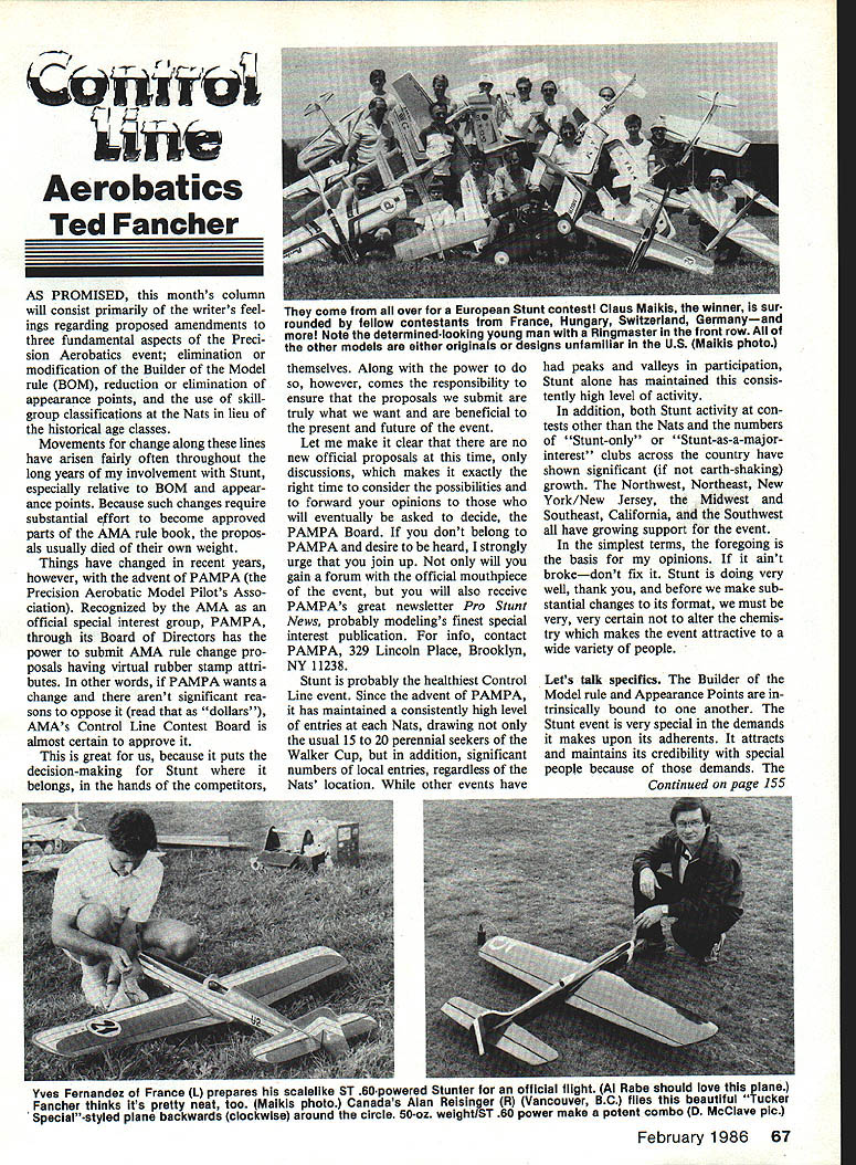 H iiiii Aerobatics Ted Fancher AS PROMISED months column will consist primarily writers feel ings regarding proposed amendments three fundamental aspects Preci sion Aerobatics event elimination modification Builder Model rule BOM reduction elimination appearance points use skillgroup classifications Nats lieu historical age classes Movements change along lines have arisen fairly often throughout long years involvement Stunt especially relative BOM appear ance points Because such changes require substantial eKfort become approved parts AMA rule book propos als usually died own weight Things have changed recent years however advent PAMPA Precision Aerobatic Model Pilots Asso ciation Recognized AMA official special interest group PAMPA through its Board Directors has power submit AMA rule change pro posals having virtual rubber stamp attri butes other words PAMPA wants change arent significant rea sons oppose read dollars AMAs Control Line Contest Board almost certain approve great us because puts decision-making Stunt belongs hands competitors themselves Along power however comes responsibility ensure proposals submit truly what want beneficial present future event Let make clear no new official proposals time discussions makes exactly right time consider possibilities forward opinions will eventually asked decide PAMPA Board dont belong PAMPA desire heard strongly urge join up will gain forum official mouthpiece event will also receive PAMPAs great newsletter Pro Stunt News probably modelings finest special interest publication info contact PAMPA 329 Lincoln Place Brooklyn NY 11238 Stunt probably healthiest Control Line event Since advent PAMPA has maintained consistently high level entries Nats drawing usual 15 20 perennial seekers Walker Cup addition significant numbers local entries regardless Nats location other events have peaks valleys participation Stunt alone has maintained consis tently high level activity addition both Stunt activity con tests other Nats numbers Stunt-only Stunt-as-a-major interest clubs across country have shown significant earth-shaking growth Northwest Northeast New York/New Jersey Midwest Southeast California Southwest have growing support event simplest terms foregoing basis opinions aint brokedont fix Stunt doing very well thank before make sub stantial changes its format must very very certain alter chemis try makes event attractive wide variety people Lets talk specifics Builder Model rule Appearance Points trinsically bound another Stunt event very special demands makes upon its adherents attracts maintains its credibility special people because demands Continued page 155 Yves Fernandez France 1 prepares scalelike ST 60-powered Stunter official flight Al Babe should love ruts pianeJ Fancher thinks its pretty neat too Maikis photo Canadas Alan Reisinger R Vancouver BC flies beautiful Tucker Special-styled plane backwards clockwise around circle 50-az weightlST 60 power make potent combo 0 McClave plc February 1986 67 come trom aii over European Stunt contest Claus Maikis winner sur rounded fellow contestants France Hungary Switzerland Germanyand Note determined-looking young man Ringmaster front row other models either originals designs unfamIliar US Maikis photo CL Aerobatics Fancher Continued page 67 successful Stunt pilot must part artist part mechanic part craftsman part scien tist part athlete part con-man fulltime seeker excellence us could make list fliers mostly things pilot list would also have elements other capabilities well Any factors can hook gets set first time individ ual right stuff witnesses good Stunter work Once hooked will use strengths area over come weaknesses others until masters well have Les McDonald artist craftsman mastered rest became legend Al Rabe did same starting scientist list can go point made Dont take away piece piece variety baits attract can simply get possible may~ its too tough can get somebody else build nt it. trim etc Stunt demanding activity will never appeal large audi ence make changes necessary make attractive doubt will like very much am therefore favor retaining BOM rule recognize difficulties knowing sure flier built also recognize man cheats win loses beats However must make exception feel Expert ranks flier should allowed fly airplane didnt build acknowledges fact feits appearance points loss points will generally make expert non-com petitive presence contest will incentive still-advancing fliers asset shouldnt ignored logic extending practice less-skilled classes lies fact flier will substantial disad vantage another equal flying skills allowed compete expertly-built trimmed aircraft As rule building trimming skills advance parallel flying skills Allowing pilot fly plane isnt capable producing him self would equivalent competi tor entering own plane. allowing Jimmy Casale work handle him Taint fair foregoing exception mind favor retention appearance points know know lost contest just last week because appearance points Well too just came fourth California North/South Championship although highest flying points flying beat-up old Imitation gave up eight 10 appearance points three beat also blew Wing Over usual I II I THE RADIO CONTROL BUYERS GUIDE new 9th edition now local hobby shop contains thousands photos product descriptions radio control raft Cars s ems nes ware Accessories s os RCBG single largest source infor mation RIO modeling available Whether youre advanced R/Cer eager novice RCBG will master reference So before plunk down hard earned cash-Look Before Buy available locally may send $995 plus $175 shipping Radio Control Buyers Guide Dept 100 Clifton House Clifton VA 22024 sure indicate street address I II I I I I I I II I I made other assorted mistakes pat ternand judge must have sun eyes made perfect 40 triangles have five excel lent pilots within 10 points other. out 550 plus. takes tremendous ego say appear ance points cost victory way airplanes beat clearly deserved appearance points wou