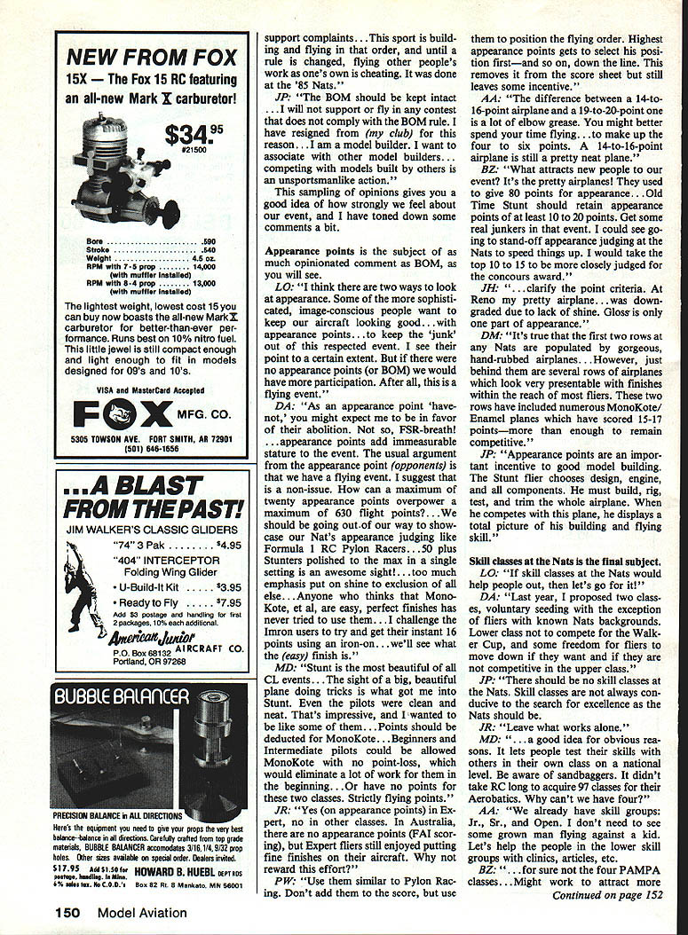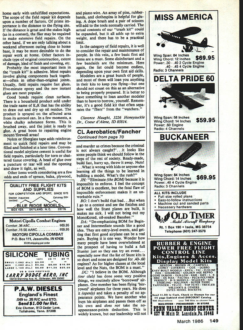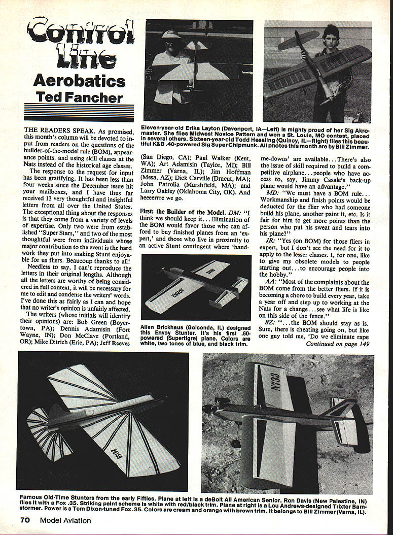 Aerobatics Ted Fancher THE READERS SPEAK As promised months column will devoted put readers questions builder-of-the-model rule BOM appear ance points using skill classes Nats instead historical age classes response request input has gratifying has less four weeks since December issue hit mailboxes have thus far received 13 very thoughtful insightful letters over United States exceptional thing about responses come variety levels expertise Only two estab lished Super Stars two thoughtful individuals major contribution event hard work put making Stunt enjoya ble us fliers Beaucoup thanks Needless say cant reproduce letters original lengths Although letters worthy being consid ered full context will necessary edit condense writers words Ive done fairly can hope no writers opinion unfairly affected writers initials will identify opinions Bob Green Boyer town PA Dennis Adamisin Fort Wayne IN Don McClave Portland OR Mike Ditrich Erie PA Jeff Reeves San Diego CA Paul Walker Kent WA Art Adamisin Taylor MI Bill Zimmer Varna IL Jim Hoffman Mesa AZ Dick Carville Dracut MA John Patrolia Marshfield MA Larry Oakley Oklahoma City OK heeeerrre go First the Builder Model DM think should keep it. Elimination BOM would favor can af ford buy finished planes ex pert live proximity active Stunt contingent hand me-downs available. Theres also issue skill required build com petitive airplane. people have ac cess say Jimmy Casales back-up plane would have advantage MD We must have BOM rule. Workmanship finish points would deducted flier someone build plane another paint etc fair him get points person put sweat tears plane JR Yes BOM fliers expert dont see need apply lesser classes like give obsolete models people starting out.to encourage people hobby AA Most complaints about BOM come better fliers becoming chore build year take year off step up working Nats change. see what life like side fence BZ .. BOM should stay Sure cheating going like guy told eliminate rape Continued page 149 70 Model Aviation Eieven-year-oid Erika Layton Davenport IALeft mighty proud Sig Akro master files Midwest Novice Pattern won St Louis MO contest placed several others Sixteen-year-old Todd Hessling Quincy ILRight flies beau tiful K&B 40-powered Sig SuperChipmunk photos month Blil Zimmer Alien BrIckhaus Goiconda IL designed Envoy Stunter its first 80 powered Supertigre piane Coiore white two tones bius biack trim Famous Oid-Time Stunters eariy Fifties Piane ieft deBoit Au American Senior Ron Davis New Psiestine IN fiies Fox 35 Striking paint scheme white red/black trim Plane right isa Lou Andrews-designed Trixter Barn stormer Power lea Tom Dixon-tuned Fox 35 Colors cream orange brown trim belongs Bill Zimmer Varna iL home early unfulfilled expectations scope field repair kit depends upon number factors prime im portance distance flying site distance great stakes high contest flier may required make extensive field repairs other hand talking about weekend afternoon outing close home base may desirable repair work home Other factors clude type original construction extent damage kind finish covering etc Probably important item crash kit adhesive Most repairs involve gluing components back togeth eroften other-than-original joints Usually field repairs require fast glues Five-minute epoxy new instant glues popular Good bonds require clean surfaces household product sold under trade name K2R has ability draw out dry up oil residue product sprayed affected area its aerosol can few moments white chalky substance forms brushed away joint ready glue great boon repairing engine mount/firewall areas Nylon fiberglass tape adds reinforce ment quick field repairs may filled finished later time Conven tional model airplane cement useful field repairs particularly torn shat tered tissue covering bead glue over puncture tear will seal opening draw tight well Other items worth considering few odds ends spruce balsa plywood Motori Cipolla Combat Engines Combat 36 ABC$6995 Combat 15 SE AANC$5995 MOTORI CIPOLLA COMBAT PO Box 111 Jasonville IN47438 *300 shipping per order piano wire An array pins rubberbands clothespins helpful glu ing dope brush pair scissors will add tools normally carried actual contents crash kit could expanded adds up extra weight has practical limit category field repairs well consider repair maintenance people vein few basic first aid items must Some disinfectant few bandaids minimum again list could become endless depending upon own first aid skills Modelers great bunch people will loan anything kits keep flyingbut should count alternative being properly prepared better have something loan another modeler have borrow yourself Remem ber its good field kit often sepa rates fliers watchers Clarence Haught 3226 Honeysuckle Dr Coeur dAlene ID 83814 CL Aerobatics/Fancher Continued page 70 murder crimes because criminal always caught. looks like some people think should follow steps rest society Ready-made build fast hurry up throw away Nuts . What wrong kids anyone else learning things learned building model Whats rush JH Eliminate BOM because impossible enforce feel concept BOM excellent fatal flaw impossible enforcement makes un workable rule BO dont build bad. go contest see finishes well Stunt planes built makes sick will bring out MonoKoted oil-soaked Banshee DA Dc-emphasizing BOM Begin ner Intermediate sounds like good idea entry-level events get ting first good airplane can real pain Buying way Wonder people have overwhelmed prospect having build full Stunter just can try event. especially now list Stunt kits short designed 40-60 engines As higher classes local level Nats BOM must DC believe BOM Although club has done some very positiye things routinely allow borrowed air planes member has flying bor rowed airplanes three years does openly takes penalty no ap pearance points have another buys airplanes passes off own does take noappearance-points deduction widely known leadership will MISS AMERICA Wing Span 84 Inches Wing Chor