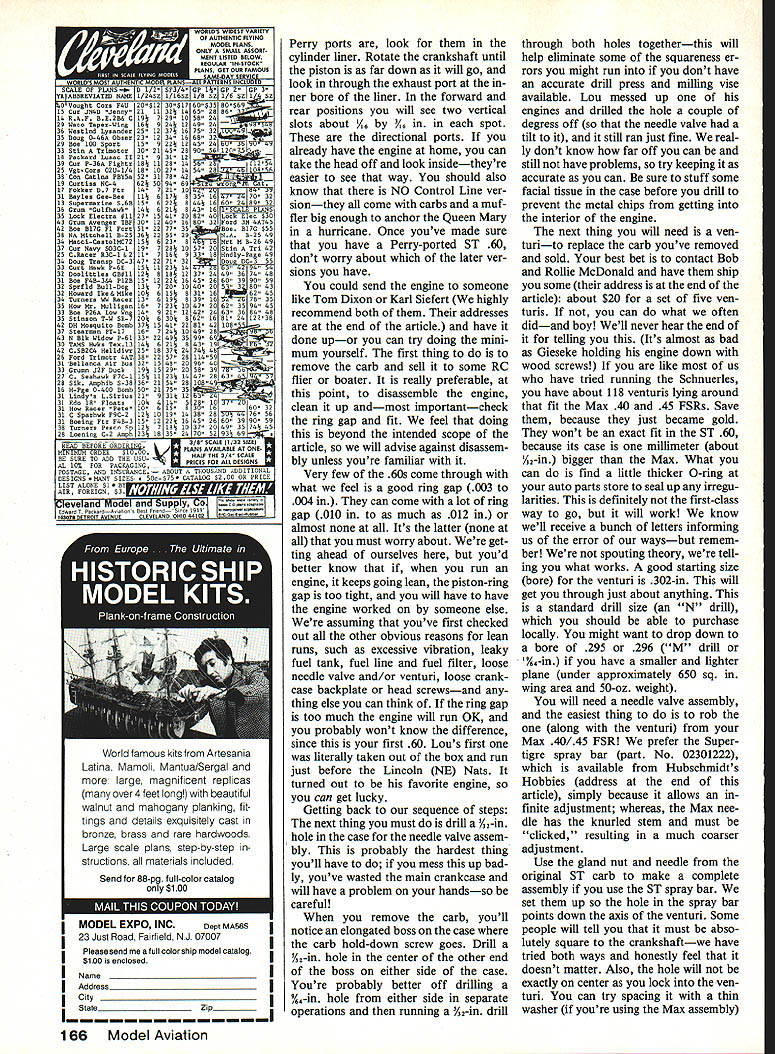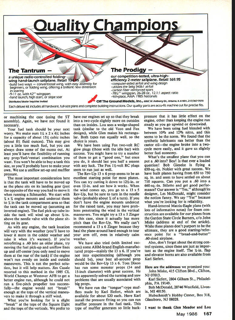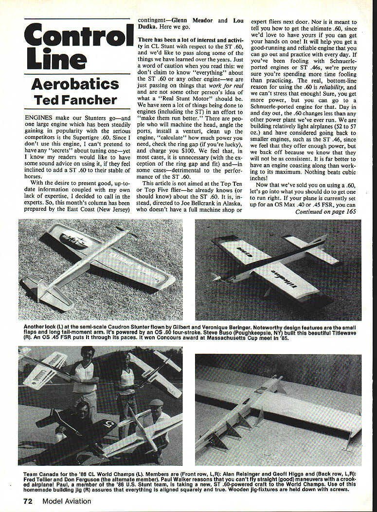 Control Line Aerobatics Ted Fancher ENGINES make Stunters goand large engine has steadily gaining popularity serious competitors Supertigre 60 Since dont use engine cant pretend have secrets about tuning oneyet know readers would like have some sound advice using feel inclined add ST 60 stable horses desire present good up-todate information coupled own lack expertise decided call experts So months column has prepared East Coast New Jersey contingentGlenn Meador Lou Dudkn go has lot interest activi ty CL Stunt respect ST 60 wed like pass along some things have learned over years Just word caution read dont claim know everything about ST 60 other enginewe just passing things work real some other persons idea what Real Stunt Motor should have seen lot things being done engines including ST effort make run better peo ple will machine head angle ports install venturi clean up engine calculate much power need check ring gap youre lucky charge $100 feel cases unnecessary ex ception ring gap fit andin some casesdetrimental perfor mance ST 60 article aimed Top Ten Top Five flierhe already knows should know about ST 60 stead directed Joe Bellcrank Alaska doesnt have full machine shop expert fliers next door Nor meant tell get ultimate 60 since wed love have yours can get hands will help get good-running reliable engine can go out practice day youve fooling Schnuerle ported engines ST 46s pretty sure youre spending time fooling practicing real bottom-line reason using 60 reliability cant stress enough Sure get power can go Schnuerle-ported engine Day day out 60 changes less other power plant weve ever run building relatively light airplanes 52 57 oz have considered going back smaller engines such ST 46 since feel offer enough power back off because know will consistent far better have engine coasting along work ing its maximum Nothing beats cubic inches Now weve sold using 60 lets go what should get run right plane currently set up OS Max 40 45 FSR can Continued page 165 Another look L semi-scale Caudron Stunter flown Gilbert Veronique Beringer Noteworthy design features small flaps long tail-moment arm Its powered Os 60 four-stroke Steve Buso Poughkee N built beautiful Titlewave R An OS A5 FSR puts through its paces won Concours award Massachusetts Cup meet 85 Team Canada 86 CL World Champs 1 Members Front row LR Alan Reisinger Geoff Higgs Back row LR Fred Tellier Don Ferguson alternate member Paul Walker reasons cant fry straight good maneuvers crook ed airplane Paul member 86 US Stunt team taking new 5T 60-powered craft World Champs Use homemade building jig R assures everything aligned squarely true Wooden jig-f ixtures held down screws 72 Model Aviation International Reply coupons available local post office get allowable dimensions shipping box Its drag have take home shorten couple inchesas last time sent model over pond Aeroplane Monthly Rm L 503 Quad rant House Quadrant Sutton Sur rey 5M2 5A2 England cosponsoring Lympne Meet have featured original Lympne planes issue July 1984 November 1985 three-views photos color informa tion etc Free advice generally worth what pay advice adjust autogyro always abundance flying site usually people have lots fixed-wing experience Try ing get trimmed interesting say least Walt Mooney designed rotor just two crossed blades 1A-in sheet scored cracked near hub provide very small negative angle attack flew great Hannan Avro profile gyro roll ing left regularly stalling-out giving fits Luckily ran Bill IMS Show asked rotor blades sanded thin model could picked up using fingers under blades Well could sanded. sanded solved rolling model still headed nose-straight-up ceiling gob clay nose down eleva tors too whim took off nose weight added put CG just front rotor mast andvoilait flew beautifully Ferrell Papics rubber-powered Cierva flies well laminated Mylar draftingfilm rotor blades have flexible trimming techniques too Looking good Indoor wood conLAIHES ING MACHINES INE SHOP SUPPLIES tire Aeration Modeler BLUEAIIDGE [JO/ MACHINERY ANPjtPJLSINC Cell toll free 1-800-872-0500RHprHOHetatleHS WV 1502-3538Mnny Mwwfcterero P0000 536-Y Horrieaon WV 25020 CHOHIUOO $100 Over 200 PageS Cipolla Combat 36 ABC-RE Weight 195 grms/696 oz MOTORI CIPOLLA COMBAT P0 Box 111 JHOOnVilIO IN 47438 THI coos 812 686-3723 Add $3 ShippIng per order Sale Price ANEWSPACESAVINV FUEL CONTAINER VISE Boo 2o 73/Bhlgho 91/8 Toqh Rigid PHI7HIIIyIHHH Includes TulEIng plus $120 PHEOaIN PHISHUNrE Lock Tublug Through Cap North Products PO Box 18419 Cleveland Heights OH 44118 denser tissue small sizes rubber sub-Peanut suggest send buck half Micro-X Products PO Box 1063 Loran OH 44055 catalog goodies have very helpful pamphlet tells dye condenser paper too Well gang get cracking entries Intergnats FAC Lympne meets Remember after sub-Peanut next plane 13-in span will seem hugeand ridiculously easy build Bill Warner 423-C San Vicente Blvd Santa Monica CA 90402 F-i 6/Schrader Continued page 71 between two fingers selected point within CG range Add weight nose tail until model perfectly horizontal Flying Attach control lines Manu factured wire sets 26 35 ft length recommended Before flight check elevator proper free movement model built landing gear will have hand-launched Have helper run about 20 ft model toss airstraight ahead fuselage level point flier should have elevator neutral very slightly up position taking off ground landing gear start elevator neutral position Apply little up-elevator after letting run ground about quarter circle lift off will find model maneuver able very stable has no vices difficult handle landing try anticipate fuel will run out level out about shoulder height engine quits let descend glide apply up-elevator just prior touching down Good luck happy flying F16 model CL Aerobatics/Fancher Continued page 72 get ST 60 fit little filing grinding mounting lugs holes really dont recommend retro fitting best solution since tank location wont exactly right later itll probably still