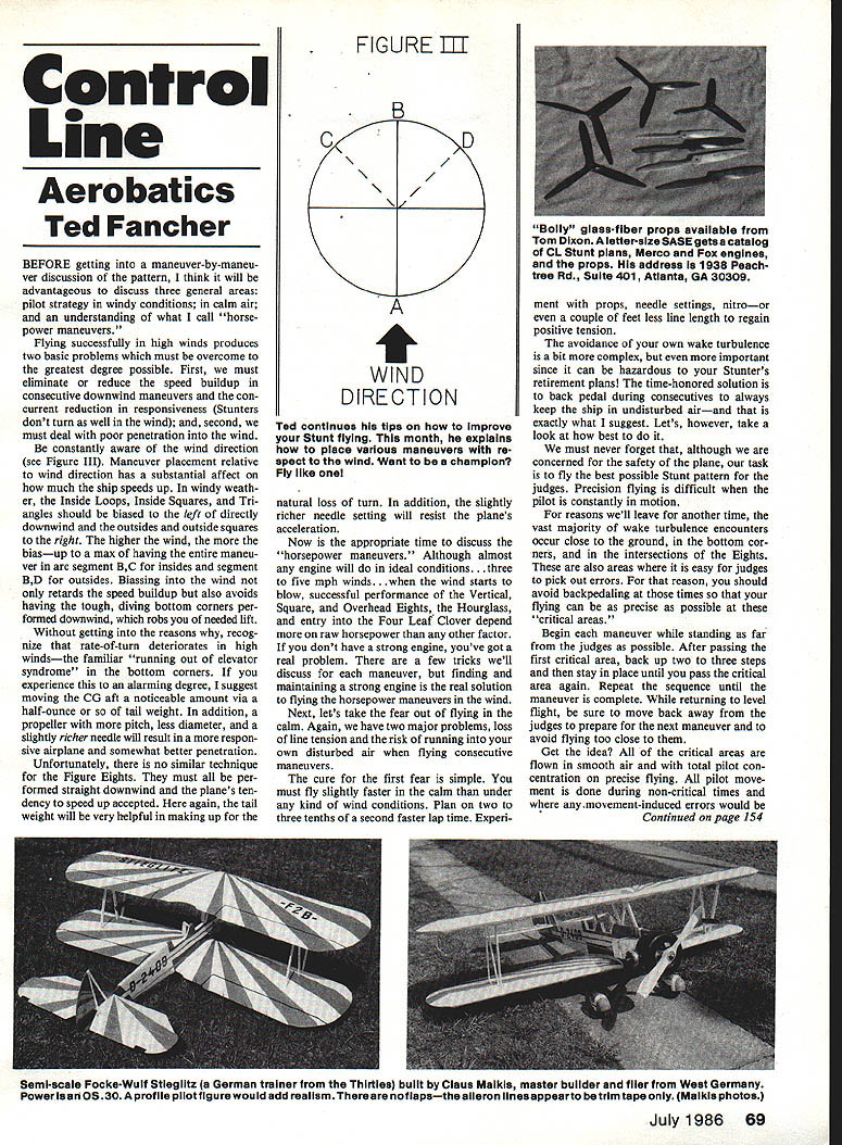 Control Line Aerobatics Ted Fancher BEFORE getting maneuver-by-maneu ver discussion pattern think will advantageous discuss three general areas pilot strategy windy conditions calm air understanding what call horse power maneuvers Flying successfully high winds produces two basic problems must overcome greatest degree possible First must eliminate reduce speed buildup consecutive downwind maneuvers con current reduction responsiveness Stunters dont turn well wind second must deal poor penetration wind constantly aware wind direction see Figure III Maneuver placement relative wind direction has substantial affect much ship speeds up windy weath er Inside Loops Inside Squares Tri angles should biased left directly downwind outsides outside squares right higher wind the biasup max having entire maneu ver arc segment BC insides segment BD outsides Biassing wind retards speed buildup also avoids having tough diving bottom corners perfanned downwind robs needed lift Without getting reasons recog nize rate-of-turn deteriorates high windsthe familiar running out elevator syndrome bottom corners experience alarming degree suggest moving CG aft noticeable amount via haif-ounce tail weight addition propeller pitch less diameter slightly richer needle will result respon sive airplane somewhat better penetration Unfortunately no similar technique Figure Eights must ail per formed straight downwind planes ten dency speed up accepted again tail weight will very helpful making up FIGURE FIlE B CD / / \/ WIND DIRECTION Ted continues tips improve Stunt fiying month expisins place various maneuvers re spect wind Want champion Fiy ilke naturai loss turn addition slightly richer needle setting will resist planes acceleration Now appropriate time discuss horsepower maneuvers Although almost engine will ideai conditions. three five mph winds. wind starts blow successful performance Verticai Square Overhead Eights Hourglass entry Four Leaf Clover depend raw horsepower other factor dont have strong engine youve got reai problem few tricks well discuss maneuver finding maintaining strong engine real solution flying horsepower maneuvers wind Next lets take fear out flying calm Again have two major problems loss line tension risk running own disturbed air flying consecutive maneuvers cure first fear simple must fly slightly faster calm under kind wind conditions Plan two three tenths second faster lap time Experi ment props needle settings nitroor couple feet less line length regain positive tension avoidance own wake turbulence bit complex important since can hazardous Stunters retirement plans time-honored solution back pedal during consecutives always keep ship undisturbed airand exactly what suggest Lets however take look best must never forget although concerned safety plane task fly best possible Stunt pattern judges Precision flying difficult pilot constantly motion reasons well leave another time vast majority wake turbulence encounters occur close ground bottom cor ners intersections Eights also areas easy judges pick out errors reason should avoid backpedaling times flying can precise possible critical areas Begin maneuver standing far judges possible After passing first criticai area back up two three steps stay place until pass criticai area again Repeat sequence until maneuver complete returning level flight sure move back away judges prepare next maneuver avoid flying too close Get idea critical areas flown smooth air total pilot con centration precise flying pilot move ment done during non-critical times movement-induced errors would Continued page 154 Semi-scale Focke-Wuif Stiegiitz German trainer Thirties buiit Cisus Maikis master buiider flier West Germany Power 0S30 profile pliotfigure would add reaiism noflapsthe aileron ilnesappearto betrim tape Maikis photos July1986 69 Boily giass-fiber props available Tom Dixon letter-size SASE getsa catalog CL Stunt plans Merco Fox engines props address 1938 Peach tree Rd Suite 401 Atlanta GA 30309 blers wheel pants etc Vs x 3 x 36 balsa sheet stabilizer elevator wing tips 3A2 x 12 x 12 plywood sheet W-1 ribs Two Y32 x 3 x 36 balsa sheet ribs Two Vs-in-dia music wire 10 long landing gear struts 4e dia music wire 18 long pushrod tail wheel gear -in tail wheel Two 2-in main wheels Four landing gear strapsflat Two Carl Goldberg 900 keepers w/screws nylon control horn 2-in belicrank Two Nyrod inner tubing 2-in long lead-out guides Sullivan control line lead-outs per engine size fuel tank mounting hardware engine blind nut mounting hardware prop Four Vs-in wheel retainers two per wheel Fuel tubing Control line handle w/cables Glue assorted types per text Covering finishing materials Fiberglass cloth wing center section Fuel battery etc responding advertisers mention read about ModelAviation difficult judge detect OK generic suggestions out way Lets get down specifics Im going assume know understand maneu ver descriptions rule book com ments will based assumption hint get out rule book reference did wrote expert has embarrassed himself quoting rules simply dont exist Dont make mistake giving Take off short shrift possible 40 points some competition going putting up big numbers. youd better match recommend launching directly front judges accomplishes several things actual point liftoff will difficult establish since theyll looking down rear view ship wont able see lift-off Also since judges position themselves upwind liftoff will down wind will thus have less tendency balloon climb too quickly Lastly youve planned climb just right lap launch level flight altitude youll able give little blip Down elevator just pass emphasize comple tion climb start level flight Concentrate two laps level flight determine whether engine run acceptable after two level laps give signal hand held high full lap un til judges signal back No signal no offi cial flight wind blowing hard merely getting air concern launch directly wind neutral elevator air plane will airborne almost immediat
