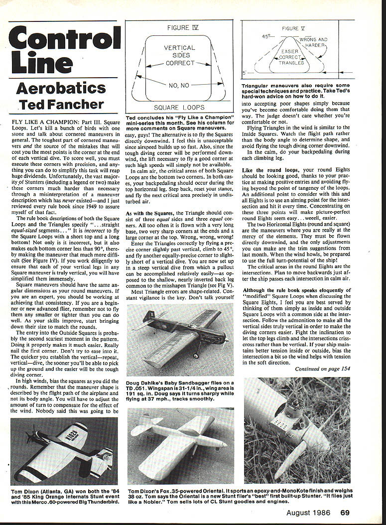 Control Line Aerobatics Ted Fancher FLY LIKE CHAMPION Part III Square Loops Lets kill bunch birds stone talk about cornered maneuvers general toughest part cornered maneu vers source mistakes will cost points corner end vertical dive score well must execute corners precision thing can simplify task will reap huge dividends Unfortunately vast major ityof Stunters including legend two make corners much harder necessary through misinterpretation maneuver description has never existedand just reviewed rule book since 1949 assure myself fact rule book descriptions both Square Loops Triangles specify raight equal-sized segments correct fly Square Loops short top long bottom incorrect also makes bottom corner less 900 making maneuver much diffi cult See Figure IV work diligently ensure vertical legs Square maneuver truly vertical will have simplified immensely Square maneuvers should have same gular dimensions round maneuvers expert should working achieving consistency begin ner new advanced flier remember fly smaller tighter can well As skills improve start bringing down size match rounds entry Outside Squares proba bly second scariest moment pattern Doing properly makes much easier Really nail first corner Dont try ease quicker establish verticalrepeat verticaldive sooner youll able pick up ground easier will tough diving corner high winds bias squares did rounds Remember maneuver shape described flight path airplane its body angle will have adjust amount turn compensate effect wind Nobody said going FIGURE IIVI SQUARE LOOPS Ted concludes Fly Like Champion mini-series month See column comments Square maneuvers easy guys alternative fly Squares directly downwind feel unacceptable since airspeed builds up fast Also since tough diving corner will performed down wind lift necessary fly good corner such high speeds will simply available calm air critical areas both Square Loops bottom two corners both cas es backpedaling should occur during top horizontal leg Step back reset stance fly next critical area precisely undis turbed air As Squares Triangle should con sist three equal sides three equal cor ners too often flown very long base two very sharp corners ends large corner top Wrong wrong wrong Enter Triangles correctly flying pre cise corner slighMy past vertical climb 45 0 fly another equally-precise corner slight ly short vertical dive now set up steep vertical dive pullout can accomplished relatively easilyas op posed shallow nearly inverted back leg common misshapen Triangle see Fig V Most Triangle errors shape-related Con stant vigilance key Dont talk yourself FIGURE V 7WRONG AND HARDER EASIER CDRRECT TRIANGLES Triangular maneuvers aiso require some speciai techniques practice Take Teds hard-won advice accepting poor shapes simply because youve become comfortable doing way judge doesnt care whether youre comfortable Flying Triangles wind similar Inside Squares Watch flight path rather body angle determine shape avoid flying tough diving corner downwind calm backpedaling during climbing leg Like round loops round Eights should looking good thanks prac tice making positive entries avoiding fly ing beyond point tangency loops An additional point consider Eights use aiming point inter section hit time Concentrating three points will make picture-perfect round Eights seem easy. wecell easier two Horizontal Eights round square maneuvers really mercy elements must flown directly downwind adjustments can make trim suggestions last month wind howls prepared use full turn-potential ship critical areas round Eights intersections Plan move backwards just af ter ship passes intersection calm air Although rule book speaks eloquently modified Square Loops discussing Square Eights feel best served thinking simply inside outside Square Loops common side inter section Follow admonition make vertical sides truly vertical order make diving corners easier Fight inclination let top legs climb intersections criss cross rather vertical ship main tains better tension inside outside bias intersection bit wind helps tension soft direction Tom Dixons Fox 35-powered Orientai sports epoxy-and-MonoKote finish weighs 38 oz Tom says Oriental new Stunt fliers beat first built-up Stunter flies just like Nobler Tom sells lots CL Stunt goodies engines August 1986 69 Doug Dahikes Baby Sandbagger flies TD 051 Wingspan ls31-1/4 wing area 191 sq Doug says turns sharply flying 37 mph tracks smoothly Continued page 154 Tom Dixon Atlanta GA won both 84 85 King Orange Internats Stunt event Merco 60-powered Big Thunderbird EASY TO BUILD HANDCRAFTED KITS AT LOW PRICES 3g spanWeigni OsWing span s Wing span WeIght 4 lOs Length 53 inEngine 60 -90Length 45 inEngine 45 -60Length 48 inEngine 40 Kits include Pre-built fiberglass fuselage foam cores sheeted balsa machine cut balsa tail surfaces shaped strip ailerons complete hardware pack SEND CHECK OR MONEY ORDER TOVISA & MASTER CARD ACCEPTED W HORIZON MODELS INC T-404 Kelly Ave Manchester NH 03103 603 627-9503 indoors club meeting won trophy strong belch would throw off course terminal tail slide airfoil shown should very generally allow better penetration turbulence pro vide superior glide somewhat durable could increase mo tor tube length believe would appreciably enhance performance V-dihedral has tried have taller pylons neither added much except struc tural problems heart design low aspect ratio wing very slow prop/rubber combination opposed tra ditional out-of-sight climb/glide mode uppermost thought fun pursuit toward worthwhile goal uncon ventional point view hope build fly project will extract same pleasure did 154 Model Aviation CL Scale/Boss Continued page 68 patibility chart May 1985 column stiffened cloth will easier work will look much neater threads will straighter instead wavy squirrelly look cant avoid using standard application method item W Rozelle found Wing Tips Newsletter Mid-Hudson Mod elmasters courtesy SAM re printed Corsair Mini-contest report Roland Baltes San Pedr