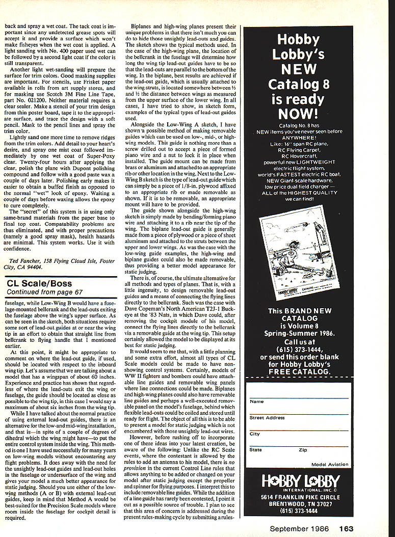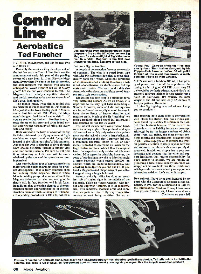 Control Line Aerobatics Ted Fancher IVE SEEN Magnum real Ive also flown Probably exciting development last few years Control Line Stunt announcement early year pending release new Stunt kit Sigthe Mag num Everywhere Ive last six months announcement greeted anxious anticipation Wow Terrific will good Let put concerns rest Magnum entirely competitive aircraft kit promises another example Sigs usual high quality month May pleased find schedule included layovers Des Moines IAjust 60 miles Sig plant Monte zuma Just last month Mike Pratt Mag nums designer invited visit . ever Des Moines Needless say took him up offer twice found self enjoying hospitality Mike lovely wife family Both visits took form tour Sig facilities followed flying session Sigs combination airport model flying field located rolling outskirtsof Montezuma Any modeler planning drive through Iowa should definitely include similar visit tour itinerary Im sure will find interesting did will over whelmed scope operation essive huge building out approximately six major ones includes area set aside prod uct development fully-equipped shop building model airplanes Mike building pre-production versions Magnum insure what sounded good theory will fact function well kit form addition taking pictures con struction process writing notes con struction manual although SOP stand ard operating procedure RC kits will first Sig control-liner couple construction features worthy comment wing cored foam type Lite-Ply stub spars identical highquality hand-built wings Mike has developed ingenious method doing coring labor-intensive absolute must keep costs under control horizontal stab also foam elevators flaps War ren truss-style construction Die cutting has kept minimum very interesting reason As know important use very light balsa building Stunter However successful die cutting can performed very light wood because lacks resilience heavier densities tends crush Much die mashing see result dull cutters assumed last 30 years kit will include construction hard ware including glass-fiber pushrod spe cial control horns serious disappoint ment lack modern large bellcrank airplane size strongly feel minimum bellcrank length 35 four inches needed overcome air loads large control surfaces flew original later experience reinforced con viction Mike agrees principle however costs producing new die injection-mold larger bellcrank would exceed $10000an amount Sig quite understandably unwilling budget just kit build Magnumand hope will suggest using larger bellcrank Aerodynamically Mike has done excel lent job staying right middle ball park no secret weapon far out unproven features moderate size moderate moment arms adequate tail size fly very competitive corners being sensitive Set up Young Paul Zawada Poland filsa mostiyfoam Stunt trainer designed PoppaPlotr Zawada its Cox 09 will pull through round maneuvers really cute kid Photo Piotr Zawada Mikes full-bore ST 60 plen ty power would have preferred de tuning bit good OS FSR strong ST 46 would perfectly adequate dont tell anyone told considering Saito 45 four-cycle Its roughly same weight 60 uses 25 ounces fuel per pattern Hmmmm think Sig giving us real winner urge consider soberIng note came conversation Hazel Sig-Hester has serious con cerns about Sigs ability remain Con trol Line business because current na tionwide crisis liability insurance coverage Although far largest numbers claims come RC flying serious acci dents deaths disablements apparently CL encourage exercise great est possible attention safety activities insure fly well addition drop line con gressman demand write sup port legislation returns responsibility ones actions oneself rapidly ap proaching time liability insurance will simply available institutions provide means whereby support leisure-time activities Lets let happen New subject have twice honored peers Concours dElegance Na tionals 1977 Citation 1981 Intimidation Needless say have some thoughts finishes yet have never done Continued page 162 Preview Fanchers 1986 Nats plane its glossy finish K&B Superpoxynot rubbed outyet photos Ted tells us did column nose fuil Enya 46 four-strokeri Look sneaky cooling air passages Has 4cycie revolution started 66 Model Aviation uceigner MIKS inrau helper BruceTharp prepare fire up ST 60 new Sig Magnum demo flight Sigs Montezu ma IA airstrip Magnum first new Stunter kit ages Ted says files nice SMALL SIZE E PERFORMANCE Step-By-Step Instructions lete Rolled Plans rate Machine Die Cut Balsa Spruce Plywood ce Spars Launch Strength THE HAND LAUNCH E HI-START H 59 Span 15 Oz 2 Channel 370 Sq Area Computer Modified E-193 Airfoil 4DAVEY SYSTEMS 05EV CORPORATION WOOD LANE MALVERN PA 19355 215 644-6772 Although prop does turn up required 25000 rpm ground seems hook up well engine excellent speeds obtained completely-finished propeller 80-cent price range requires enlargement shaft hole reamer slight amount balancing looks like winner 10%-nitro fuel After full year racing 10%-nitro fuel rule Racing events contest organizers now purchasing decent 10% fuel variability excess water content becoming minimum factors CDs two recent meets supplied Red Max brand fuel excellent results contest also used some Cool-Power found also quite satisfactory Several competitors have commented engine life has really extended since running fuel having 60%-70% nitro commonly case before last rules change As always comments photos solicited John Ballard 10102 Kimblewick Dr Louis ville KY 40223 CL Aerobatics/Fancher Continued page 66 column two reasons First hesitant suggest system presented serious health hazardsas recently-popular ones Second Ive never found system felt wasnt replete land mines like bubbling fillets curdling clears palnts clung des perately masking tape airplane Ive just completed finishing Citation V years Nats last Im pleased enough recommend system As can tell pictures finish Concours-qual ity though yet spit-polished addi tion extremely durable doesnt displa