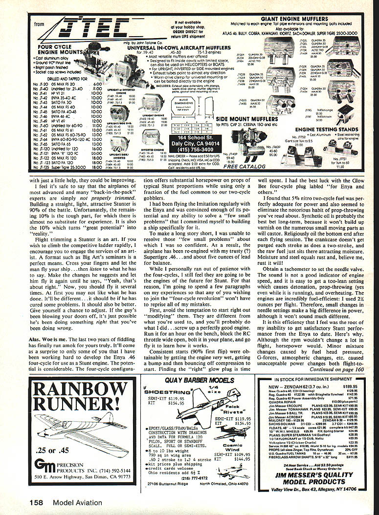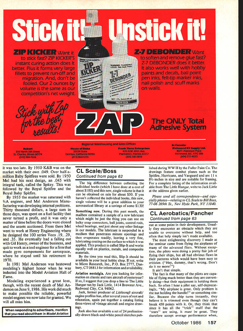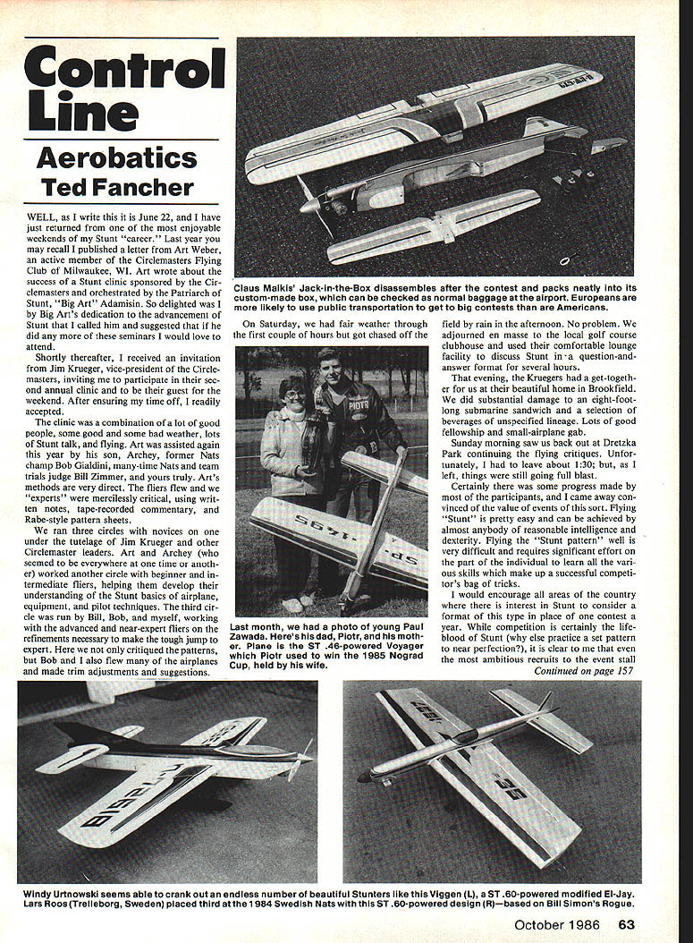 Control Line Aerobatics Ted Fancher WELL write June 22 have just returned enjoyable weekends Stunt career Last year may recall published letter Art Weber active member Circiemasters Flying Club Milwaukee WI Art wrote about success Stunt clinic sponsored Cir clemasters orchestrated Patriarch Stunt Big Art Adamisin So delighted Big Arts dedication advancement Stunt called him suggested did seminars would love attend Shortly thereafter received invitation Jim Krueger vice-president Circlemasters inviting participate sec ond annual clinic guest weekend After ensuring time off readily accepted clinic combination lot good people somegood some bad weather lots Stunt talk flying Art assisted again year son Archey former Nats champ Bob Gialdini many-time Nats team trials judge Bill Zimmer yours truly Arts methods very direct fliers flew experts mercilessly critical using writ ten notes tape-recorded commentary Rabe-style pattern sheets ran three circles novices under tutelage Jim Krueger other Circlemaster leaders Art Archey seemed everywhere time anoth er worked another circle beginner termediate fliers helping develop understanding Stunt basics airplane equipment pilot techniques third cir cle run Bill Bob myself working advanced near-expert fliers refinements necessary make tough jump expert critiqued patterns Bob also flew airplanes made trim adjustments nd ns Saturday fair weather through first couple hours got chased off field rain afternoon No problem adjourned en masse local golf course clubhouse used comfortable lounge facility discuss Stunt question-andanswer format several hours evening Kruegers get-togeth er us beautiful home Brookfield did substantial damage eight-footlong submarine sandwich selection beverages unspecified lineage Lots good fellowship small-airplane gab Sunday morning saw us back out Dretzka Park continuing flying critiques Unfor tunately leave about 130 left things still going full blast Certainly some progress made participants came away con vinced value events sort Flying Stunt pretty easy can achieved almost anybody reasonable intelligence dexterity Flying Stunt pattern well very difficult requires significant effort part individual learn vari ous skills make up successful competi tors bag tricks would encourage areas country interest Stunt consider format type place contest year competition certainly life blood Stunt else practice set pattern near perfection clear ambitious recruits event stall Continued page 157 Windy Urtnowski seems able crank out endless number beautiful Stunters like Viggen L ST 60-powered modified El-Jay Lars Roos Trelleborg Sweden placed third atthe 1984 Swedish Nats ST 60-powered design Rbased Bill Simons Rogue October 1986 63 Claus Maikis Jack-in-the-Box disassembles after contest packs neatly Its custom-made box can checked normal baggage airport Europeans likely use public transportation get big contests Americans Last month photo young Paul Zawada Heres hisdad Piotr moth er Plane ST 46-powered Voyager Plotr used win 1985 Nograd Cup held wife too late 1950 K&B market own 049 Over half-amillion Baby Spitfires sold 1950 Mel next design 045 integral tank called Spitzy followed Royal Spitfire Royal Baby Spitfire 1953 market saturated engines Mel Anderson Manu facturing developing internal problems Thirty thousand dollars large sum days spent fuel facility never turned profit matter time before doors closed assets auctioned Mel went work Henry Engineering designed 100 series Veco 19 29 35 eventually falling out Gil Henry owner business quit work tool engineer firm made gyro components aerospace stayed until retirement 1970 1981 Mel Anderson bestowed modelings highest honor inducted Model Aviation Hall Fame Modeling experienced great loss though recent death Mel An derson June 9 1986 work did much make possible reliable powerful model engines now take granted will miss him big difference between collecting individual books have done cost about 5180 new single volume can obtained sale about $50 havent collected individual books new single volume will great addition aeronautical library savings some $1 30 Something new During past month mailbox contained sample new lubricant might just thing can use balky snap connectors ball joints control rods wheel bearings just about other linkage models lubricant suspended medium penetrates minute openings evaporates readily leaving very fine lubricating coating surface applied product called Slip-It works equally well plastics metals composite materials time read Slip-It should available local hobby shop write Micro Research Inc PO Box 2777 Dan bury CT 06813 information availability Aviation nostalgia Are looking infor mation classic rare aircraft yesteryear suggest drop line Little Hangar run Jack Little 1414 Brewster Ave Redwood City CA 94062 Jack former producer Littlecraft aircraft engine profiles has after several years rest relaxation again put together catalog listing three-views vintage alrcraft engine draw ings Jack also has avallable set 24 profession ally-drawn black-and-white pencil sketches published during WW II Fuller Paint Co drawings feature combat planes such Spitfire Hurricane Vanguard 11 x 8-inches size suitable framing complete listing information avail able Little Hangar write Jack Little address given earlier Please send correspondenceand espe ciallypliotosrelatingto CL Scale Bill Boss 77-06269th St New Hyde Park NY 11040 CL Aerobatics/Fancher Continued page 63 Out some point development Usual ly encounter obstacle unable overcome help too often help simply isnt made available enlightening discovery made seminar came flying airplanes of advanced fliers Without excep tion pilots doing pretty fair job flying ships obvious flaws patterns would have easy criticize Hey dummy thats wrong Dont no aint simple fact pilots capa ble flying much better current ly doingbut equipment holding back So often hear pilot say self-deprecat ingly airplane great Only problem nut holding handle something