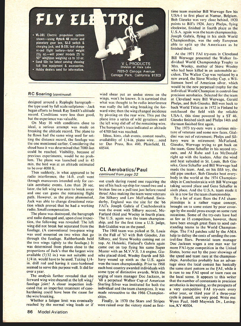 Corrirol Line Aerobatics ABOUT THE TIME readers see 12th Federation Aeronautique ternationale World Championships pre cision aerobatics will taking place Ultrecht Holland Representing United States will defending World Champion Bob Gieseke former two-time World Champion Bill Werwage 1974 team member Gene Schaffer first time team member Les McDonald Gieseke will competing individual will forfeit sometimes advantageous choice flying positions within three spots awarded team United States record World Championships precision aerobatics best of miniature aircraft world very similar USs bas ketball record Olympic games 32 Model Aviation Wynn PduI Bob Gieseke left Gene Schaffer conferring 74 Nats Both long-time competitors members 1976 FAI team have lost team championship once since US first competed 1960 first USA team consisted Don Still Bob Palmer late Steve Wooley team selected three different locations over July 4th week end 1960 Championships held Budapest Hungary early Sep tember Still finished second Louis Grondal Belgium Don flying semi-scale Stuka no doubt raised few eyebrows Europe Bob Palmer finished third flying Thunderbirds Steve Wooley finished fourth veteran Argus Europeans impressed great finish Wooleys plane under FAI rules appear ance points counted Europeans fly planes four five years old Prior 1960 World Championships 1957 58 59 stunt US did send teams two-year cycle instituted after 1960 1962 team Jim Silbavy Dick Wil liams Ed Southwick didnt fare quite well earlier team mates reception Kiev Russia exactly warm competitors best US could Silbavy eighth place Louis Grondal won again flying two origi nal models FAI pattern AMA pattern powered Fox 35s American team finished third behind Russia Czechoslovakia 1964 team picked May year site flyoff Milwaukee WI after days delay high winds new kid block name Bob Gie seke startled lot people placing first try-outs having never placed top three Nationals up time Other team members Lew McFarland Bob Gialdini Budapest again Championships three Amer icans Jun Sirotkin Johani Kari fight ing out top honors Sirotkin came out top Gialdini third McFarland sixth Gieseke ninth place USA again won team championship try-outs 1966 team scheduled September 1965 give ample time team members pre pare future FAI Championships Dayton Steve Wooley made team again after overcoming broken wing during practice low flying hawk total wipecontinued page 86 Placing second Australian Nats Paul Turners Windedge Powered Fox 40 en gine has 60-in span weighs 48 oz Left Unique Curtiss AT-9 Jeep Jack Sheeks powered two OS 30s 57-in Foam Lite wing Weight semi-profile 64 oz Below Enjoying moment relaxation during 75 Nats 1976 FAI team members Les McDonald left Bill Werwage designed around Replogle barograph type used full scale sailplanes Jack began efforts break Ray Smiths altitude record Conditions less good experience valuable May 16 conditions close ideal serious attempt made breaking altitude record plane flown same wing used set ting distance record fuselage mentioned earlier Considering cloud base determined 7000 feet could reached Visibility because previous experiments would no prob lem plane launched 45 mm bird altitude estimated over 4000 ft suddenly what appeared radio interference 14-ft craft went through maneuvers intended cer tain aerobatic events Less 20 sec later left wing seen break away can guess remaining flight path However plane plummeted Jack able change directional rota tion proved working radio Small compensation plane destroyed barograph radio damaged upon close inspec tion following revealed left wing did break separated fuselage conventional two-piece wing used mounted two wires go through fuselage Rubberbands held two wings tightly fuselage determined planes close proportions Jacks largest wire available 7/32 suitable 1/4 would have used Taking 1/4in drill rod having case-hardened seemed serve purpose well did over year analysis further revealed forward wing wire sheared left wing/ fuselage joint closer inspection indi cated imperfect treatment casehardening could have cause wire breaking Whether fatigue limit eventually reached normal wing loads wind shear put undue stress wings wont known surmised what thought radio interference really left wing breaking ward wire wing changed incidence pivoting rear wire put plane series wild gyrations until left wing slid off remaining wire barographs trace indicated altitude 4700 feet reached Ideas hints club events contest results availability 1/4-in piano wire d Dan Pruss Box 490 Plainfield IL 60544 CL Aerobatics/Paul continued page 32 out crash during round requiring use back-up ship round two broken line pull test just before round three Also making team veterans Jim Silbavy Lew McFarland Swin derby England site 66 FAIs Joseph Gabris Czechoslovakia won event Silhavy second Mc Farland third Wooley fourth place US again won team champion ship first time US judge Bob Gialdini panel 1968 team picked St Louis Fall 67 Bob Gieseke Jim Silbavy Steve Wooley coming out top Helsinki Finlands Gabris again came out top flying same Super Master MVVS 56 engine Gie seke placed third Wooley fourth Sil havy wound up ninth US again won team championship Prior 1968 host country awarded individuals some type distinctive awards urging team manager Doc Jackson 68 perpetual Walker Cup American Sterling Silver instituted both individual team champions made retroactive 1966 Champion ships Finally 1970 Stars Stripes raised over victory stand firsttime team member Bill Werwage flew USA-I first place Namur Belgium Bob Gieseke very close behind 1920 points Bills 1924 Jerry Phelps flying clockwise finished fourth place USA again won team championship Joseph Gabris flying sixth World Championships European able split up Americans finished third 1971 FAI try-outs Cleveland Bill Werwage presented Walker dividual World Championship Trophy Mrs Wooley mother Steve Wooley killed automobile ac cident Walker Cup replaced new award Ste