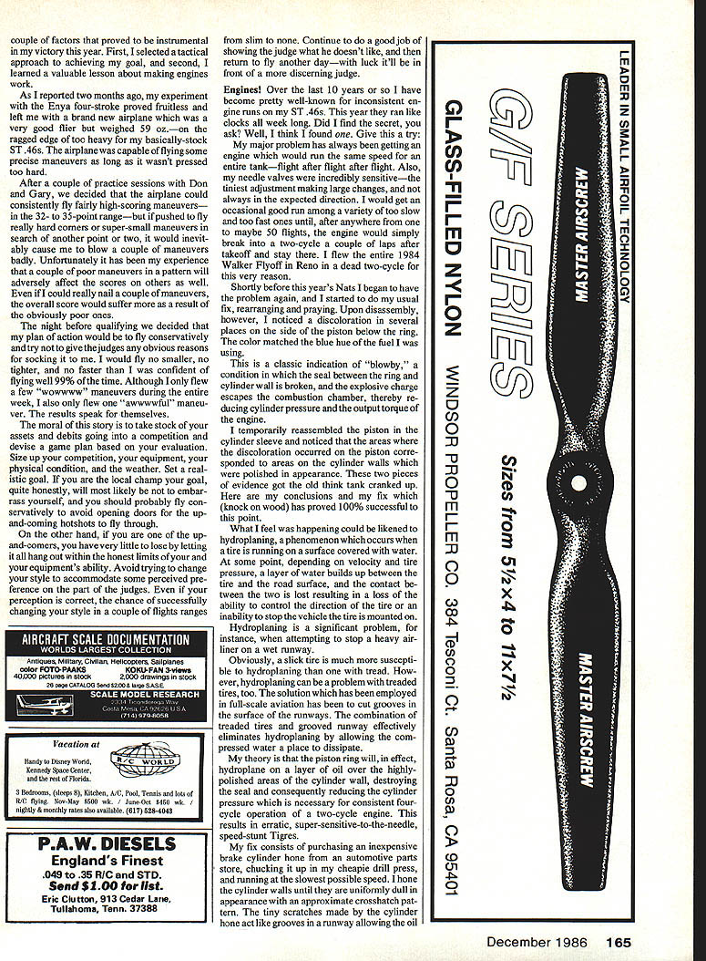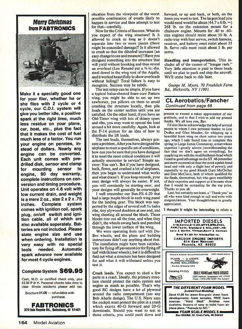 Control Line Aerobatics Ted Fancher MANY THANKS Lou Dudka doing Nats report last months issue third time Lou has filled did usual fine job may aware reason asking Lou help out year distinctly pleasurable past Having write report own success takes lot egogratification out event having ego least large norm eagerly sought out Lous help fortunate enough win Unfortunately poor Lou earned few strokes himself Nats agreeing write column lost chance see name lights Last year Chicopee Lou flying great solid position qualify Walker flyoff Unfortunately second flight twoflight finals inadvertently did four both Inside Outside Loops lost him pattern points caused him miss narrowly final five also coincidentally allowed eventual winner qualify fifth position year no denying Lou flew beautifully week long obvious contention whole ball game right up end record Lou second-highest qualifier Walker Flyoff placed strong fifth final bell rang success prime example payoff dedication hard work Just few personal comments years Nats First great big Thank volunteers usual worked could compete especially Big Art Adamisin ever-active helpmate Betty last hurrah active administration toplevel Stunt competition Thanks lot Art year preceded Special thanks also go Bev Wisniewski both year previous ones has served Control Line Category Director Nats little five-footer has stood 10 feet tall behalf numerous occasions Nats has received precious little recognition work attendance PAMPA Awards Banquet allowed Continued page 164 66 Model Aviation TWO OT mrst iaaies OT Lontroi Line stana guara over ULrAs morn prestigious awaro Walker Cup Betty Adamisin 1 Bev Wlsniewskl strong distaff element present future CL activities national basis talk AMA listens Australias Brian Eather proved nes fine gentleman impressing judges flying Nats tually finished well-deserved seventh Plane original Firecracker ST 60 Alas kids comes easy Eight-yearold Patrick Schuett Aurora IL takes sky nonchalance old pro probably cant figure old-timers get feet tangled up Bill Zimmer photo other hand Tom Thornton Appleton WI demonstrates balletic grace inher- WlndyUrtnowskiisavisionofsartorialsplerl ent discovering inverted flight Note dor redperfectly matching Relentgrace part body ap- less Its further derivation Eljay pearsto flowin attunementwiththe rest Bill theme Jim Greenaway finished fourth Zimmer shot photo recent Mu- 86 Nats Ted thinks ones best waukee Stunt Clinic flying Eljay-type date IMerry ChristmasI FABTRONICSI Make specially good flier whether flies 2 cycle 4 cycle CDI system will give better idle positive spark right time much less residue plane car boat etc plus fact makes cost fuel much less factor run engine pennies stead dollars Nearly engine can converted unit comes pre drilled disk sensor clamp mounting sensor engine 90 day warranty complete instructions con version timing procedure Unit operates 48 volt low current drain weight isa mere 2 oz size 2 x 2 x 75 inches Complete system comes ignition coil spark plug on/off switch igni tion cable also available seperately Bat teries included Please state engine size use ordering Installation very easy no special tools needed Automatic spark advance now available 4 cycle engines Complete System $6995 Cash MO certified check plus $300 P & H Personal checks take time clear Illinois residents please add tax Brochure $100 ndable purchase FABTRONICS 3751111 Rival Hi GaluSImuru III IlUl situation viewpoint worst possible combination events likely happen service attempt test thatcarefully Now Criteria Success What expect wing structure allowed crack long doesnt separate two pieces might concealed damage allowed crush dihedral increases easy change see measure Have designed something structure will yield breaking thus reveal overload Lee Renaud put -in-dia steel dowel wing root Aquila worked beautifully show overloads failing Total failure easy recognize Success may subtle test setup can simple have typical balsa-sheeted foam-core Pattern wing might able set up two sawhorses put pillows avoid crushing structure locally pile loads center section until satisfied other hand have Old-Timer wing lots skinny spars ribs may want spread load around bit carefully Again look F-14 picture idea distribute lift loads test loads themselves always pre sent problem After have designed airplane meet specific set conditions can sure have designed meet critical conditions will actually encounter service Simple swer cant have designed built flown crashed lot airplanes begin understand what works what doesnt keep records next design will always easier will constantly starting over designs will generally overweight well remember Sun-Fli 4-20 large maple block wing panel landing gear block sup ported edges several soft 1/16 balsa ribs tiny plywood doublers end wing sheeting around block blocks tore out time didnt wheels swung back punched through lower surface wing operating turf Du Bro wheels plans building instructions didnt say anything about installation might have satisfac tory flying off pavement flying off turf thinner wheels difficult find out what structure has designed what will withstand unless test Crash loads expect shed few parts crash Ideally primary struc ture should protect radio system engine much possible Thats good RC designs have lot plywood around radio compartment see Bob Aberle design US Navy says cockpit must protect pilot crash exerts 40-G forward 20-G downloads Should want test criteria could push down forward up back both items want test largest load would need would about 447 x 6 lb lb extension mount chainsaw engine Mounts 40 60size engines should resist about 50 lb radio tray four servos switch harness receiver battery must resist about 35 lb Servo rails must resist about 5 lb per servo Handling transportation cludes causes hangar rash Very little attention paid loads until plan pack ship aircraft Well come back later George M Myers 70 Froehlich Farm Rd Hicksville NY 11801 CL Aerobatics/Fanche