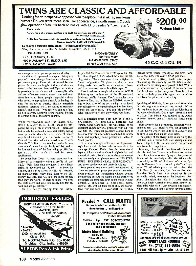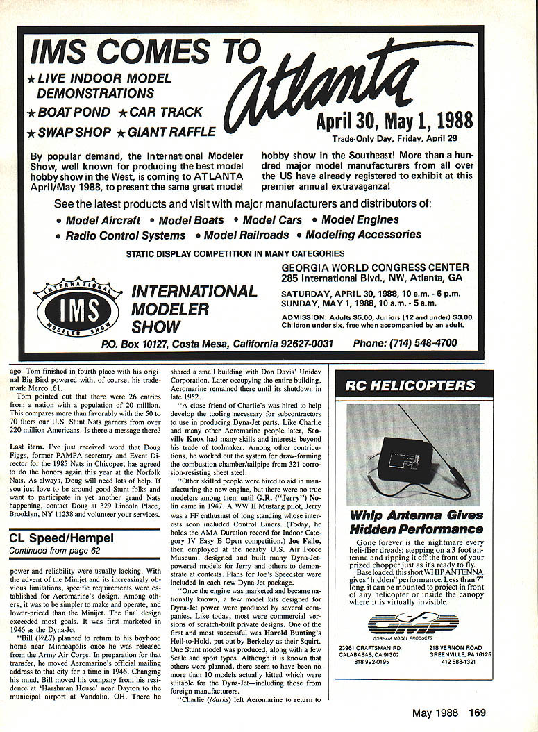 PAMPA LIVES lam pleased announce af ter number months internal restructuring during time survival Control Line Stunt special interest organization some times doubt PAMPA Precision Aerobat ics Model Pilots Association has successfully aligned longtime leaders some new ones hardworking talented group people will bring PAMPA clearly back forefront special interest groups Tom Dixon Atlanta Georgia has just elected serve president PAMPA Tom outstanding competitor accomplished businessman own right has combina tion modeling knowledge administrative acumen provide leadership will necessary steer group through next couple years change past policy wherein posi tions newsletter editor treasurer combined Ed Robbert has elected po sition treasurer addition PAMPA lucky have retained incumbent talents Bob McDonald VP Mike Pratt secretary membership chairman especially Windy Urtnowski newsletter editor Windy has done outstanding job over last several years putting out Pro-Stunt News also true task becoming overwhelming him individually other reasons publication tended sporad ic gave some members concern about con tinued viability organization As such organization success PAMPA inti mately tied timely communication av erage member newsletter reason belonging PAMPA quite literally facing crisis could have proven fatal Fortunately us enjoyment Stunt enhanced PAMPAs existence Stunt people wouldnt allow die Continued page 167 May 1988 61 Control Line Aerobatics Ted Fanucher 158 F lying Cloud Isle Foster Ci CA 94404 Anatoly Kolesnikov current CLPA World Champion extremely colorful red/white/bluelyellowlblack original design reminiscent full-scale Aerobatic machine powered custom-made engine approximately 40 cu displacement European OLPA champ Klaus Maikis New Ulm FR Germany built very attractive pracfice Stunter shown above Power radially-mounted PAW 35 dIesel Note greatly resem bles M35 competition plane below Fancher notes little plane configured very much along lines Imitation Notice profile fuselage swells width forward high point wing airfoil allows much stronger fuse-to-wing joint big two-piece see photo below left M35 Stunter powered Supertigre 60 Maikis art ist designer trade beautifully-formed -crafted planes always among attractive contest continent European CLPA filers build models disassemble ease transport contests Photos Maikis Wing Span 54 WingArea615sq Fuse Length 44 filler tubes might require make fuel tank specific size shape However effort pays off better-looking model Hint workshop Bob Furr taken Orbiting Eagles Newsletter Omaha NE tip Bob has use carbide disks us use Dremel similar tool cutting such things music wire things doesnt seem 100% avoidable shattering disk now way reduce fre quency such accidents Bob says treat disk fastsetting cyanoacrylate glue will much stronger after treat careful use safety glasses cutting anything Scale Model Research has announced another addition several hundred new items its al ready huge list Foto-Paaks three-view draw ings other miscellaneous data can used Scale modelers documentation pur poses SMRs latest catalog some 40 pages thick lists over 1800 Foto-Paaks boasts inventory over 50000 photos photo stud ies cover antiques Golden Age military civil ian helicopters aerobatic experimental sailplanes racing planes aircraft engines Pho tos 3 x 5 show details modelers want ie landing gear instrumenta tion working surface hinging paint schemes markings couple other services offered SMR enlargement specific photos selected Foto-Paaks fee based picture size desired also now offer research service information specific aircraft beyond what listed cata log cost $10 aircraft search Weight4 45 lbs Engine45 60 4 cycle 25 45 2 cycle made additional charge SOC per pho tocopied page data search does turn up additional data half $5 initial search fee returned appears SMR offering rather complete set services Scale model documentation Anyone wishing obtain SMR catalog full details services should send $3 Scale Model Research 2334 Ticonderoga Way Costa Mesa CA 92626 CL Scale modelers important aspects YOUR Scale column presentation ideas photos relating activity share fel low Scale modeler Send ideas comments photos address front col umn CL Aerobatics/Fancher Continued page 61 Enter cavalry Through efforts Mike Pratt product engineer Sig Corporation Bob Hunt editor Flying Models magazine Carstens Publications Windy now receiving help needs badly terms typesetting printing collating labeling mailing time-consuming tasks now being done professionally very reasonable cost two gentlemen respective organi zations bottom line now should have received first possibly second issue revitalized Pro-Stunt News official newsletter Precision Aerobatics Model Pilots Association its exciting new maga zine-style format owe big vote thanks gentlemen hard work doing behalf Drop line say thanks Ive already received word change poli cy under Toms administration PAMPA Mem bership will changed January-to-Decem ber format rather prior 12-month cycle based signed up excellent change should make PAMPA recordkeep ing much easier us wont have excuse realizing memberships lapsed alert implementation new procedure wont get dropped out system miss issues havent belonged PAMPA before would like join nearly 400 current mem bers need renew membership send name address phone number $15 Mike Pratt Secretary PO Box 506 Montezuma IA 50171 have items interest would like have published Pro-Stunt News send directly Windy Urtnowski Editor 9 Union Ave Little Ferry NJ 07643 youve got some administrative input youd like make contact either Tom Dixon President 1938 Peachtree St Suite 401 Atlanta GA 30309 Bob McDonald Vice-President 28746 Westfield Livonia MI 48150 New important subject PAMPA member Scott Richlen 5133 Bradfield Dr Annandale VA 22003 spearheading movement develop exhibit Stunt aircraft Model Aircraft Museum AMA Headquarters Reston VA President Tom Dixon has appointed Scott PAMPA founder Wynn Paul Le