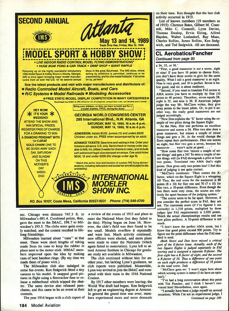 THE IMAGE received letter Europes finest Stunt pilots Because know individual well because respect opinionswhether might share themI have chosen devote column month article American Dream Suffice say notwithstanding friendship author dont share opinions next month intend publish public reply stating Nonetheless fact mature accom plished modeler worldwide competitive ex perience sincerely believes accuracy image paints us article should give us pause extent views may reflect opinions rest Stunt world worthy consideration Because provocative nature com ments have chosen identify him publicly will call him Henri although neither name nor hint nationality will ever happy act intermediary comments readers may have re sponse American Dream Henri After reading two three American maga zines regularly almost three decades plus Stunt News almost its beginning feel have casual view American Stunt scene typical American opinion admire American approach Stunt flying Euro peans dont seem capable mixture take easy ones best seems red line constant misunderstanding concern ing FAI matters Some recent contest reports especially views 1988 CL World Chainpionships confirm conviction Ameri cans live own world have problems accepting international modeling reality Let please use Don McClaves report World Championships PAMPAs Stunt News issue #29 example explain Americans have problems Ill quote some remarks misunderstood things FAI scoring system always fly America under AMA rules probably dont know about FAI rules However top pilotsespecially have chance make team should know least enough understand sys tem Mr McClave says FAI scoring uses 10point scoring system rather 40-point AMA system Somebody once told minimum score 10 pointsjust flying maneuver dont know whether true true have 30-point system However since dont know sure must suppose have 40-point system McClave continues Therefore good ma neuver FAI seven eight nine instead Continued page 184 80 Model Aviation Conoi Lne Aerobatics Ted Fancher 158 FlyIng Cloud Isle Foster Cl CA 94404 Australias Brian Eather flew absolutely magnificent original-design Firecracker 88 Nats earned well-deserved 19 appearance points finished Top 10 Top Polish flier Piotr Zawada puts mouth promoting Stunt poses 13 pupil/members modeling club models mosty designs too Reigning World Champilon Zhang Xiang Dong Peoples Republic China po sea very attractive winning model Will Its pleasant generic semiscale lines spire other fliers abandon todays sterile foam-clone look something similar couple unidentified Austrian Stunt jock eys admire Claus Malkis gorgeous biplane Stunter disbelief Its flying potential dashed Claus won meet SECOND ANNUAL May13 14 1989 MODEL SPORT & HOBBY SHOW i LIVE INDOOR RADIO CONTROL MODEL FLYING DEMONSTRATIONS HUGE BOAT POND & CAR TRACK SHOP T RAFFLE Following up highly successful Introductory show great Southeest IMS show 1988 Model Spoil & Hobby Show Atlanta Georgia selling exhibitors permitted continues IMS once again bringing major model manufac- presented fat model hobbyist VaIl come turers over US its aecond annual ya heari See latest products visit major manufacturers distributors * Radio Controlled Model Aircraft Boats Ca, * R/C Systems * Model Railroads * Modeling Accessories * FREE STATIC MODEL DISPLAY COMPETITION IN MANY CATEGORIES* ISand lasal sue SASS 1MB office list ss5soIao oosspati5le nIas sdswo snty force IIEYMOMI. * ITS YOUR * WEEKEND ATTEND THE SHOW AND WIN SPECIAL PRIZES REGISTER FREE OF CHARGE FOR DRAWING 10 WIN DIAMOND PENDANT WITH 14-CARAT GOLD CHAIN ONE 10 BE GIVEN AWAY EACH DAY SATURDAY AND SUNDAY ON THIS MOTHERS DAY WEEK END Bring your ditidron cut lawn build fly a mtdol airplane PAP-S dasobta alta danal GEORGIA WORLD CONGRESS CENTER 285 international Blvd NW Atlanta GA SATURDAY MAY 13198910 am-6 pm SUNDAY MAY 14196910 am-5 pm ADMISSlON Adults $500 JunIors 12 under saco Children under six FREE accompanied adult ADVANCE TICKETS Save time waiting line Order tickets advance US Send check money order pay able IMS Inc Allcw3weeks checks clear include self-addressed legal-size stamped envelope adult ticket $500 12 under SaOO No charge under age 6 Watch ad time location outdoor RtC flying demon strations including helicopters ducted fan aircraft subecttoaite availability INTERNATIONAL MODELER SHOW INQ P0 Box 10127 Costa Mesa CalifornIa 92627-0031 Phone 714 548-4700 sec Chicago won distance 7473 ft Milwaukees 6914 Combined points thus gave meet IMAC 1987 Mil waukees 1935 clubs quite ly matched contest resulted life long friendships Milwaukee learned about cans meet short lengths tubing made tin cans keep rubber place next motor stick MMAC mem bers improved upon idea making cans bent bamboo rings time made piano wire Milwaukee club also indulged some fun events Ken Sedgwick fitted tiny camera model snapped good pic tures flight using firecracker fuse re lease rubberband tripped shut ter same device also released para chutes came event contests year 1916 began club report review events 1915 plans enter National Meet failed Flying began June 16 ever clubs field found too small Models overfiew repeatedly lost Much activity continued new officers elected plans made enter Nationals again failed materialize Lynn left tend Armour Institute Chicago gradu ate study available Milwaukee club continued him another year lacking Lynns guidance no club reports published Meanwhile Lynn invited join IMAC com peted team 1916 National Contest 1917 other members leaving World War draft begun Ken Sedgwick left get engineering degree Armour general grand time over mem bers experienced more demands time Ken thought last club activity occurred 1919 List known members 19 members 1915 Clarence Bates Gilbert M Coun sell Milo C Counsell Lynn Davies Thomas Dunlop Ervin Eiring Alfred Hayden Walter Loehndorf Ray Mans Charles Rollins James Rollins Ken Sedg wick Ted Sedgwick deceased CL AerobaticslFancher Continued page 80 34 35 36 First good maneuver seven eight nine hav