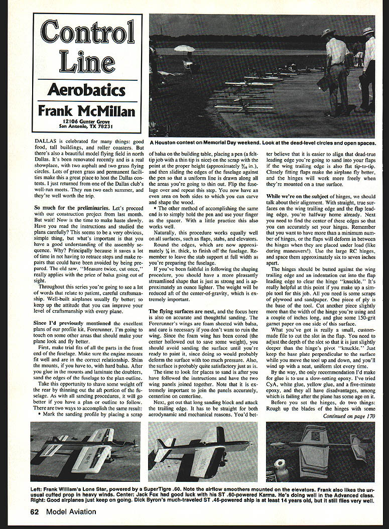 DALLAS celebrated things good food tall buildings roller coasters theres also beautiful model flying field north Dallas Its renovated recently real showplace two asphalt two grass flying circles Lots green grass permanent facili ties make great place host Dallas con tests just returned Dallas clubs well-run meets run two summer theyre well worth trip So much preliminaries Lets proceed construction project last month wait Now time make haste slowly Have read instructions studied plans carefully seems very obvious simple thing whats important have good understanding assembly se quence Principally because saves lot time having retrace steps make re pairs could have avoided being pre pared old saw Measure twice cut once really applies price balsa going Out sight Throughout series youre going see lot words relate patient careful craftsman ship Well-built airplanes usually fly better keep up attitude can improve level craftsmanship plane Since Id previously mentioned excellent plans profile kit Forerunner Im going touch some other areas should make plane look fly better First make trial fits parts front end fuselage Make sure engine mounts fit well correct relationship Shim mounts have hard balsa After glue mounts laminate doublers sand edges fuselage plan outline Take opportunity shave some weight off rear thinning out aft portion fu selage As sanding procedures will go better have plan outline follow two ways accomplish same result Mark sanding profile placing scrap balsa building table placing pen felttip job thin tip nice scrap point proper height approximately /I6 sliding edges fuselage against pen uniform line drawn along areas youre going thin Out Flip fuse lage over repeat step now have area both sides can carve shape wood other method accomplishing same end simply hold pen use finger spacer little practice also works well Naturally procedure works equally well surfaces such flaps stabs elevators Round edges now approxi mately % thick finish off fuselage Re member leave stab support full width youre preparing fuselage youve faithful following shaping procedure should have pleasantly streamlined shape just strong ap proximately ounce lighter weight will reduced aft center-of-gravity ex tremely important flying surfaces next focus also accurate thoughtful sanding Forerunners wings foam sheeted balsa care necessary dont want ruin wing Since foam wing has cored center hollowed Out save some weight should avoid sanding surface until youre ready paint since doing would probably deform surface too much pressure Also surface probably quite satisfactory just time look places sand after have followed instructions have two wing panels joined together Note ex tremely important join panels accurately centerline centerline Next get out long sanding block attack trailing edge has straight both aerodynamic mechanical reasons Youd better believe easier align dead-true leading edge youre going sand flaps wing trailing edge also flat tip-to-tip Closely fitting flaps make alrplane fly better hinges will work freely theyre mounted true surface subject hinges should talk about alignment straight true sur faces wing trailing edge flap lead ing edge youre halfway home already Next need find center edges can accurately set hinges Remember want have minimum num ber hinges flaps will deform between hinges placed under load like during maneuvers Use large RC hinges space approximately six seven inches apart hinges should butted against wing trailing edge indentation cut flap leading edge clear hinge knuckle Its really helpful point make up sim ple tool job need some scraps plywood sandpaper piece ply base tool Cut another piece slightly width hinge youre using couple inches long glue some 150-grit garnet paper side surface What youve got really small custommade file cut slot flap need adjust depth slot just slightly deeper hinges pivot knuckle Just keep base plate perpendicular surface move tool up down youll wind up neat uniform slot time way recommendation Id make glue use slow-setting epoxy Ive tried CyA white glue yellow glue five-minute epoxy have disadvantages among failing after plane has some age Before set hinges two things Rough up blades hinges some Continued page 170 62 Model Aviation Confrol Line Aerobatics Frank McMiIIan 12106 Gunter Grove San AntonIo TX 78231 Houston contest Memorial Day weekend Look dead-level circles open spaces Left Frank Williams Lone Star powered SuperTigre 60 Note airflow smoothers mounted elevators Frank also likes un usual cuffed prop heavy winds Center Jack Fox good luck ST 60-powered Karma Hes doing well Advanced class Right Good airplanes just keep going Dick Byrons much-traveled ST 46-powered ship least 14 years old still flies very well flying short-coupled moments ample control surfaces make AT-6 highly re sponsive airplane fly widespaced handle have found need tune down control movements Once test flight over let winds blow True lineage AT-6 good trainer fun fly CL Racing/Ballard Continued page 61 1990 Tucson AZ Events interest us Rac ers Class II Mouse Race Limited Sport Rac ing Texas Quickie Rat Im including photos some winners respective events Annual Rebel Rally recently attended 30th annual Rebel Rally Control Line contest held Jacksonville FL contest held over weekend Most CL events flown including Florida Slow Rat Mouse Race Texas Quickie Lil Wizard Slow Rat kids contest numerous entries some participants young six years fine Junior pilots Russell Whitney am enclosing photo him flying Florida Slow Rat Another photo shows Lickety Split Slow Rat flown Charles Barnes Sr Ft Lauderdale FL uses K&B 58cc engine Look closely photo youll see engine mounted large aluminum plate mini mizes engine vibration steadies fuel flow engine Charles uses swing-weight carbu retor chokes engine ground opens up full bore air Dick Lambert practicing Scale Racers found hot humid air quite similar what expect find forthcoming AMA Nats Illinois found Scale Race engines must turn 27000 rp