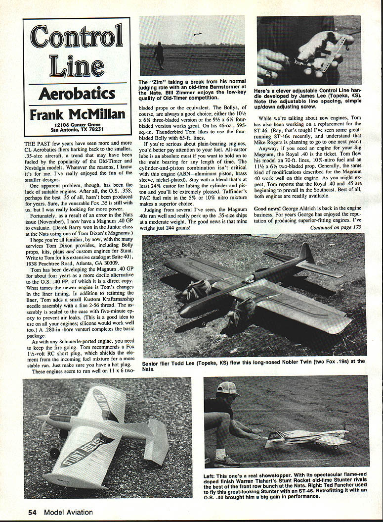 THE PAST few years have seen more CL Aerobatics fliers harking back smaller 35-size aircraft trend may have fueled popularity Old-Timer Nostalgia models Whatever reasons know its Ive really enjoyed fun smaller designs apparent problem though has lack suitable engines After 05 35S perhaps best 35 hasnt produced years Sure venerable Fox 35 still us really looking power Fortunately result error Nats issue November now have Magnum 40 GP evaluate Derek Barry won Junior class Nats using Tom Dixons Magnums hope youre familiar now services Tom Dixon provides including Bolly props kits plans custom engines Stunt Write Tom extensive catalog Suite 401 1938 Peachtree Road Atlanta GA 30309 Tom has developing Magnum 40 GP about four years docile alternative OS 40 FP direct copy What tames newer engine Toms changes liner timing addition retiming liner Tom adds small Kustom Kraftsmanship needle assembly fine 2-56 thread sembly sealed case five-minute ep oxy prevent air leaks good idea use engines silicone would work well too 280-in-bore venturi completes basic package As Schnuerle-ported engine need keep fire going Tom recommends Fox 1-volt RC short plug shields ele ment incoming fuel mixture stable run Just make sure have hot plug engines seem run well 11 x 6 twobladed props equivalent Bollys course always good choice either 10 x 614 three-bladed version 9 x 6 four bladed version works great 46-oz 595sq-in Thunderbird Tom likes use four bladed Holly 65-ft lines youre serious about plain-bearing engines youd better pay attention fuel All-castor lube absolute must want hold main bearing length time cylinder-and-piston combination isnt critical engine ABNaluminum piston brass sleeve nickel-plated Stay blend thats least 24% castor lubing cylinder pis ton youll extremely pleased Taffinders PAC fuel mix 5% 10% nitro mixture makes superior choice Judging several Ive seen Magnum 40s run well really perk up 35-size ships moderate weight good news weighs just 244 grams talking about new engines Tom has also working replacement ST-46 Boy thats tough Ive seen some greatrunning ST-46s recently understand Mike Rogers planning go next year Anyway need engine Sig Magnum Royal 40 ticket Tom flew model 70-ft lines 10%-nitro fuel 11 x 6 two-bladed prop Generally same kind modifications described Magnum 40 work well engine As might ex pect Tom reports Royal 40 45 beginning prevail Southeast Best both engines readily available Good news George Aldrich back engine business years George has enjoyed repu tation producing superior-fitting engines Ive Continued page 173 Left This ones real showstopper its spectacular flame-red doped finish Warren Tiaharts Stunt Rocket oid-time Stunter rivals best front row bunch Nate Right Ted Fancher used fly great-looking Stunter ST-46 Retrofitting OS 40 brought him big gain performance 54 Model Aviation Conot Line Aerobatics Frank McMiIIan 12106 Gunter Grove San Antonio TX 78231 Zim taking break normal judging role old-time Barnstormer Nats Bill Zimmer enjoys low-keyHeres clever adjustable Control Line han quality Old-Timer competitiondle developed James Lee Topeka KS Note adjustable line spacing simple up/down adjusting screw Senior flier Todd Lee Topeka KS flew long-nosed Nobler Twin two Fox 19s Nate CA RCDIS&Ii Service Ctr FL Radie South Steve EwohlioTony Stiliroan P0 408 988-1214Ph 904 478-6745 Authorized WC Service Don McCartOy P0 619 728-0440 GSR Products George Steiner Ph 816 362-1962 FL Southeru R/C Daoid Steoeos Ph 813 775-1554 Wollitz R/C Caloio Woitz Ph 904 771-0613 IL Pete Colvogna Ph 615 233-5646 MI 0 & J Electronics Daoe Coihogs Ph 517546-2644 Charlies Hohhieskrett Midwest Charlie PouhonPete Waters Ph 013 802-4007Ph 313 348-0095 Jims R/C ServiceNJOcean Cuouty WC Jim StewartJim Maraldo P0 305 021 -1192P0 201 505-9477 pj RJL Control Systems Rock Leone Ph 201 627-7070 NY Lens R/C Service [on Sauter Ph 315 695-2448 OH Acre Models Terry Banon Ph 216 948-1675 TN Rivergate Hohhy Ctr Ed Branoan Ph 615 859-3455 TX DoMoud WC Service WA Auythiug IVC Joe DaMondRichard Carson Ph 214 242-5500Ph 509 327-4579 Steve WhisenhuutWIGalaxy Scieuce & Hohhy Steoe WhiseohootWade Van Ryzin Ph 817 246-6349Ph 414 730-9220 RCD Redlo Control Development Inc 9419 Abraham Wan ee CA 92071 PH 16191 449-1112 FAX 10191 449-1002 Als Hohbies Al Rohies Ph 713 944-0607 Custom-Tronics Richard Slate Ph 713 460-1290 Paul Smith reached top speed 107 mph ST G-2 1 compared slightly over 70 mph Redhead engines McCoy manufac ture Johnson Combat Special no match Pauls model Since first meet meane fun no really minded what en gines being used its issue thatll need lied down contests run future easygoing competition Flying Saucers threatening sweep contest un til about third round got hit other killed Most matches ended kills Current rules usedno worrying about multicolored streamers collision zones rest early days Someone brought copies late-1950s rules Theyre much complicated harder judge use today reason old engines ran well everyone using either bladders pacifiers old hard tanks seemed promote bad set tings lean runs seizures 9 x 8 props used use just didnt workor maybe ears tuned pitch Taipan 8 x 6 produces multitude suggestions made about engine problem thought 80-mph limit might helpful could go 80 mph old engines fear blowing up something dont want risk since spare parts arent readily available Maybe could try 80-mph limit bonus 10 points honest-to-goodness legal 1961and-earlier engine Next year Doc plans either hold meet Jasonville tie much larger OldTime meet would include other events Kits plans available engine problem will have nailed down Some better designs such Equalizer could used backup models regular Fast Combat meets go weird can build Saucer amaze friends local Con trol Line field Watch announcement 1991 meet CL Aerobatics/McMiIIan Continued page 54 watched him hone cylinder Sun nen shaping fitting rings pistons can tell theres no better George also has access superior chroming may want consider chromed lin