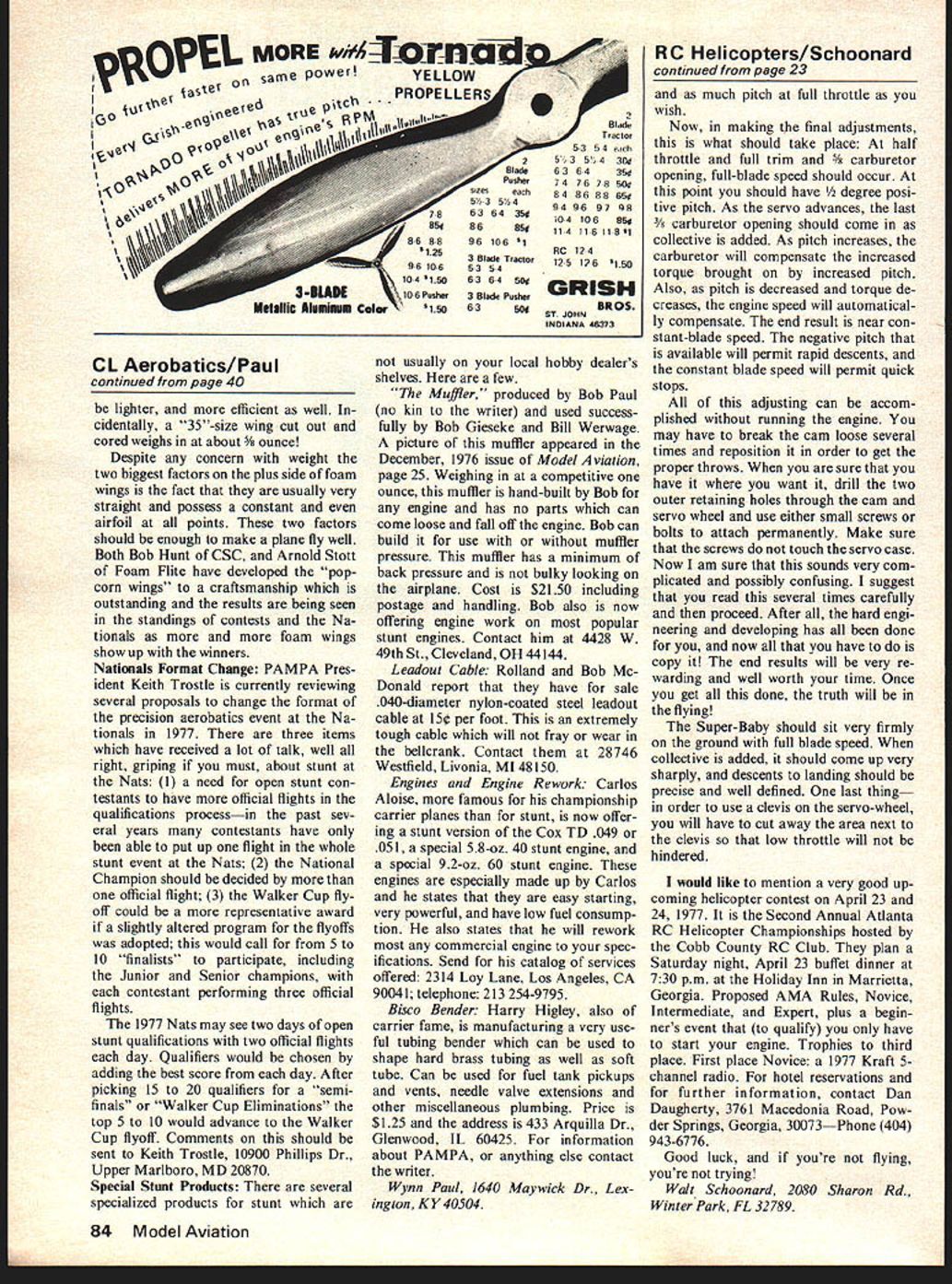 Aerobatics FOAM PRODUCTS UPDATE Control Specialties Co has some new twists foam wing stunt fliers should like First off entrepreneur Bob Hunt now fers foam flaps have cut out integral part total airfoil other words wing flap cut Wynn PduI same piece foam cut sep arated covered balsa skin balsa insert flap re ceive flap horn Most 46-size wings flaps covered 3/64 balsa 35s covered 1/32 balsa needed attach flaps cut 45-degree bevel flap sand off sharp edge trailing edge wing put hinges writer has wings new Pampawagon IV work exceeds other great wings CSC second innovation CSC wing inclusion two built-in Vt-in lite ply half ribs placed accept landing gear blocks blocks glued recess cut bottom wing two half ribs side cut out estimate weight would 30 grams weight landing gear blocks also manufactured CSC $495 155 grams weight landing gear wire Vs stock 150 grams means can have complete landing gear assembly minus wheels spats weighing 73 grams about 2 oz bad gear removable case bend wrong have hard landing lastly CSC now offering foam stabilizers elevators covered balsa skins Bob offers two standard de signs Genesis 46 size 3-in root 2-in tip Genesis 35 size 3-in root 2-in tip Both designs thick center section can make up stab-elevator design own specifications 46 sizes covered 3/64-in skins 35 sizes covered 1/32-in balsa stabilizer strong enough withstand hard corners /8-in plywood spar imbedded foam trailing edge stab extends six inches either side center piece balsa imbedded elevators receive elevator horn give solid mounting stabs elevators made up spans suit customers desires Prices vary interested fliers should contact Bob 205 Wood Ave P0 Box 268 Mid dlesex NJ 08846 telephone 210 469-1663 Bob advises stabs should have gauze strip epoxied around center wings rigidity stunt flier has observed abundance top caliber competitors stunt past couple years could probably said dozen fliers could win Nationals now adays writer feels rapid de velopment acceptance foamwing airplane has deciding factor emergence multitude very good stunt fliers some may argue foam wing light its builtup counterpart will dispute among Gene Schaffer Bob Hunt both noted very light airplanes Bob states uses Cello foam expanded polystyrene has weight pound per cubic foot says 46-size wing cored out just foam weighs approximately e weight comes balsa glue has switched recently Wil hold spray cement considers continued page 84 Above One biggest stunters Nets 62-in Scorpio Bill Simons foam wing stab flaps elevatorST 46 Paul pic Left Maybe bite little harder plane will better triangle author ease during 1975 FAIs Doc Jackson pic Below What about line tension Al Rabe trouble doing Overhead Ss 1975 FAIs Dayton Photograph Doc Jackson ~OPE1 MORE w/AfiWflid7d o ofl same power YELLOW jaster e pttCPROPELLER JB ade e\\e e~Ta o O9 5354 e S 00 O 2 PosIer 3 544 6364354 8-6 ss 9-6 106 1 3 Blade Tractor 53 54 63 6-4 504 3 Blade Pusiw 63 CL Aerobatics/Paul continued page 40 lighter efficient well cidentally 35-size wing cut out cored weighs about /t ounce Despite concern weight two biggest factors plus side foam wings fact usually very straight possess constant airfoil points two factors should enough make plane fly well Both Bob Hunt CSC Arnold Stott Foam Flite have developed pop corn wings craftsmanship outstanding results being seen standings contests Na tionals more foam wings show up winners Nationals Format Change PAMPA Pres ident Keith Trostle currently reviewing several proposals change format precision aerobatics event Na tionals 1977 three items have received lot talk well right griping must about stunt Nats need open stunt con testants have official flights qualifications processin past sev eral years contestants have able put up flight whole stunt event Nats 2 National Champion should decided official flight 3 Walker Cup flyoff could representative award slightly altered program flyoffs adopted would call 5 10 finalists participate including Junior Senior champions contestant performing three official flights 1977 Nats may see two days open stunt qualifications two official flights day Qualifiers would chosen adding best score day After picking 15 20 qualifiers semi finals Walker Cup Eliminations top 5 10 would advance Walker Cup flyoff Comments should sent Keith Trostle 10900 Phillips Dr Upper Marlboro MD 20870 Special Stunt Products several specialized products stunt 5 3 54304 6364354 747678504 848688654 949-697q O4106854 RC 124 125126150 ORISH BROS ST JOHN ND ANA 46373 usually local hobby dealers shelves few Muffler produced Bob Paul no kin writer used success fully Bob Gieseke Bill Werwage picture muffler appeared December 1976 issue Model Aviation page 25 Weighing competitive ounce muffler hand-built Bob engine has no parts can come loose fall off engine Bob can build use muffler pressure muffler has minimum back pressure bulky looking airplane Cost $2150 including postage handling Bob also now offering engine work popular stunt engines Contact him 4428 W 49th St Cleveland OH 44144 Leadout Cable Rolland Bob Mc Donald report have sale 040-diameter nylon-coated steel leadout cable l5 per foot extremely tough cable will fray wear bellcrank Contact 28746 Westfield Livonia MI 48150 Engines Engine Rework Carlos Aloise famous championship carrier planes stunt now offer ing stunt version Cox TD 049 051 special 58-oz 40 stunt engine special 92-oz 60 stunt engine engines especially made up Carlos states easy starting very powerful have low fuel consump tion also states will rework commercial engine spec ifications Send catalog services offered 2314 Loy Lane Los Angeles CA 90041 telephone 213 254-9795 Bisco Bender Harry Higley also carrier fame manufacturing very use ful tubing bender can used shape hard brass tubing well soft tube Can used fuel tank pickups vents needle valve extensions other miscellaneous plumbing Price $125 address 433 Arquilla Dr Glenwood IL 60425 information about PAMPA anything else contact writer Wynn Paul 1640