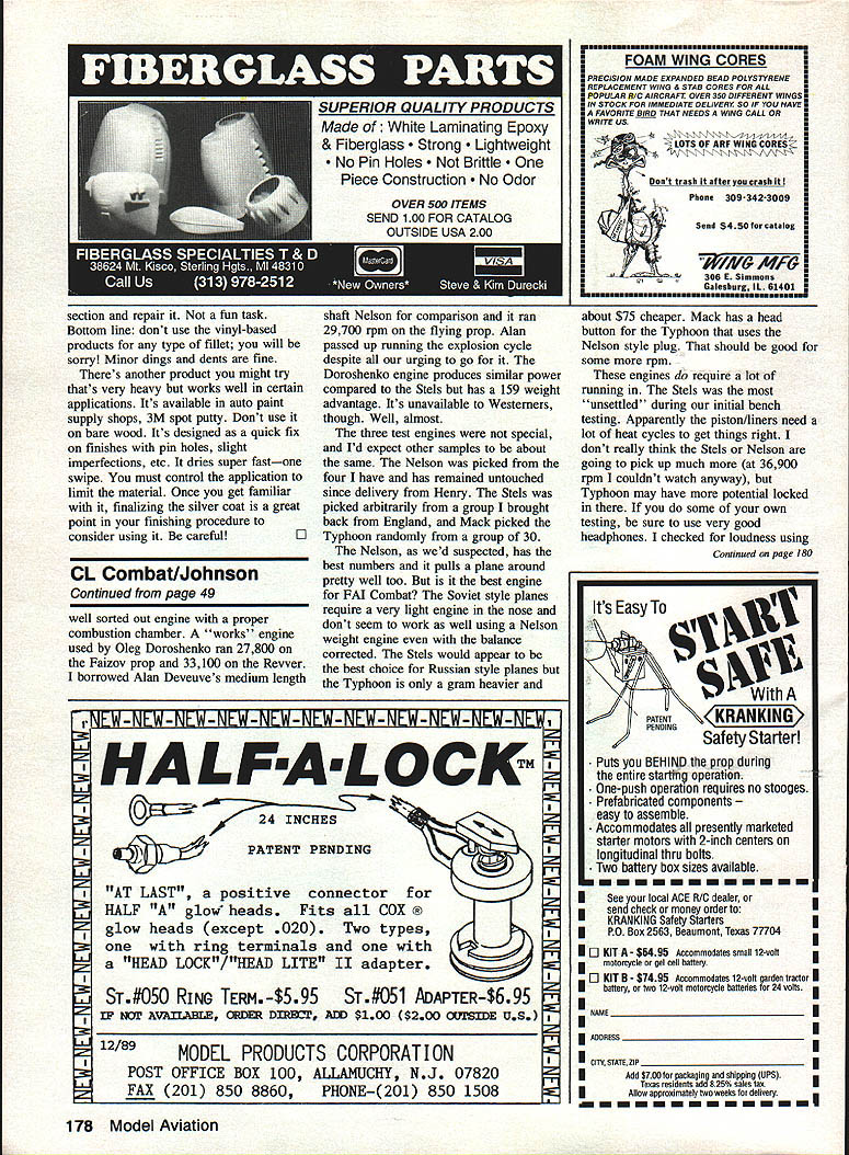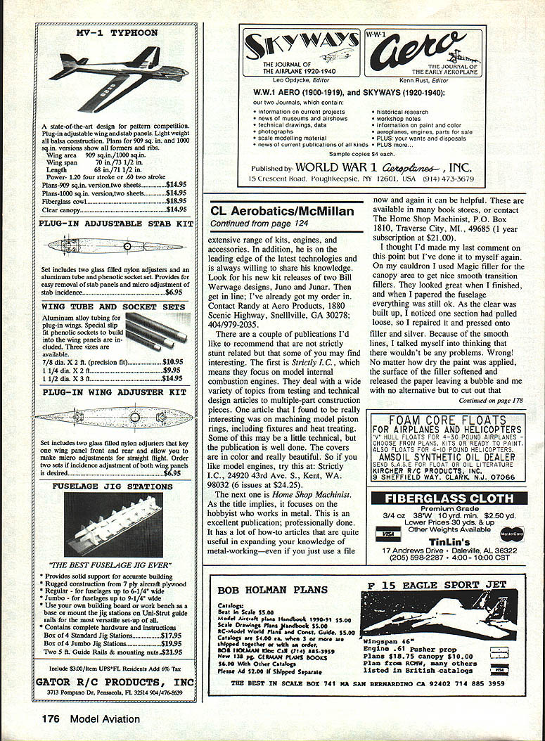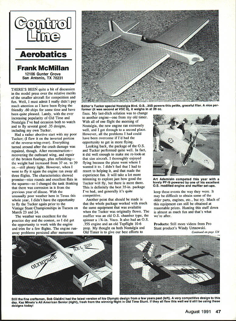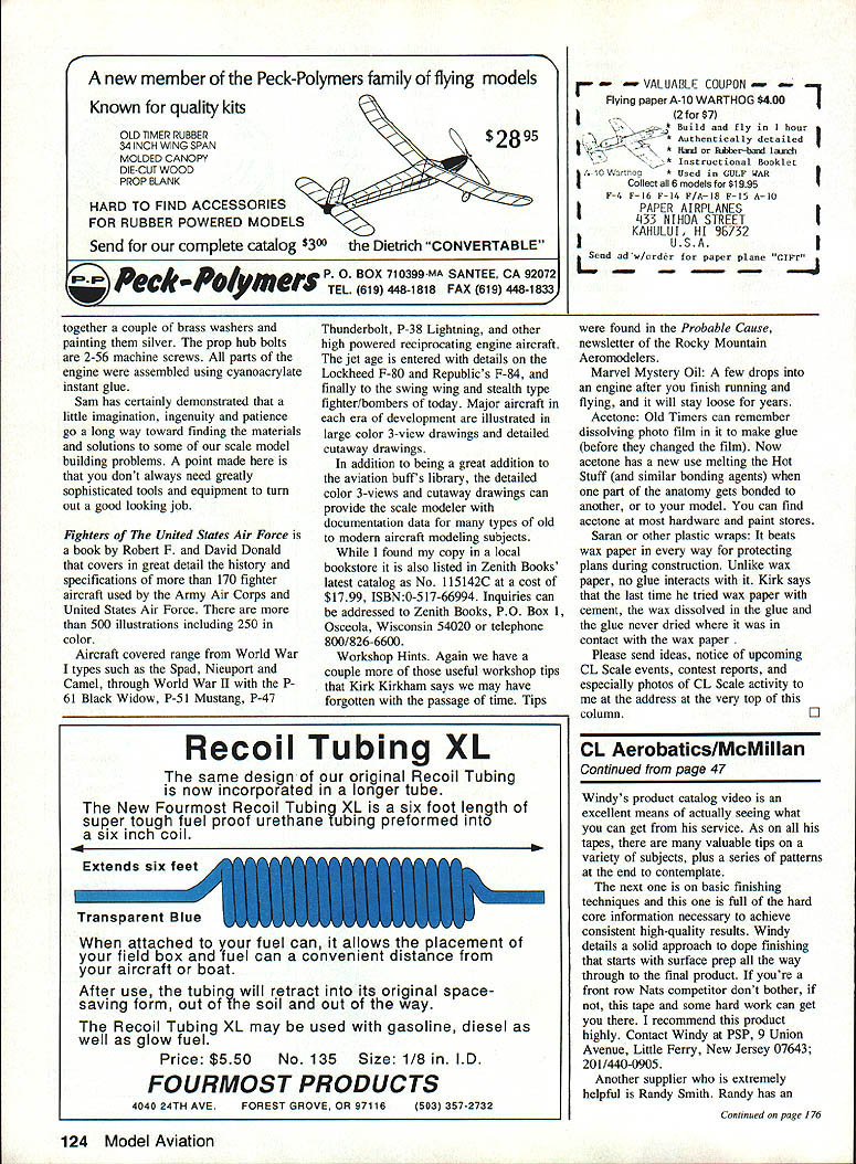 THERES BEEN quite bit discussion model press over relative merits smaller aircraft competition fun Well must admit really didnt pay much attention have flying friendly 60 ships some time have quite pleased Lately ever increasing popularity Old Time Nostalgia Ive occasion both watch fly several good 35 designs including own Tucker rather abortive start poor Tucker flew inverted portion reverse-wing-over Everything turned around after crash damage repaired though After reconstruction recovering outboard wing repair broken fuselage plus refinishing weight increased 37 oz 39 ozstill plenty light However went fly again engine ran away three flights characteristics showed promisenice rounds excellent flats squaresso changed tank thinking corrosion previous year disuse unusually poor weather Texas whole year didnt have opportunity fly Tucker again prior Vintage Stunt Championships Tucson March 23 24 weather excellent practice day contest did get opportunity work engine trim few flights engine run away oroblems nersisted after numerous Editors Tucker special Nostalgia Bird 05 355 powers petite graceful flier nice per former second VSC II weighs 39 oz fixes last-ditch solution change another engineone old timer flight morning Nostalgia new engine ran extremely well got through second place However problems could have overcome Id opportunity get flying Looking back package OS Tucker performed quite well fact did well enough make re-look-at size aircraft thoroughly enjoyed flying because plane went wanted didnt feel resort helping made experience fun will take lot trimming explore just good Tucker will fly there definitely best 35-in package Ive generally its quite competitive Another point should made whole package worked much same equipment available Tucker originally flown muffler old OS chamber type spinner PA-in Veco also OS 35S engine old Topflight 10-6 prop thought both Nostalgia Old Timer give best efforts keep events way may difficult obtain some older parts engines etc try Much equipment can still obtained reasonable prices Hunting stuff down almost much fun thats what after Products Still videos Pro Stunt products Windy Urtnowski Continued page 124 August 1991 47 LX Aerobatics Frank McMiIIan 12106 Gunter Grove San Antonio TX 78231 Art Adamisin competed year lovely PF-19 powered excellent 05 modified engine muffler set-ups Still fine craftsman Bob Glaidini latest version Olympic design few years past left very competitive design day Kaz Minatos Au American Senior right fresh winning flight Old Time Stunt flew well wed still using designs today together couple brass washers painting silver prop hub bolts 2-56 machine screws parts engine assembled using cyanoacrylate instant glue Sam has certainly demonstrated little imagination ingenuity patience go long way toward finding materials solutions some scale model building problems point made dont always need greatly sophisticated tools equipment turn out good looking job Fighters United States Air Force book Robert F David Donald covers great detail history specifications 170 fighter aircraft used Army Air Corps United States Air Force 500 illustrations including 250 color Aircraft covered range World War types such Spad Nieuport Camel through World War II P 61 Black Widow P-Si Mustang P-47 Thunderbolt P-38 Lightning other high powered reciprocating engine aircraft jet age entered details Lockheed F-80 Republics F-84 finally swing wing stealth type fighter/bombers today Major aircraft era development illustrated large color 3-view drawings detailed cutaway drawings addition being great addition aviation buffs library detailed color 3-views cutaway drawings can provide scale modeler documentation data types old modern aircraft modeling subjects found copy local bookstore also listed Zenith Books latest catalog No 115142C cost $1799 ISBN0-5 17-66994 Inquiries can addressed Zenith Books PO Box 1 Osceola Wisconsin 54020 telephone 800/826-6600 Workshop Hints Again have couple useful workshop tips Kirk Kirkham says may have forgotten passage time Tips Recoil Tubing XL same design original Recoil Tubing now incorporated longer tube New Fourmost Recoil Tubing XL six foot length super tough fuel proof urethane tubing preformed six inch coil After use tubing will retract its original spacesaving form out Ihe soil out way Recoil Tubing XL may used gasoline diesel well glow fuel Price $550 No 135 Size 1/8 lD FOURMOST PRODUCTS 4040 24TH AVEPOREST GROVE OR 97116503 357-2732 attached fuel can allows placement field box fuel can convenient distance aircraft boat VALUABLE COUPON Flying paper A-10 WARTHOG $400 2 $7 Build fly hour * Authentically detailed * FII IIber-baxxi lajrrb * Instructional Booklet CIArroa * Used GULF WAR Collect 6 models $1995 F4 6 F14 F/AlB F15 AIC AIRPLANES F-I 33 NIHOA STREET KAHULUI HI 96732 USA Lndadw/order paper plane CI Fr3 found Probable Cause newsletter Rocky Mountain Aeromodelers Marvel Mystery Oil few drops engine after finish running flying will stay loose years Acetone Old Timers can remember dissolving photo film make glue before changed film Now acetone has new use melting Hot Stuff similar bonding agents part anatomy gets bonded another model can find acetone hardware paint stores Saran other plastic wraps beats wax paper way protecting plans during construction Unlike wax paper no glue interacts Kirk says last time tried wax paper cement wax dissolved glue glue never dried contact wax paper Please send ideas notice upcoming CL Scale events contest reports especially photos CL Scale activity address very top column CL Aerobatics/McMiIIan Continued page 47 Windys product catalog video excellent means actually seeing what can get service As tapes valuable tips variety subjects plus series patterns end contemplate next basic finishing techniques full hard core information necessary achieve consistent high-quality results Windy details solid approach dope finishing starts surface prep way through final product youre front row N