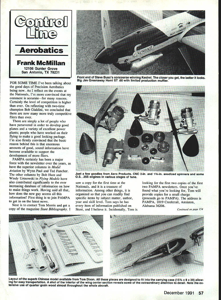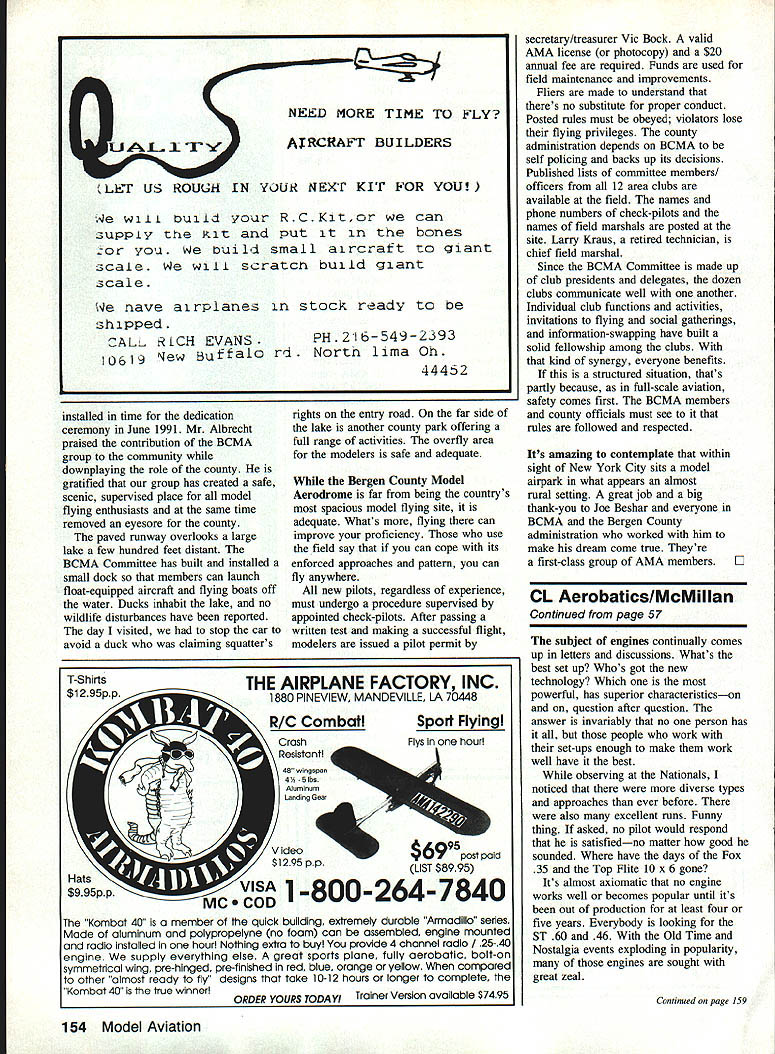 FOR SOME TIME Ive talking about good days Precision Aerobatics being now As reflect events Nationals Im convinced comment accuratefor reasons Certainly level competition higher ever reflecting two-time champion Bob Gialdini concluded now truly competitive fliers ever simply lot people have persevered order develop good planes variety excellent power plants people have worked flying make good looking package Im also firmly convinced basic reason behind enormous amounts good sound information have become available support development fliers PAMPA certainly has major force newsletter over years have superior columns Model Aviation Wynn Paul Ted Fancher other columns Bob Hunt Windy Urtnowski Flying Models have also contributed significantly ever increasing database information make things work Having said does new guy access information First thing join PAMPA get latest news Next contact Tom Morris get copy magazine Stunt Bibliography saw copy first time Nationals treasure information Among other things organized can readily find specific items subject matter author year skill level Tom says has item information published Stunt believe Incidentally Tom looking first two copies first two PAMPA newsletters Once youve found what youre looking Tom will provide copies small charge proceeds go PAMPA address PAMPA 1019 Creektrail Anniston Alabama 36206 December 1991 57 Lu Aerobatics Frank McMiIIan 12106 Gunter Grove San Antonio TX 78231 Front end Steve Busos concourse winning uestrei ne closer get better looks Big Jim Greenaway l4emi ST 60 limited production muffler Just few goodies Aero Products CNC 2-in 1 -in anodized spinners some OS 35S engines various stages tune Continued page 154 Layout superb Chinese model available Tom Dixon pieces designed fit carrying case 15 x 8 x 39 allow ing easy transportation shot interior wing center section reveals some extraordinary attention detail Note ex tensive use quarter grain wood almost throughout whole aircraft installed time dedication ceremony June 1991 Mr Albrecht praised contribution BCMA group community downplaying role county gratified group has created safe scenic supervised place model flying enthusiasts same time removed eyesore county paved runway overlooks large lake few hundred feet distant BCMA Committee has built installed small dock members can launch float-equipped aircraft flying boats off water Ducks inhabit lake no wildlife disturbances have reported day visited stop car avoid duck claiming squatters rights entry road far side lake another county park offering full range activities overfly area modelers safe adequate Bergen County Model Aerodrome far being countrys spacious model flying site adequate Whats flying can improve proficiency use field say can cope its enforced approaches pattern can fly anywhere new pilots regardless experience must undergo procedure supervised appointed check-pilots After passing written test making successful flight modelers issued pilot permit secretary/treasurer Vic Bock valid AMA license photocopy $20 annual fee required Funds used field maintenance improvements Fliers made understand theres no substitute proper conduct Posted rules must obeyed violators lose flying privileges county administration depends BCMA self policing backs up its decisions Published lists committee members/ officers 12 area clubs available field names phone numbers check-pilots names field marshals posted site Larry Kraus retired technician chief field marshal Since BCMA Committee made up club presidents delegates dozen clubs communicate well another Individual club functions activities invitations flying social gatherings information-swapping have built solid fellowship among clubs kind synergy everyone benefits structured situation thats partly because full-scale aviation safety comes first BCMA members county officials must see rules followed respected Its amazing contemplate within sight New York City sits model airpark what appears almost rural setting great job big thank-you Joe Beshar everyone BCMA Bergen County administration worked him make dream come true Theyre first-class group AMA members E CL Aerobatics/McMiIIan Continued page 57 subject engines continually comes up letters discussions Whats best set up Whos got new technology Which powerful has superior characteristicson question after question answer invariably no person has people work set-ups enough make work well have best observing Nationals noticed diverse types approaches ever before also excellent runs Funny thing asked no pilot would respond satisfiedno matter good sounded have days Fox 35 Top Flite 10 x 6 gone Its almost axiomatic no engine works well becomes popular until its out production least four five years Everybody looking ST 60 46 Old Time Nostalgia events exploding popularity engines sought great zeal Continued page 159 154 Model Aviation NEED MORE TIME TO FLY ARC1AFT BUILDERS LlT US ROUGI-i IN YUUR NEXT KIT FOR YOU will uiid RCKitor can supply ieit put bones Duild small aircratt giant scale will scratcfl build giant scale nave airplanes stock ready shipped CALL RICH EVANS PH216-549-2393 0619 ew Butfalo rd North lima Oh 44452 T-Shirts $1 295pp THE AIRPLANE FACTORY INC 1880 PINEVIEW MANDEVILLE LA 70448 R/C Combat Sport Flying CrashFlys hour Resistant 48 wingspan 4 -SIba Aluminum Landing Gear V deo 4$ 6995post paid $1295ppLIST$8995 0-264-7840 Kombat 40 member quick building extremely durable ArmadIllo series Made aluminum polypropelyne no foam can assembled engine mounted radio installed hourl Nothing extra buyl provide 4 channel radio / 25-40 engine supply everything else great sports plane fully aerobatic bolt-on symmetrical wing pre-hinged pre-finished red blue orange yellow compared other almost ready fly designs take 10-12 hours longer complete Kombat 40 true winnerl ORDER YOURS TODAVI Trainer Version available $7495