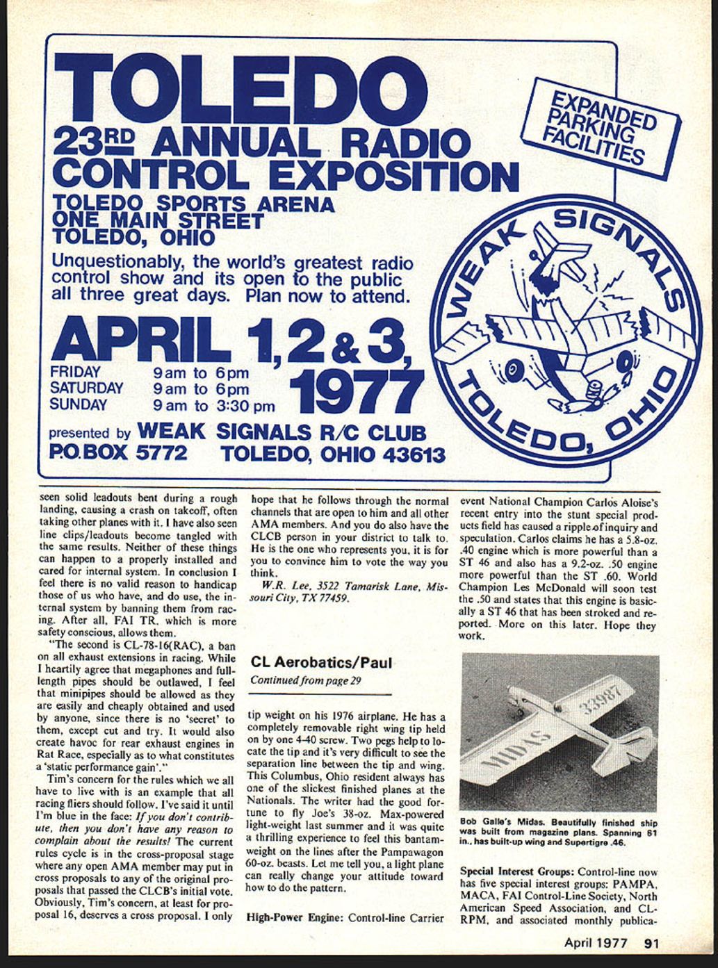 Aerobahcs AT LAST California Nationals. visions perfect weather 5- 10-mph winds sunup sundown surfing afternoons Disney Land sun shine least thats what Whitely Fancher keep writing us look out window rain big bash will March AFB near Riverside August 7-14 Look Junior Senior stunt held Tuesday August 9 year Open qualifications take place Wednesday Thursday Open fi nals Friday Walker Cup fly offs Half-A stunt will probably flown Saturday August 13 PAMPA banquet must night format days competition probable writing sub ject some change PAMPA offi cers Nats management finalize plans event director Precision Aero batics 1977 Nationals will Arlie Preszler architect vocation popular WAM contest director Arlie has fantastic reputation running great contests California area having tended flown Nationals Lake Charles Dayton familiar problems magnitude Nats certainly some WAM con tests have contestants Na tionals stunt Arlie CDed Half-A event 76 Nats did fine job has published Headwind bulletin Lodi Model Association past nine years strong organiza tion administration PAMPA very fortunate have seasoned event direc tor such Arlie volunteer job Wynn Paul Arlie has persuaded inveigled Lanny Shorts serve assistant event di rector Lanny owner Standard Hobbies Lodi California has worked Arlie times contests Three stunt judges have already tentatively selected applicants Other qualified stunt judges interested serving Nationals should write Arlie 221 West Oak Street Lodi California 95240 telephone 209-368-7538 Give brief resume qualifications plus some refer ences state availability during Na tionals week Eight 12 judges need ed Open qualifications Wednesday Thursday consistent judges being retained finals Walker Cup flyofis Six eight judges will needed Junior Senior stunt Tuesday Open judges should plan Nats training practice warmups Monday August 8 travel allowance judges furnished AMA well lodging dorms Volunteers backup workers needed entire week recorders judge runners tabulations clerks pull-test workers flight-line supervisors scoreboard operators clean up persons go-fers Fliers families fliers other interested persons should write Arlie Preszler give specific days times can help ie Wednesday morning Friday afternoon past three years PAMPA has created stant tradition everyone pitching helping during week lets keep up According last years FAI team man ager Doc Jackson will prob ably three different sites FAI team selections coming summer Combat likely will fly St Louis July Speed Team Race likely will select representatives Nation als Precision Aerobatics likely will have team selection over Labor Day weekend writing number site appears Atlanta Georgia flying site abandoned airstrip room about eight ten circles site conditions excellent circles being close hangar Atlanta has large number stunt en thusiasts can help run tryouts Other site possibilities St Louis Dallas Cleveland Direct correspon dence about FAI team tryouts PAMPA President Keith Trostle 10900 Phillips Dr Upper Marlboro Md 20870 Removable Tip As another fine example Joe Reinhards building techniques take look accompanying picture Joes method setting up adjustable Continued page 91 April 1977 29 Underdog 1/2A Stunter Danny Daniel 2/3-size Nobler Cox Medallian 33-in span 16 oz fuel 1 33-oz fuel tank Joe Reinhards removable tip-adjustable weight set-up 1976 version Snoopy Tip held 4-40 screw pix Wynn Paul Loudenslager version Stevens Akro Jon Ramsden Stoit 54-in foam wing Superpoxy metallic blue weight 58 oz. Enya 45 12/6 TOLEDO 23 ANNUAL RADIO CONTROL EXPOSITION TOLEDO SPORTS ARENA ONE MAIN STREET TOLEDO OHIO Unquestionably worlds control show its open three great days Plan greatest radio public now attend APRIL 12&3 FRIDAY 9am 6pm SUNDAY9 am 330 pm 197k SATURDAY9am 6pm presented WEAK SIGNALS R/C CLUB P0 BOX 5772 TOLEDO OHIO 43613 XPAAI IZACIL 4 solid leadouts bent during rough landing causing crash takeoff often taking other planes have also seen line clips/leadouts become tangled same results Neither things can happen properly installed cared internal system conclusion feel no valid reason handicap us have use ternal system banning rac ing After FAI TR safety conscious allows second CL-78-16RAC ban exhaust extensions racing heartily agree megaphones fulllength pipes should outlawed feel minipipes should allowed easily cheaply obtained used anyone since no secret except cut try would also create havoc rear exhaust engines Rat Race especially what constitutes static performance gain Tims concern rules have live example racing fliers should follow Ive said until Im blue face dont contrib ute dont have reason complain about results current rules cycle cross-proposal stage open AMA member may put cross proposals original pro posals passed CLCBs initial vote Obviously Tims concern least pro posal 16 deserves cross proposal hope follows through normal channels open him other AMA members also have CLCB person district talk represents you convince him vote way think WR Lee 3522 Tamarisk Lane Mis souri City TX 77459 ci Aerobatics/Paul Continued page 29 tip weight 1976 airplane has completely removable right wing tip held 4-40 screw Two pegs help lo cate tip its very difficult see separation line between tip wing Columbus Ohio resident always has slickest finished planes Nationals writer good tune fly Joes 38-oz Max-powered light-weight last summer quite thrilling experience feel bantam weight lines after Pampawagon 60-oz beasts Let tell light plane can really change attitude toward pattern High-Power Engine Control-line Carrier event National Champion Carlos Aloises recent entry stunt special prod ucts field has caused ripple inquiry speculation Carlos claims has 58-oz 40 engine powerful ST 46 also has 92-oz 50 engine powerful ST 60 World Champion Les McDonald will soon test 50 states engine basic ally ST 46 has stroked re ported later Hope work Special Interest Groups Control-line now has five special interest groups PAMPA MACA FAI Control-Line S