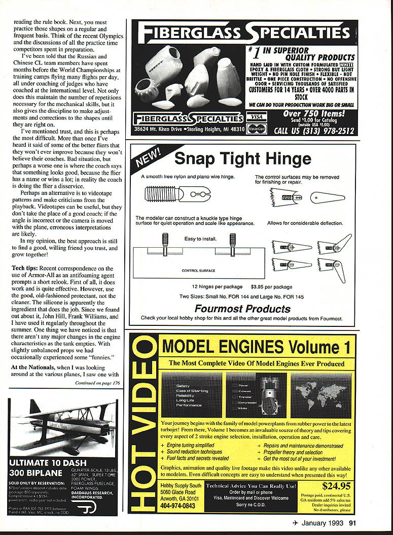 IC ONTROL LINE THE EXPECTATION 1993 Nationals going held Lubbock Texas really makes happy wont have drive 2000 miles way get Nationals wait Texas being bigger life Texans known sayhow far will have go Well turns out its seven-hour drive San Antonio however Riley Wooten Lone Star Balsa says its worth talked Riley week before site selection committee visit really enthusiastic over sense people Lubbock want Nationals will best provide outstanding site superior support said plenty practice circles would available no worries Riley did point out few things about Lubbock should consider plan next years killer plane First Lubbock 3500-ft altitude air will much thinner have used sites such Westover Virginia Beach Expect power will down turn slower usual illustrate Riley told tale about Malcolm Windham Malcolm northern Texas noted excellent flier potential win Nationals As far remember placed quite high Nationals entered mid-1950s drew raves Fox 59-powered ship Now Lubbock having local meet Malcolm called Riley received invite stay him decided go out practice before contest course Riley warned Malcolm ease bottoms till got feel plane turned altitude Undaunted AEROBA TICS 1 Malcolm laid 6-ft bottom ripped out landing gear plane just didnt have lift make snappy turn become accustomed back home near sea level After incident went back Rileys house repaired plane tried again next daycontest dayand bit caution got used turn won contest Just word wise tuck away mind Tragically Malcolm fatally burned cleaning motorcycle gasoline some months later other factor consider hot Texas weather time year average temperature will mid high 90s lows high 70s Also although its normally quite windy early summer chances good late July winds will moderating very pleasant mornings evenings will undoubtedly face some very high temperatures good physical condition bring some own shade like tarps etc necessary considerations remind predictions about Reno 84 built ultralight planes combat high altitude Most ultralights however never saw light competition because generally sacrificed construction werent rigid enough fly well competitors also brought old planes although flown faster compensate thinner air proved quite satisfactory bottom line going can anticipate adjustments necessary come 45-oz 700-sq-in monster five-horsepower 40 tuned-pipe attacker Nevertheless Texas proud AMA has selected Lubbock Im sure everyone attends will enjoy competition opportunity visit great Lone Star state plan come go another subject Id like comment again necessity good coaching improve climb ladder time talk anyone subject flying comes upwhich times doesntwe usually talk planes engines talk about coaching vital work good coach establish bond trust two points First have visualize maneuver geometry much difficult 90 Model Aviation er Tom Dixons latest Nostalgia effort Powered Fox 35 44-oz model superb flier Another winner Allen Brickhaus OTS Nostalgia event Smoothie rebuilt after crash 1990 victorious F2B team Former world champions Bob Hunt Amy Scott poses dad Mikes Lucky Dallas Texas Ship Bill Werwage newly crowned champion Paul Walker rework Stiletto 475 oz its good flier Mike credits Congratulations job well done Windys videos help finishing reading rule book Next must practice shapes regular frequent basis Think recent Olympics discussions practice time competitors spent preparation Ive told Russian Chinese CL team members have spent months before World Championships training camps flying flights per day under coaching judges have coached international level does maintain number repetitions necessary mechanical skills also gives discipline make adjust ments corrections shapes until right Ive mentioned trust perhaps difficult once Ive heard said some better fliers wont ever improve because wont believe coaches Bad situation perhaps worse coach says something looks good because flier has name wins lot reality coach doing flier disservice Perhaps alternative videotape patterns make criticisms playback Videotapes can useful dont take place good coach angle incorrect camera moved plane erroneous interpretations likely opinion best approach still find good willing friend trust grow together Tech tips Recent correspondence use Armor-All antifoaming agent prompts short relook First does work quite effective However use good old-fashioned protectant cleaner silicone apparently ingredient does job Since found out about John Hill Frank Williams have used regularly throughout summer thing have noticed arent major changes engine characteristics tank empties slightly unbalanced props occasionally experienced some funnies Nationals looking around various planes saw Snap Tight Hinge smooth free nylon piano wire hinge modeler can construct knuckle type hinge surface quiet operation scale like appearance U control surfaces may removed finishing repair ciiiizzz Allows considerable deflection Easy install Li CONTROL SURFACE 12 hinges per package $395 per package Two Sizes Small No FOR 144 Large No FOR 145 Fourmost Products Check local hobby shop other great model products Fourmost MODEL ENGINES Volume 1 journey begins family model powerplants rubber power latest turbojet Volume 1 becomes invaluable source theory tips covering aspect 2 stroke engine selection installation operation care Engine tuning simplitied Sound reduction techniques Fuel facts secrets revealed Repairs maintenance demonstrated Propeller theory selection Get out investmentl Graphics animation quality live footage make video unlike other available modelers difficult concents P2ev understand presented way Hobby Supply South$2495 5060 Glade RoadPostage paid continental US Acworth GA 30101GA residents add 5% sales tax 404-9740843Orator inquiries invited No distributors please January1993 91 Continued page 176 Most Comniete Video Model Engines Ever Produced 730 Snapper$650 CL Based classic 1954 1/2A Snapper 48/2-in-span midwing profile stunter designed around Fox 35 will handle almost 25-35 engine 