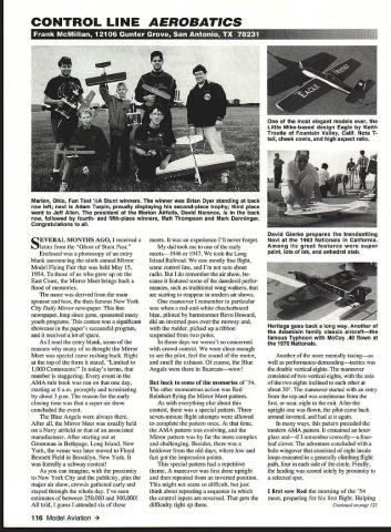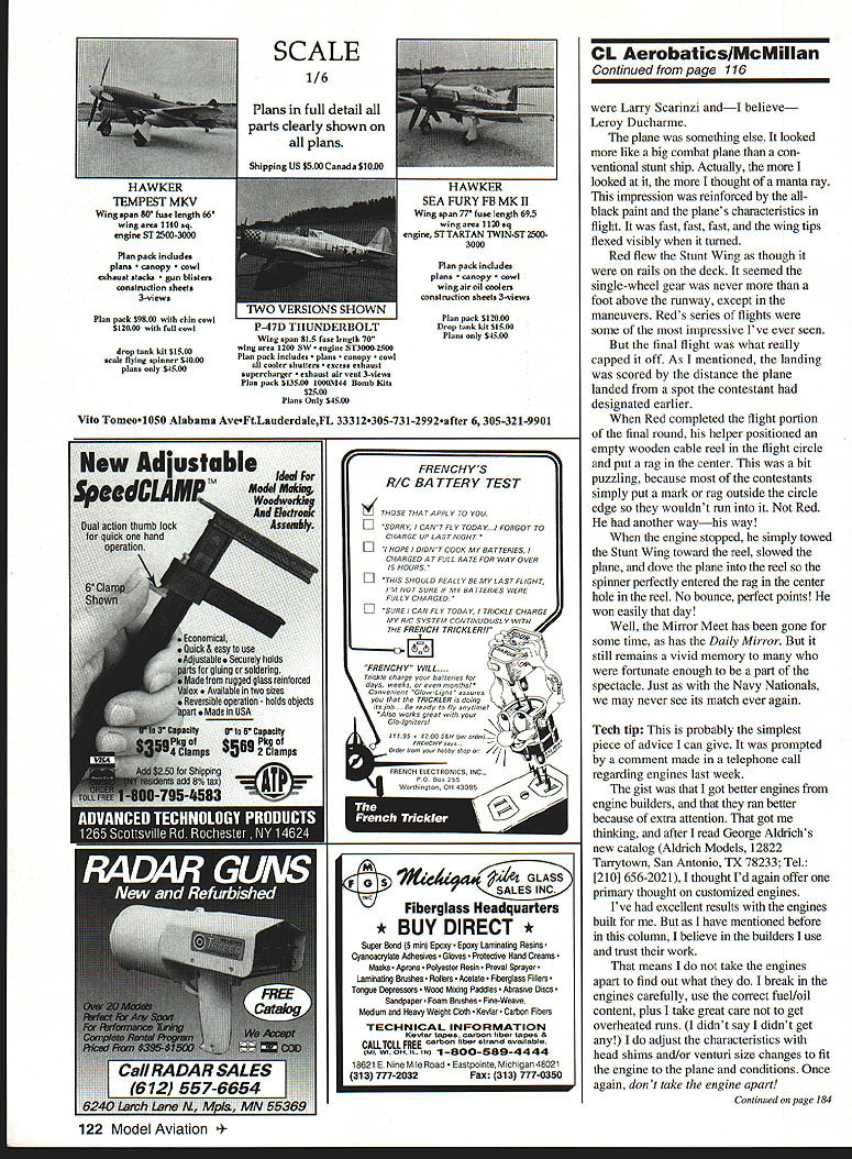 CONTROL LINE AEROBATICS Congratulations SEVERAL MONTHS AGO received letter Ghost Stunt Past Enclosed photocopy entry blank announcing ninth annual Mirror Model Flying Fair held May 15 1954 us grew up East Coast Mirror Meet brings back flood memories name derived main sponsor host then-famous New York City Daily Mirror newspaper fine newspaper long since gone sponsored youth programs contest significant showcase papers successful program received lot space As read entiy blank some reasons us thought Mirror Meet special came rushing back Right top form stated Limited 1000 Contestants todays terms number staggering event AMA rule book run day starting 6 am promptly terminating about 3 pm reason early closing time super air show concluded event Blue Angels always After Mirror Meet usually held Navy airfield associated manufacturer After starting out Grumman Bethpage Long Island New York venue later moved Floyd Bennett Field Brooklyn New York literally subway contest As can imagine proximity New York City publicity plus major air show crowds gathered early stayed through whole day Ive seen estimates between 250000 300000 told guess attended six meets experience Ill never forget dad took early meets1946 1947 took Long Island Railroad saw mostly free flight some control line Im sure about radio remember air show cause featured some daredevil perfor mances such traditional wing walkers starting reappear modem air shows maneuver remember particular red-and-white checkerboard bipe piloted barnstormer Bevo Howard did inverted pass over runway rudder picked up ribbon suspended two poles days werent concerned crowd control close enough see pilot feel sound motor smell exhaust course Blue Angels Bearcatswow back some memories 54 other momentous action Red Reinhart flying Mirror Meet pattern As everything else about contest special pattern Three seven-minute flight attempts allowed complete pattern once time AMA pattern evolving Mirror pattern far complex challenging Besides holdover old days low fast got impression points special pattern repetitive theme maneuver first done upright repeated inverted position might seem difficult just think about repeating sequence control inputs reversed gets difficulty right up Another mentally taxingas well performance-demandingtactics double vertical eights maneuver consisted two vertical eights axis two eights inclined other about 300 maneuver started entry top continuous first near eight exit After upright flown pilot came back around inverted again ways pattern preceded modern AMA pattern contained hour glass andif remember correctlya fourleaf clover adventure concluded bob wingover consisted eight inside loops executed generally climbing flight path four side circle Finally landing scored solely proximity selected spot first saw Red morning 54 meet preparing first flight Helping Continued page 122 116 Model Aviation ant models ever Little Mike-based design Eagle Keith Trostle Fountain Valley Calif Note T tail cheek cowls high aspect ratio Marion Ohio Fun Test hA Stunt winners winner Brian Dyer standing back row left next Adam Turpin proudly displaying second-place trophy third place went Jeff Allen president Marion Airfoils David Narance back row followed fourth- fifth-place winners Mall Thompson Mark Denninger David Gierke prepares trendsetting Novi 1963 Nationals California Among its great features super paint lots ink anhedral stab Heritage goes back long way Another Adamisin family classic aircraftthe famous Typhoon McCoy 40 flown 1970 Nationals HAWKER SEA FURY FB MK II Wing span 7T fuse length 695 wing area 1120 sq engine ST TARTAN TWIN-ST 25003000 Plan pack indudes plans canopy wing air oil coolers consinaction sheets 3-views Plan pack $12000 Drop tank kit $1500 Plans $4500 Vito TomeonlOSO Alabama AveFtLauderdaleFL 33312o305-731-2992after 6305-321-9901 FRENCH VS RIG BATTERY TEST THOSE THATAPPLY TO YOU EZ SORRYICANTELYTOOAY.IFOROOTTO CHARGE UP LAST NIGHT D OIONT COOK MY BATTERIES CHARGEOATFULL RATE FOR WAY OVER 16 HOURS D THIS SHOULO REALLYBEMYLASTELIGHT IM NOT SURE IF MYRA TTERIES WERE FULLY CHARGEO D SURE/CAN FLY TODAY TRICKLE CHARGE MY RIC SYSTEM CONTINUOUSLY WITH THE FRENCH TRICKLERh FRENCHY WILL.. Trio/ole charge batteries days weeks eves wostbsI Cosoesien GlowLight assores Es TRICKLER dolog its job..Be ready toRy asytistel AIsO works great CL AerobaticslMcMillan Continued page 116 Larry Scarinzi andI believe Leroy Ducharme plane something else looked like big combat plane con ventional stunt ship Actually looked thought manta ray impression reinforced allblack paint planes characteristics flight fast fast fast wing tips flexed visibly tumed Red flew Stunt Wing though rails deck seemed single-wheel gear never foot above runway except maneuvers Reds series flights some impressive Ive ever seen final flight what really capped off As mentioned landing scored distance plane landed spot contestant designated earlier Red completed flight portion final round helper positioned empty wooden cable reel flight circle put rag center bit puzzling because contestants simply put mark rag outside circle edge wouldnt run Red another wayhis way engine stopped simply towed Stunt Wing toward reel slowed plane dove plane reel spinner perfectly entered rag center hole reel No bounce perfect points won easily day Well Mirror Meet has gone some time has Daily Mirror still remains vivid memory fortunate enough part spectacle Just Navy Nationals may never see its match ever again Tech tip probably simplest piece advice can give prompted comment made telephone call regarding engines last week gist got better engines engine builders ran better because extra attention got thinking after read George Aldrichs new catalog Aldrich Models 12822 Tarrytown San Antomo TX 78233 Tel [210] 656-2021 thought Id again offer primary thought customized engines Ive excellent results engines built have mentioned before column believe builders use trust work means take engines apart find out what b