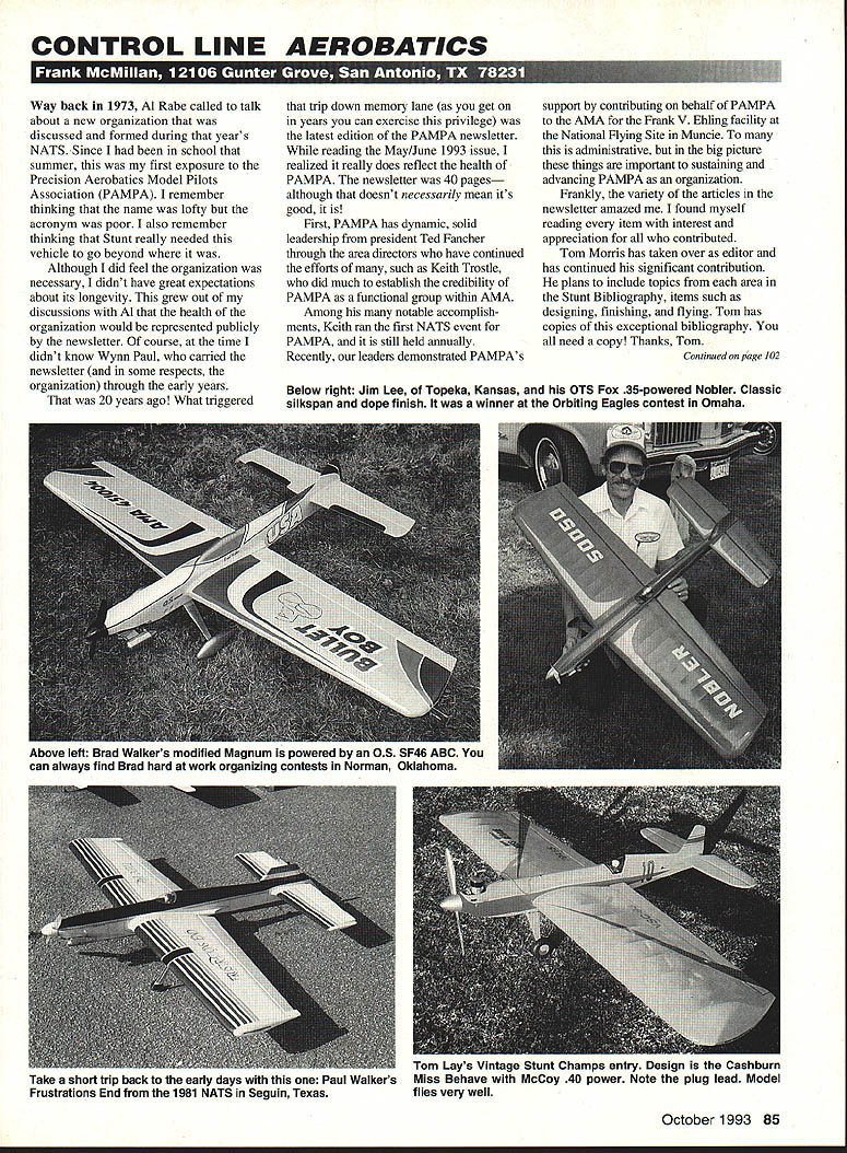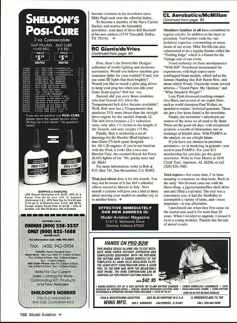 CONTROL LINE AEROBATICS V --hEIU Way back ja 1973 Al Rabe called talk about new organization discussed formed during years NATS Since school summer first exposure Precision Aerobatics Model Pilots Association PAMPA remember thinking name lofty acronym poor also remember thinking Stunt really needed vehicle go beyond Although did feel organization necessary didnt have great expectations about its longevity grew out discussions Al health organization would represented publicly newsletter course time didnt know Wynn Paul carried newsletter some respects organization through early years 20 years ago What triggered trip down memory lane get years can exercise privilege latest edition PAIVIPA newsletter reading May/June 1993 issue realized really does reflect health PAMPA newsletter 40 pages although doesnt necessarily mean its good First PAMPA has dynamic solid leadership president Ted Fancher through area directors have continued efforts such Keith Trostle did much establish credibility PAMPA functional group within AMA Among notable accomplish ments Keith ran first NATS event PAMPA still held annually Recently leaders demonstrated PAMPAs support contributing behalf PAMPA AMA Frank V Ebling facility National Flying Site Muncie administrative big picture things important sustaining advancing PAMPA organization Frankly variety articles newsletter amazed found myself reading item interest appreciation contributed Tom Morris has taken over editor has continued significant contribution plans include topics area Stunt Bibliography items such designing finishing flying Tom has copies exceptional bibliography need copy Thanks Tom Continued page 102 Below right Jim Lee Topeka Kansas OTS Fox 35-powered Nobler Classic silkspan dope finish winner Orbiting Eagles contest Omaha October 1993 85 Above left Brad Walkers modified Magnum powered OS SF46 ABC can always find Brad hard work organizing contests Norman Oklahoma Tom Lays Vintage Stunt Champs entry Design Cashburn Take short trip back early days Paul Walkers Miss Behave McCoy 40 power Note plug lead Model Frustrations End 1981 NATS Seguin Texas flies very well SHIPPING & HANDLING UPS Ground Continental US $495 UPS Air & Parcel Post $495 plus 10% Subtotal Continental US UPS Nest Day Air $1400 plus $100 per lb Shipment total 000 add $395 Foreign Orders Parcel Post Air $495 20% ot Subtotal US Mail $495 plus tO% ot Subtotal become common newsletter since Mike Pugh took over editorial duties become member Navy Carrier Society receive bimonthly newsletter send dues $6 Bill Bischoff new address 3734 Truesdell Dallas TX 75244 4RC Giants/deVries Continued page 60 First theres British Ibis Designs collection model lighting electronic accessories Would believe machine gun simulator lights warbird Could use some ID lights flash brightly Would like install glow plug driver keep plug hot idle Giant Scale engine Bob has em Second did envy modelers Zenoah 62s Torquemaster belt drive became available Well Bob now has Torquemaster produces 51% thrust straight drive engine smaller Zenoah 22 belt drive features 21 reduction ratio adds 11/2 inches length Zenoah weighs 1 lbs Finally Bob marketing set drawings Hawker Hind biplane true Giant 73-inch span designed 90-120 engines youre familiar Hind looks like two-seat Hawker Fury standard Royal Air Force RAF fighter 30s pointy nose Slick information write Bob PO Box 741 San Bernardino CA 92402 just about does month may aware MA s editorial offices moved Muncie July Next months column will give hint three about moving models another city another house 4CL Aerobatics/McMiIIan Continued page 85 Members familiar have committed regular articles addition input president Ted Fancher lends vast technical expertise commenting facets event Mike Keville has also volunteered regular feature called Trailing Edge forum Vintage side event Noted authority Stunt aerodynamics Wild Bill Netzeband documented experiments high-aspect-ratio nonflapped Stunt models led famous Humbug Bob Baron flew about Windy Urtnowski wrote several articlesTuned Pipes Opinion What Should Weigh Luey Pyatt discussed coaching compet itive fliers several expert fliers such world champion Paul Walker re sponded readers technical questions just few items found newsletter Finally newsletters advertisers sources items need fly Stunt good old days exceptional products wealth information exchange helpful ideas PAMPA catalyst see bright future have interest precision aerobaticsor modeling generalyou need join PAMPA $15 membership fee also get great newsletter Write Tom Morris 1019 Creek Trail Anniston AL 36206 call 205 820-1983 Tech topics some time Ive meaning comment shop tools Back early 60s Dremel came out Moto-Shop jigsawlsander/flex-shaft drive unit filled real need unit convenient size flexibility accomplish variety tasks andmost importantit affordable purchased first came market used 25 years decided upgrade passed young modeler Therein lies tale mixed results 102 Model Aviation S ON PRO-BOW THIS UNIQUE DEVICE ALLOWS YOU TO CUT ACCU RATE WING CORES WITHOUT EXPENSIVE AND COMPLICATED EQUIPMENT WITH THE PRO-BOW THE CUTTING WIRE IS GUIDED DIRECTLY AT THE TEMPLATES BY HAND HELD INSULATOR CLIPS THE HEAVY-DUTY CONSTRUCTION GIVES GOOD FEEL TO THE BOW AND WITH THE ADJUSTABLE HEAT PROBE THE WIRE TEMPERATURE CAN BE CONTROLLED FOR PERFECT CUTTING RESULTS sale $4295 WORKS DIRECTLY OFF OF 12 VOLT BATTERY OR 10 AMP BATTERY CHARGER S COMPLETELY ASSEMBLED STRAIGHT OR TAPERED CORES IAL PASSIVE RESISTANCE CUTTING WIRE LATED STEEL FRAME CUTTING TECIINIDUES & OPERATING INSTRUCTIONS INCLUDED UP TO 41 SEND $500 FOR B0 PAGE CATALOG VISA & MASTER CARD ACCEPTEDADD $500 SHIPPING IN USAIL RESIDENTS ADD 7% TAX WING MFG 306 E SIMMONS GALESBURO IL 61401 CALL 309-342-3009 type building requires ability Cut obvious outside fine cuts inside cuts lighten parts requires jigsaw detachable blade can feed through hole make cut repeat procedure Dremel saw did conveniently blade Dremel has pin end tension b