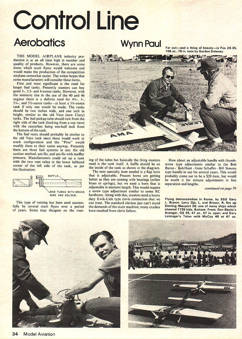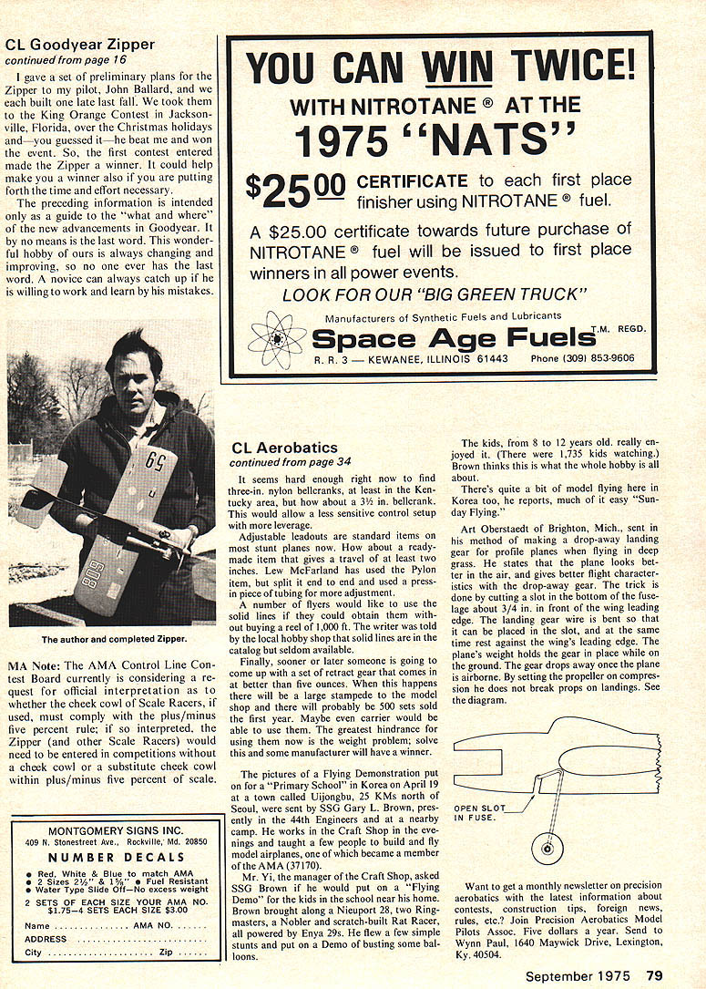 Control Line Aerobatics THE MODEL AIRPLANE industry pro duction time high number quality products However some items stunt flyers would welcome would make production competition airplane somewhat easier writer hopes some manufacturers will consider items First significant need larger fuel tanks Presently stunters can buy good 3- 35- 4-ounce tanks However meteoric rise use 40 46 engines definite need 4- 5- 51/4. 5-ounce tanksat least 5Y4-ounce tank would made tanks should two inches wide inch height similar old Veco now Clary tanks fuel pickup tube should exit right side tank looking top view centerline being one-half inch bottom tank fuel vents should probably similar old Veco tank since would work stock configuration Pros would modify tastes anyway Presently three fuel systems use old suction method uni-flo uni-flo muffler pressure Manufacturers could set up tank two vent tubes lower lefthand corner left side tank per illustration BAFFLE BIND TUBING WITH BRASS WIRE AND SOLDER type venting has used success fully several stunt flyers over period years Some may disagree routWynn Paul ing tubes basically thing stunters need tank itself baffle should inside tank shown diagram next specialty item needed flap horn adjustable Present horns getting better coming bearings either brass springs need horn adjustable moment length would require screw type adjustment similar some RC hardware Along stunters need heavy duty Kwik-Link type clevis connection can trust standard devises just cant stand demands stunt machine crashes have resulted clevis failure Far outand thing beautyis Fox 29-35 106 oz. 76 twin Gordon Delaney about adjustable handle thumb screw type adjustments similar Bob Baron Bob Hunt Gene Schaffer Bill Simons type handle use several years would probably come out $20 item would worth minute adjustments line separation lengths continued page 79 34 Model Aviation Flying demonstration Korea SSG Gary 1 Brown Larry Oja 1 Brown R tire up Sterling Nieupors 28 ships whieh cheered 1735 kids Bottom Front Don Shultzs Avenger OS 35 47 oz. 57 span Gary Letsingers Talon McCoy 40 47 oz CL Goodyear Zipper continued page 16 gave set preliminary plans Zipper pilot John Ballard built late last fall took King Orange Contest Jackson ville Florida over Christmas holidays guessed beat won event So first contest entered made Zipper winner could help make winner also putting forth time effort necessary preceding information intended guide what new advancements Goodyear no means last word wonder ful hobby always changing improving no ever has last word novice can always catch up willing work learn mistakes MA Note AMA Control Line Con test Board currently considering re quest official interpretation whether cheek cowl Scale Racers used must comply plus/minus five percent rule interpreted Zipper other Scale Racers would need entered competitions cheek cowl substitute cheek cowl within plus/minus five percent scale CL Aerobatics continued page 34 seems hard enough right now find three-in nylon belleranks least Ken tucky area about 3 bellerank would allow less sensitive control setup leverage Adjustable leadouts standard items stunt planes now about readymade item gives travel least two inches Lew McFarland has used Pylon item split end end used pressin piece tubing adjustment number flyers would like use solid lines could obtain out buying reel 1000 ft writer told local hobby shop solid lines catalog seldom available Finally sooner later someone going come up set retract gear comes better five ounces happens will large stampede model shop will probably 500 sets sold first year Maybe carrier would able use greatest hindrance using now weight problem solve some manufacturer will have winner pictures Flying Demonstration put Primary School Korea April 19 town called Uijongbu 25 KMs north Seoul sent SSG Gary L Brown pres ently 44th Engineers nearby camp works Craft Shop eve nings taught few people build fly model airplanes became member AMA 37170 Mr Yi manager Craft Shop asked SSG Brown would put Flying Demo kids school near home Brown brought along Nieuport 28 two Ringmasters Nobler scratch-built Rat Racer powered Enya 29s flew few simple stunts put Demo busting some bal loons kids 8 12 years old really en joyed 1735 kids watching Brown thinks what whole hobby about Theres quite bit model flying Korea too reports much easy Sun day Flying Art Oberstaedt Brighton Mich sent method making drop-away landing gear profile planes flying deep grass states plane looks bet ter air gives better flight character istics drop-away gear trick done cutting slot bottom fuse lage about 3/4 in front wing leading edge landing gear wire bent can placed slat same time rest against wings leading edge planes weight holds gear place ground gear drops away once plane airborne setting propeller compres sion does break props landings See diagram OPEN SLOT IN FUSE Want get monthly newsletter precision aerobatics latest information about contests construction tips foreign news rules etc Join Precision Aerobatics Model Pilots Assoc Five dollars year Send Wynn Paul 1640 Maywick Drive Lexington Ky 40504 September 1975 79 YOU CAN WIN TWICE WITH NITROTANE HE 1975 NATS $2500 CERTIFICATE first place finisher using NITROTANE $2500 certificate towards future purchase NITROTANE will issued first place winners power events LOOK FOR OUR BIG GREEN TRUCK Manufacturers Synthetic Fuels Lubricants Space Age FuelsT R R 3 NEE ILLINOIS 61443Phone 309 853-9606 author completed Zipper MONTGOMERY SIGNS INC 409 N Stosestreet Ave Rockville Md 20850 NUMBER DECALS Red White & Blue match AMA 2 Sizes 24 & 1% Resistant Water Type Slide OffNo excess weight 2 SETS OF EACH SIZE YOUR AMA NO $1754 SETS EACH SIZE $300 Name A NO ADDRESS City p