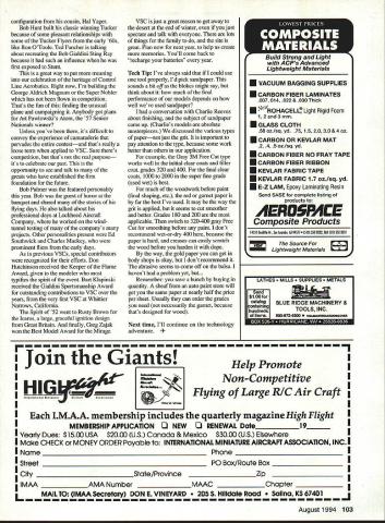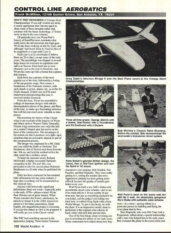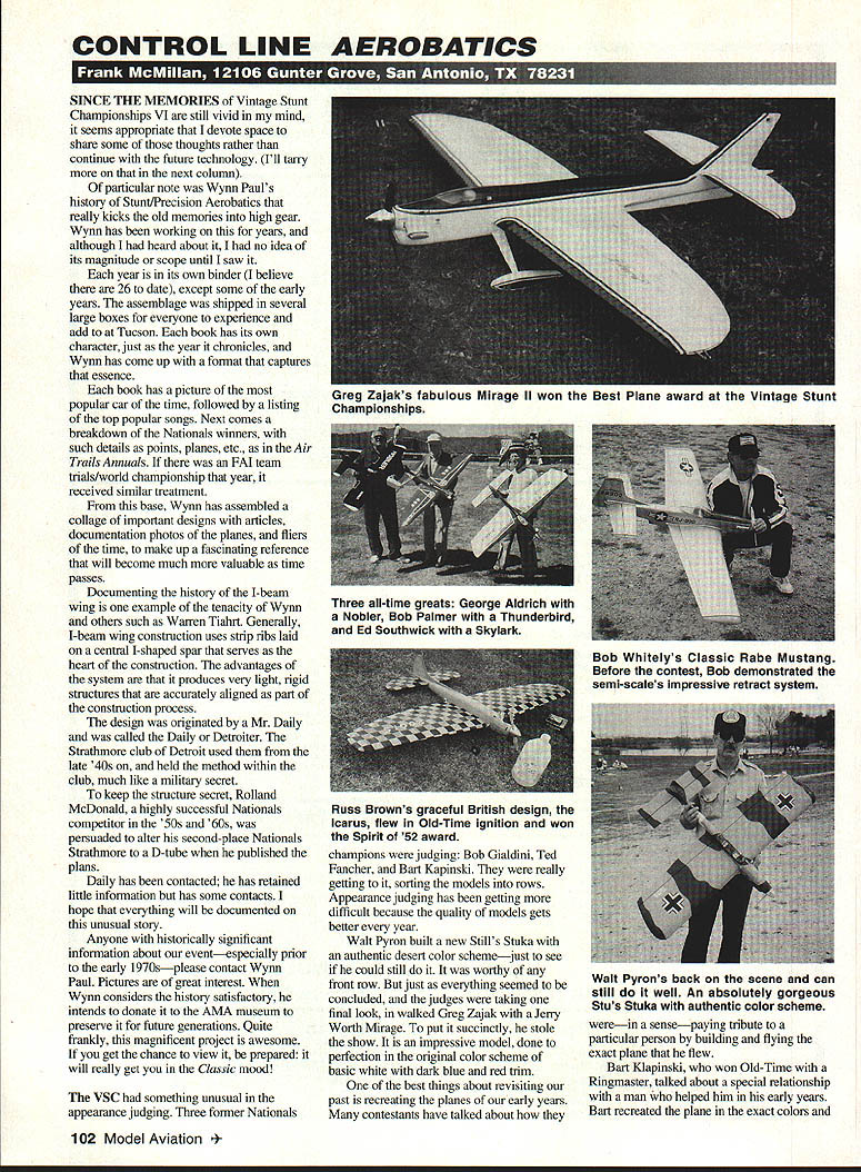 CONTROL LINE AEROBATICS SINCE THE MEMORIES Vintage Stunt Championships VI still vivid mind seems appropriate devote space share some thoughts rather continue future technology Ill tany next column particular note Wynn Pauls history Stunt/Precision Aerobatics really kicks old memories high gear Wynn has working years although heard about t no idea its magnitude scope until saw year its own binder believe 26 date except some early years assemblage shipped several large boxes everyone experience add Tucson book has its own character just year chronicles Wynn has come up format captures essence book has picture popular car time followed listing top popular songs Next comes breakdown Nationals winners such details points planes etc Air Trails Annuals FAI team trials/world championship year received similar treatment base Wynn has assembled collage important designs articles documentation photos planes fliers time make up fascinating reference will become much valuable time passes Documenting history I-beam wing example tenacity Wynn others such Warren Tiahrt Generally I-beam wing construction uses strip ribs laid central I-shaped spar serves heart construction advantages system produces very light rigid structures accurately aligned part construction process design originated Mr Daily called Daily Detroiter Strathmore club Detroit used late 40s held method within club much like military secret keep structure secret Rolland McDonald highly successful Nationals competitor 50s 60s persuaded alter second-place Nationals Strathmore D-tube published plans Daily has contacted has retained little information has some contacts hope everything will documented unusual story Anyone historically significant information about eventespecially prior early 1970splease contact Wynn Paul Pictures great interest Wynn considers history satisfactory intends donate AMA museum preserve future generations Quite frankly magnificent project awesome get chance view prepared will really get Classic mood VSC something unusual appearance judging Three former Nationals champions judging Bob Gialdini Ted Fancher Bart Kapinski really getting sorting models rows Appearance judging has getting difficult because quality models gets better year Walt Pyron built new Stills Stuka authentic desert color schemejust see could still worthy front row just everything seemed concluded judges taking final look walked Greg Zajak Jerry Worth Mirage put succinctly stole show impressive model done perfection original color scheme basic white dark blue red trim best things about revisiting past recreating planes early years contestants have talked about werein sensepaying tribute particular person building flying exact plane flew Bart Klapinski won Old-Time Ringmaster talked about special relationship man helped him early years Ban recreated plane exact colors 102 Model Aviation Lajaks TaDulous mirage II won best Plane award tne Vintage Stunt Championships Three all-time greats George Aldrich Nobler Bob Palmer Thunderbird Ed Southwick Skylark Bob Whitelys Classic Rabe Mustang Before contest Bob demonstrated semi-scales impressive retract system Russ Browns graceful British design Icarus flew Old-Time ignition won Spirit 52 award Walt Pyrons back scene can still well An absolutely gorgeous Stus Stuka authentic color scheme configuration cousin Hal Yager Bob Hunt built classic winning Tucker because some pleasant relationships some Tucker Flyers early 60s like Ron OToole Ted Fancher talldng about recreating Bob Gialdini Sting Ray because such influence first exposed Stunt great way put meaning celebration heritage Control Line Aerobatics Right now Im building George Aldrich Magnum Super Nobler has flown competition Thats fun finding unusual plane campalgning Anybody got plans Art Pawlowskis Atom 57 Senior Nationals winner Unless youve its difficult convey experience camaraderie pervades entire contestand thats really loose term applied VSC Sure theres competition thats real purpose its celebrate past opportunity see talk greats have established firm foundation future Bob Palmer featured personality year Bob guest honor banquet shared stories flying days also talked about professional days Lockheed Aircraft Company worked windtunnel testing of companys projects Other personalities present Ed Southwick Charles Mackey prominent fliers early days As previous VSCs special contributors recognized efforts Don Hutchinson received Keeper Flame Award given modeler typifies spirit event Ban Klapinski received Gialdmi Sportsmanship Award outstanding contributions VSC over years very first VSC Whittier Narrows California Spirit 52 went Rusty Brown Icarus large graceful ignition design Great Britain finally Greg Zajak won Best Model Award Mirage VSC just great reason get away desert end winter just spectate talk everyone lots things family site great Plan now next year help us create memories Youll come back recharge batteries year Tech Tip Ive always said could use tool properly Id pick sandpaper sounds bit off blokes might say think about much final performance models depends well weve used sandpaper conversation Charlie Reeves about finishing subject sandpaper came up Charlies models absolute masterpieces discussed various types papernot just grit important pay attention type because some work better others application example Gray 3M Free Cut type works well initial clear coats filler coat grades 320 400 final clear coats 1000 2000 super fine grade used wet best much woodwork before paint final shaping etc red garnet paper far best Ive used may way grit applied seems cut smoother better Grades 180 200 applicable switch 320-400 gray Free Cut smoothing before paint dont recommend wet-or-dry 400 because paper hard creases can easily scratch wood before harden dope way gold paper can get body shops okay dont recommend abrasive seems come off balsa havent problem yet but. Remember save bunch buying quantity sheaf auto paint store will get same paper nearly half