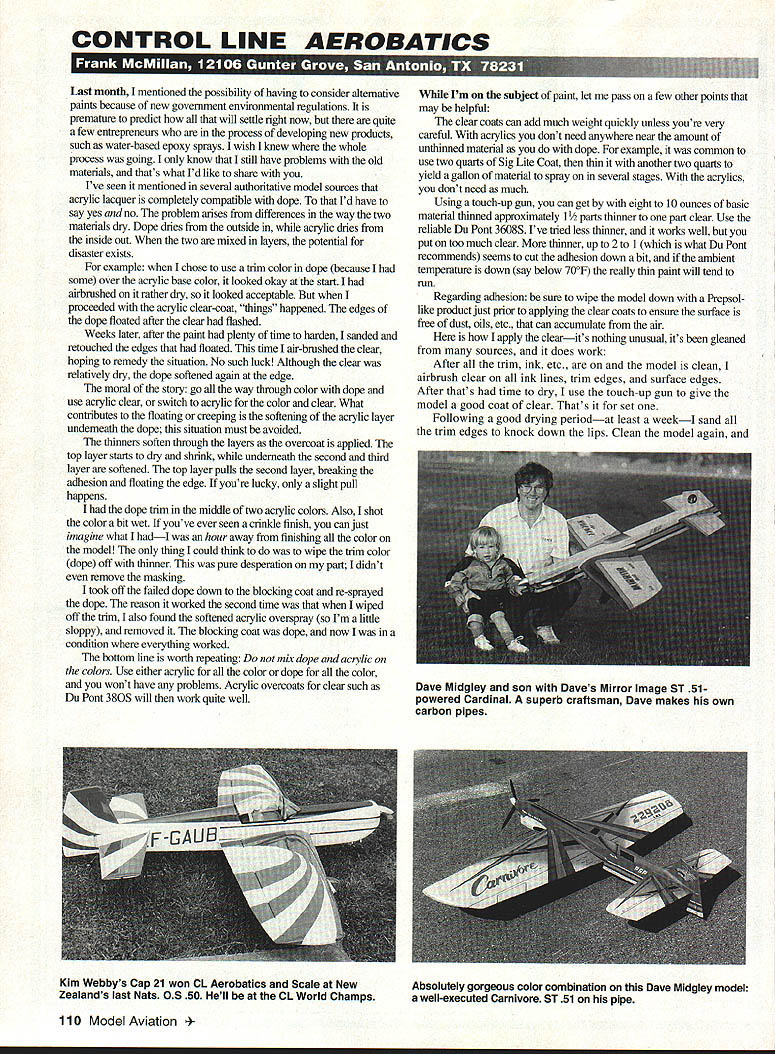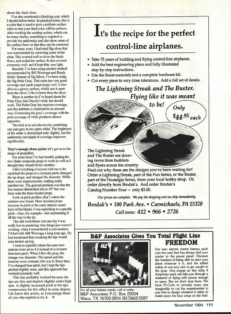 CONTROL LINE AEROBATICS Last month mentioned possibility having consider altemative paints because new govemment environmental regulations premature predict will seffle right now quite few entrepreneurs process developing new products such water-based epoxy sprays wish knew whole process going know still have problems old materials thats what Id like share Ive seen mentioned several authoritative model sources acrylic lacquer completely compatible dope Id have say yes no problem arises differences way two materials dry Dope dries outside acrylic dries inside out two mixed layers potential disaster exists example chose use trim color dope because some over acrylic base color looked okay start airbrushed rather dry soit looked acceptable proceeded acrylic clear-coat things happened edges dope floated after clear flashed Weeks later after paint plenty time harden sanded retouched edges floated time lair-brushed clear hoping remedy situation No such luck Although clear relatively dry dope softened again edge moral story go way through color dope use acrylic clear switch acrylic color clear What contributes floating creeping softening acrylic layer undemeath dope situation must avoided thinners soften through layers overcoat applied top layer starts dry shrink undemeath second third layer softened top layer pulls second layer breaking adhesion floating edge youre lucky slight pull happens dope trim middle two acrylic colors Also shot color abit wet youve ever seen crinide finish can just imagine what hadI hour away finishing color model thing could think wipe trim color dope off thinner pure desperation partI didnt remove masking took off failed dope down blocking coat re-sprayed dope reason worked second time wiped off trim also found softened acrylic overspray Im little sloppy removed blocking coat dope now condition everything worked bottom line worth repeating mix dope acrylic colors Use either acrylic color dope color wont have problems Acrylic overcoats clear such Du Pont 380S will work quite well Im subject paint let pass few other points may helpful clear coats can add much weight quickly unless youre very careful acrylics dont need anywhere near amount unthinned material dope example common use two quarts Sig Lite Coat thin another two quarts yield gallon material spray several stages acrylics dont need much Using touch-up gun can get eight 10 ounces basic material thinned approximately 1 parts thinner part clear Use reliable Du Pont 36085 Ive tried less thinner works well put too much clear thinner up 2 1 what Du Pont recommends seems cut adhesion down bit ambient temperature down say below 700F really thin paint will tend run Regarding adhesion sure wipe model down Prepsol like product just prior applying clear coats ensure surface free dust oils etc can accumulate air howl apply clearits nothing unusual its gleaned sources does work After trim ink etc model clean airbrush clear ink lines trim edges surface edges After thats time dry use touch-up gun give model good coat clear Thats set Following good drying periodat least weekI sand trim edges knock down lips Clean model again 110 Model Aviation Dave Midgley son Daves Mirror Image ST 51powered Cardinal superb craftsman Dave makes own carbon pipes Kim Webbys Cap 21 won CL Aerobatics Scale New Absolutely gorgeous color combination Dave Midgley model Zealands last Nats OS 50 Hell CL World Champs well-executed Carnivore ST 51 pipe shoot final clear Ive also mentioned blocking coat should define better practical terms color used give uniform surface color final color will uniform After working sanding sealers can shades something required provide uniformity also show some surface flaws can coirected years used Sig silver concentrated removing some clear worked well show finish flaws sealed surface also covered extremely well kept thin light Recently Ive using another method recommended Bill Werwage Randy Smith Instead Sig Silver Ive using Sig Polar Gray color has very good coverage sands surprisingly well also dries glossy surface sets apart silver like better silver another tip Ive heard about Polar Gray havent tried should work Polar Gray has superior coverage attribute exploited unusual way Contrasting greys coverage poor coverage white produces almost opposites trick mix two combining part grey two parts white brightness white diminished slightly uniformity depth coverage improves significantly Thats enough about paint lets get magic propellers some time Ive trouble getting two blade composite props work well thought should hot weather did everything everyone told repitched props constant pitch changed tip shape changed diameter improvements nothing really satisfied general problem line tension diminished above 450 three-bladed props Look pitch profiles thats solution found Most standard props decrease pitch outer stations outer third blade repitching specific pitchfour examplebut maintaining way tip did work better day really lost pondering things just werent working remembered conversation Id Bill Werwage long time ago mentioned tweaking tips would cure tension up top went profile outer two stations set 42 instead constant four-inch pitch flew prop change dramatic speed line tensions constant Since Ive changed base pitch kept tips pitched slightly approach has worked extremely well has probably worked because tips thin depitch slightly under high rpm slightly increased pitch tips compensates effect some degree know works encourage repitch try recipe perfect control-line airplanes Take 75 years building flying control-line airplanes Add best engineering plans fully illustrated step-by-step instructions Use finest materials complete hardware kit Cut piece very dose tolerances Add full set decals Lightning Streak Buster Brodaks 100 Park Ave ichaels PA 15320 Call now 412 2726 B&P Associates Gives Total Flight Line FREEDOM new electric starter battery pack cuts cord has always tied starter power panel Discover freedom being able start