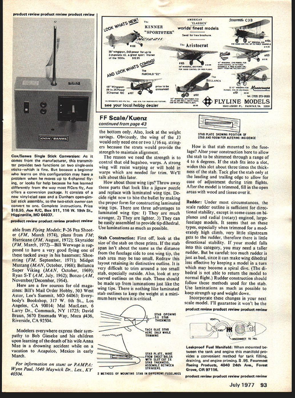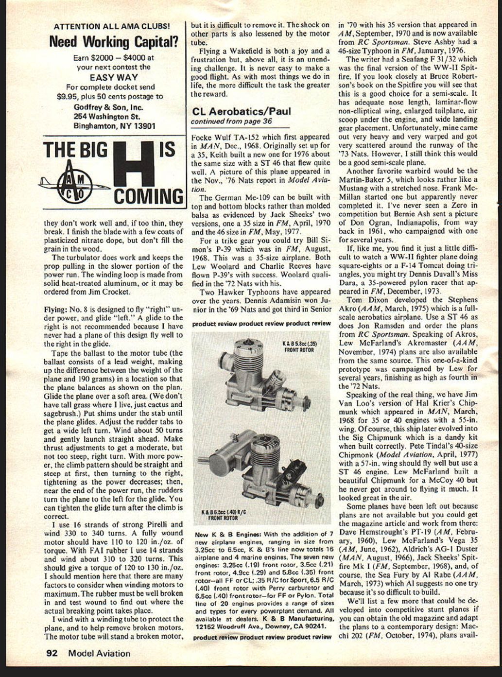 Aerobalics El Wynn Paul SEMI-SCALE STUNT planes have important part scene since first Nationals 1946 Ralph Roof won Open Stunt flying six-foot Taylorcraft Forester 99 up front course stunt pattern quite different featuring such maneuvers wheel touch ing 7 points stall recovery 8 glider pick up 10 laying smoke screen 3 rolls 35 flying two planes once 7 Weve come long way molded balsa fuselage foam wing polyester finish multiple adjustable features todays semi-scale stunters favorite semi-scales Bearcat have least four excellent ones Al Rabes Jim Lynchs Ron Hardings Mike Wag ners Als article appeared AAM March 1970 molded balsa fuselage must plane weighs 55 oz youre trouble difficult plane build certainly impressive flight Al Jim suggest some changes basic model shown AA M can obtain specs changes two modelers word requesting information know top fliers get numerous requests help information tips etc Some modelers very cooperative taking time effort answer letter Others answer requests However modelers search assistance should realize answering letter re quest takes time Requests should spe cific form mini-question naire space provided answer Always provide self-addressed stamped return envelope postcard much easier people fill out ques tionnaire-type letter slip stamped return envelope likely receive answer F-S 1 probably common semi-scale Rabe Bill Rutherford have versions very competitive host other fliers trying P-Si Wing loading can get out hand easily planes have careful origi nal Mustang Rabe AAM June 1969 again model has up dated Al Bill Al Meyers 666 Orr St Joliet IL 60436 has plans available competitive version want reasonably light wing loading bet ter build scratch Bearcat Mustang would good subjects Atlanta Stunt Conspiracy plans similar Gieseke Nobler available Perhaps Rabe Rutherford Lynch Harding could send drawings Tom Dixon possible publi cation According index have least 50 semi-scale stunt ships magazines since 1960 trick ob tain magazine article plans Ill discuss some other possibilities below have several Stukas over years Don Stills original 48-in contender would make good 35-powered stunter cause its small size plane sev eral others still available Hobby Helpers 1543 StilIwell Ave Bronx NY 10451 Also available same source Frank Warburtons Tony 57-in span probably should have 5T46 instead listed 35 Charles Mackeys Mark Spitfire 57-in span Arch Adamisin also Tony stunter 35 size foam wing Plans available RC Sportsman P0 Box 11247 Reno NV 89510 MAN good 3-view Tony June 1966 French Dewoitine D-520 should make good semi-scale ship Art Adami sin Kent Rogers good exam ples craft 35 46 size re spectively No plans available Profile series no 135 good start advanced modeler An airplane certainly lends itself stunt configuration Keith Trostles Continued page 92 36 Model Aviation Pleasant lines distinguish Ron Rays Javelin Powered Enya 35 equipped uni flow tank Civilian-type pilot figure pit Bearcats forever Great piston-engine fighter perennial favorite Ron Hardings flashy look- World Trophy awarded Les McDonald ing rendition powered ST 46 friends Orange Blossom Hobby Shop Miami Speaking subjects never diestunt radio CL scalethe P51 Mustang must popular WW II subjects semi-scale Al Meyers has 54-in span ST 40 ATTENTION ALL AMA CLUBS Need Working Capital Earn $2000 0 next contest EASY WAY complete docket send $995 plus 50 cents postage Godfrey & Son Inc 254 Washington St Binghamton NV 13901 THE BIG HIs AM CCOMING dont work well too thin break finish blade few coats plasticized nitrate dope dont fill grain wood turbulator does work keeps prop pulling slower portion power run winding loop made solid heat-treated aluminum may ordered Jim Crocket Flying No 8 designed fly right un der power glide left glide right recommended because have never plane design fly well right glide Tape ballast motor tube ballast consists lead weight making up difference between weight plane 190 grams location plane balances shown plan Glide plane over soft area dont have tall grass live just cactus sagebrush Put shims under stab until plane glides Adjust rudder tabs get wide left turn Wind about 50 turns gently launch straight ahead Make thrust adjustments get moderate too steep right turn pow er climb pattern should straight steep first turning right tightening power decreases near end power run rudders turn plane left glide can tighten glide turn after climb correct use 16 strands strong Pirelli wind 330 340 turns fully wound motor should have 110 120 in/oz torque FAI rubber use 14 strands wind about 310 320 turns should give torque 120 130 in/oz should mention factors consider winding motors maximum rubber must well broken test wound find out actual breaking point takes place wind winding tube protect plane help remove broken motors motor tube will stand broken motor difficult remove shock other parts also lessened motor tube Flying Wakefield both joy frustration above unend ing challenge never easy make good flight As things life difficult task greater reward CL Aerobatics/Paul continued page 36 Focke Wuif TA-152 first appeared MAN Dec 1968 Originally set up 35 Keith built new 1976 about same size ST 46 flew quite well picture plane appeared Nov 76 Nats report Model via tion German Me-109 can built top bottom blocks rather molded balsa evidenced Jack Sheeks two versions 35 size FM April 1970 46 size FM May 1977 trike gear could try Bill Si mons P-39 FM August 1968 35-size airplane Both Lew Woolard Charlie Reeves have flown P-39s success Woolard quali fied 72 Nats Two Hawker Typhoons have appeared over years Dennis Adamisin won Ju nior 69 Nats got third Senior 70 35 version appeared AM September 1970 now available RC Sportsman Steve Ashby 46-size Typhoon FM January 1976 writer Seafang F 31/32 final version WW-II Spit fire look closely Bruce Robert sons book Spitfire will see good choice semi-scale has adequate nose length laminar-flow non-elliptical wing enlarged tailplane air scoop under engine wid