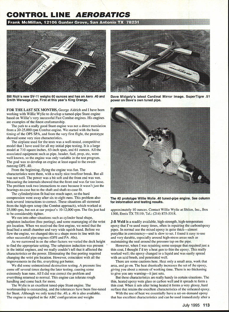 CONTROL LINE AEROBATICS FOR THE LAST SIX MONTHS George Aldrich have working Willie Wylie develop turned-pipe Stunt engine based Willies very successful Fast Combat engines engines examples finest craftsmanship path really good Stunt engine direct translation 20-25000 rpm Combat engine started basic timing OPS SPA very first flight prototype showed some very nice characteristics airplane used tests well-tested competitive model have used initial pipe testing large model 710 square inches 63-inch span 61 ounces associated equipment such pipe header fuel prop etc well known engine variable test program goal develop engine least equal sweetrunning OPS 40 beginning flying engine fun characteristics really nice two/four break well power bit soft front end wet Measuring internals showed front end far too loose problem took two interactions cure because wasnt just bearings-to-case shaft shaft-to-case fit cylinder/piston fit too much taper hard compression went away after six eight runs problem also took several interactions correct situations stemmed high-rpm setup Combat approach worked 25000 rpm projects 10-12000rpm fits just considerably tighter ran other situations such cylinder head shape subpiston induction free porting some rearranging wrist pin location received first engine noted head small chamber very wide squish band Before flew engine changed shape line other successful pipe engines OPS PA 40s As narrowed other factors varied deck height tu find apprupriate setting subpiston induction present initial engines really couldnt tell affected characteristics power Eliminating free porting required changing wrist pin location However coincident improvements fits everything got better did some unintentional destruction testing pressure line come off several times during later testing causing some extremely lean runs did correct problem everything returned normal engine can tolerate rough handling come back Wylie excellent tuned-pipe Stunt engine workmanship outstanding tolerances have fine-tuned Stunt Although tested 40 46 also available engine supplied ABC configuration weighs approximately 10 ounces Contact Willie Wylie Shilen Inc Box 1300 Ennis TX 75119 Tel 214 875-5318 J-B Weld readily available high-strength high-temperature epoxy Ive used times often repairing carbon/epoxy pipes normal use mixed epoxy quite thickalmost puttylike consistencyand slow set found easy use very durable especially around high-stress areas such maintaining seal around pressure tap pipe However repairing some seepage required just thin coat thought Id try heat gun thin epoxy really worked well epoxy changed liquid easily spread acid brush penetrated well some cautions Heat small area work area go heat drastically increases set epoxy giving about minute working time no thickening give warningit just sets characteristics really handy certain situations thin heated epoxy wets glass carbon well spreads form thin coat sets after being heated forms very glossy hard surface retains excellent characteristics unheated epoxy use heat essentially have set-on-demand epoxy has excellent characteristics can used immediately after July1995 113 Bill Richs new SV-11 weighs 60 ounces has Aero 40 Smith Werwage pipe First years King Orange Dave Midgelys latest Cardinal Mirror Image SuperTigre 51 power Daves own tuned pipe #2 prototype Willie Wylie 40 tuned-pipe engine See column information testing results GIANTSCALE PITS PLAr Rubber Ek Engine Powei Free Flight Display Control Un. Electric Power RJC Airplanes Ceoena 150 n Valley Hobby Canter iant II837-A W Main St Lanadale PA 19440 Caners GST - 368-0770 4302N 750W UmnIa H 46767 2193 894-3370 KIT $11995DELUXE KIT $15995 SPECIFICATIONS 4ec M416rX6OOI Engine 25-402 cycle 40 48 4-Cycle Rado 3- Channel Learn fly planes private field B&rvl MODEL CO Five 6 day course $350 Open year round 290W tosoN LAYrON lIT 84041 Send SASE complete info Southwest RO PHONE 801544-5689 Call arSend 53 00 foe ColorBrochuee 3mCdoaOder Flying 2818 Carolina NE Albuquerque NM ADD $1393 SHIPPINGIIAANDLING liT RES ADD 625% TAX87110505-832-6394 PRODUCTS FOR ThE ERNING MODELER Complete Line Exhaust Systems Tuned Pipes led Tuned Pipes Headers uri Mufflers Expansion Mufflers copter Ball Mufflers ialized Exheust Systems Unsurpasr Woinship 8 Pedormance Introduces NEW SUPER COOL Plug Hi Temp Insulator $209 addition FIREBALL RIO IDLE BAR plug $209 Hot & Standard Non-Idle Bar plugs still $169 Swanson Associates P0 Box 151 Sane 1848 Wayne NJ 07470 heat-activated set sanded filed etc Most commercial epoxies just dont react quite same way Give tryI really like options provides last time discussed painting made point changing OSHA regulations would eventually impact normal finishing procedures other day heard potential problem commonly used thinner has changed formulas DuPont 3608S has modified reduce volatile compounds designator changed V36085 problem concerns use thinner Sig Dope normally compatible Ive told V-series thinner caused clotting stringing Sig dope rendering unusable Since process finishing new Caudron thought Id find out just what situation mixed V thinner both dope acrylic previously thinned material no effect tried mixing thinner unthinned dope two different cansagain no discernible effect somewhat surprised possible informant new variant Sig dope too have responsive same regulations new formula could cause incompatibility About time probably thinking mention firsthand evidence wanted highlight paints using changing compatibility definite concern As basis manufacturers going insure products maintain compatibility Sig will work Sig DuPont thinner will work acrylic So best thing stick what manufacturer recommends nice able use thinner Check compatibility before getting point no return Ive requests information Al Rabe semiscale airplanes Although have some information Al real source past few years Al has flying Royal Saudi Airlines Saudi Arabia contact has rather infrequent called recently mentioned would repl