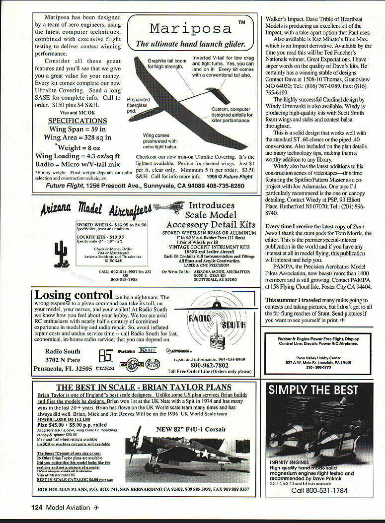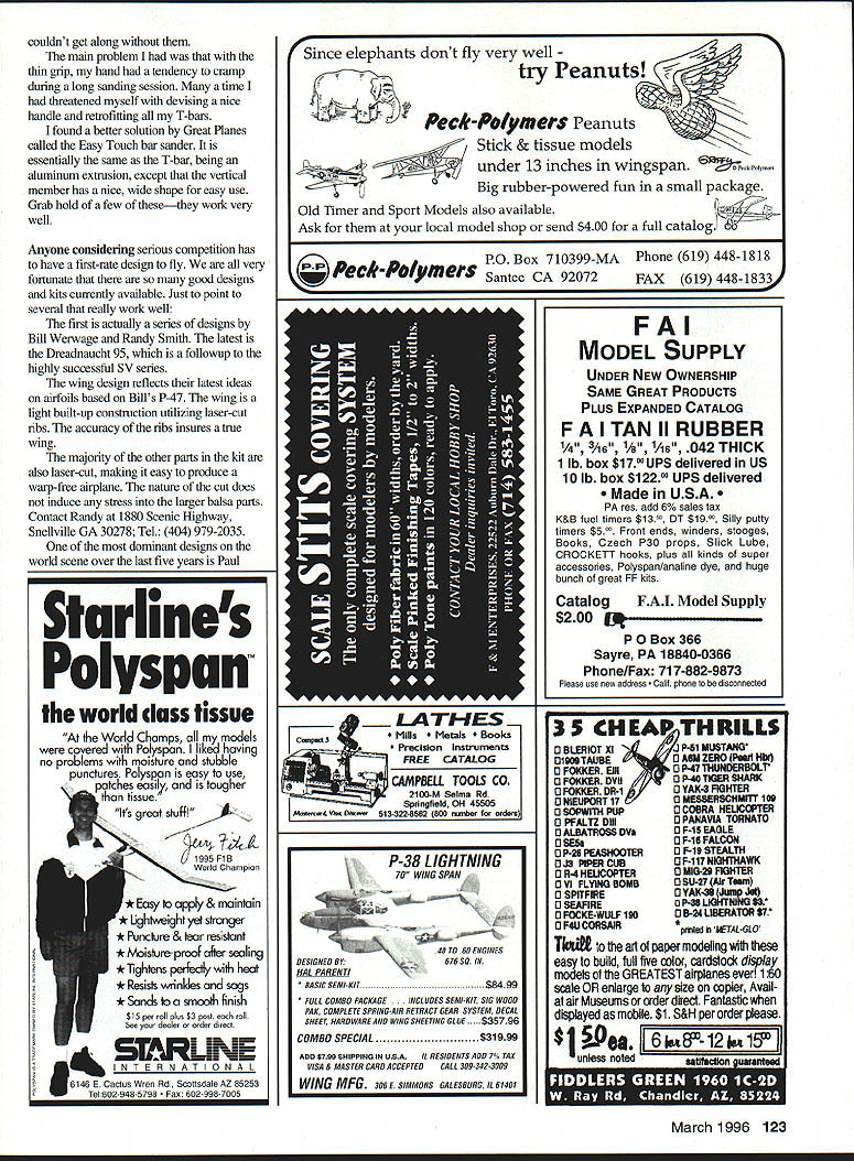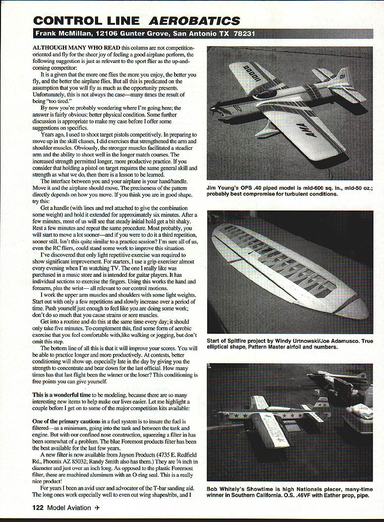 CONTROL LINE AEROBATICS ALTHOUGH MANY WHO READ column competitionoriented fly sheer joy feeling good airplane perform following suggestion just relevant sport flier up-andcoming competitor given flies enjoy better fly better airplane flies predicated assumption will fly much opportunity presents Unfortunately always casemany times result being too tired now youre probably wondering Im going answer fairly obvious better physical condition Some further discussion appropriate make case before offer some suggestions specifics Years ago used shoot target pistols competitively preparing move up skill classes did exercises strengthened arm shoulder muscles Obviously stronger muscles facilitated steadier ann ability shoot well longer match courses increased strength permitted longer productive practice consider holding pistol target requires same general skill strength what lesson learned interface between airplane hand/handle Move airplane should move preciseness pattern directly depends move think good shape tiy Get handle lines reel attached give combination some weight hold extended approximately six minutes After few minutes us will see steady initial hold get bit shaky Rest few minutes repeat same procedure Most probably will start move lot soonerand third repetition sooner still Isnt quite similar practice session Im sure us RC fliers could stand some work improve situation Ive discovered light repetitive exercise required show significant improvement starters use grip exerciser almost evening Im watching TV really like purchased music store intended guitar players has individual sections exercise fingers Using works hand foreann plus wrist relevant control motions work upper arm muscles shoulders some light weights Start out few repetitions slowly increase over period time Push yourself just enough feel like doing some work dont much cause strains sore muscles Get routine same time day should take five minutes complement find some form aerobic exercise feel comfortable withlike walking jogging dont omit step bottom line will improve scores will able practice longer productively contests better conditioning will show up especially late day giving strength concentrate bear down last official times has last flight winner loser conditioning free points can give yourself wonderful time modeling because interesting new items help make lives easier Let highlight couple before get some major competition kits available prunary cautions fuel system insure fuel filteredas minimum going tank between tank engine confined nose construction squeezing filter has somewhat problem blue Foremost products filter has best available last few years new filter now available Jayson Products 4735 E Redfield Rd Phoenix AZ 85032 Randy Smith also has diameter just over inch long As opposed plastic Foremost filter machined aluminum 0-ring seal really nice product yean avid user advocator T-bar sanding aid long ones work especially well out wing shapes/ribs 122 Model Aviation Youngs OPS 40 piped model mid-600 sq mid-50 oz probably best compromise turbulent conditions Start Spitfire project Windy UrtnowskVJoe Adamusco True elliptical shape Pattern Master airfoil numbers Bob Whitelys Showtime high Nationals placer many-time winner Southern California 05 46VF Eather prop pipe couldnt get along main problem thin grip hand tendency cramp during long sanding session time threatened myself devising nice handle retrofitting T-bars found better solution Great Planes called Easy Touch bar sander essentially same T-bar being aluminum extrusion except vertical member has nice wide shape easy use Grab hold few thesethey work very well Anyone considering serious competition has have first-rate design fly very fortunate good designs kits currently available Just point several really work well first actually series designs Bill Werwage Randy Smith latest Dreadnaucht 95 followup highly successful SV series wing design reflects latest ideas airfoils based Bills P47 wing light built-up construction utilizing laser-cut ribs accuracy ribs insures true wing majority other parts kit also laser-cut making easy produce warp-free airplane nature cut does induce stress larger balsa parts Contact Randy 1880 Scenic Highway Snellville GA 30278 Tel 404 979-2035 dominant designs world scene over last five years Paul Starlines Polyspa w world lass tissue World Champs models covered Polyspan liked having no problems moisture stubble punctures Polyspan easy use notches easily tougher tissue Its great stuff World Champion Easy ap4 & maintain * Lightweight yet stlvnger * Punchre & tear resistant * Moisture-proof after sealing * lightens perfectly wh heat * Resists wrinkles sags * Sands smooth finish $15 per roll pies $3 post roll See dealer order direct NATIONAL Zactus Wren Rd Scottsdale AZ 85253 Tel 502-945-5795 Fan 602-998-7005 35 CHEAP THRILLS O BLERIOT Xl P41 MUBTANG OI9NTAUBE0 AU ZERO Pgul Hbe OFOKKEREIII0P47ThUNDERBOLr o FOKKER DVII 4I/W0 P-40 TIGER SHARK o FOKKER DR-I0 YAK-S FIGHTER o NISUPORT 170 MESSERSCI4MITT ic O SOPWITH PUP0 COBRA HEUCOPTER O PFALTZ DIII0 PANAVIA TORNATO O ALBATROSS DVa0 F-iS EAGLE o ssa0 F-lU FALCON OP-2SPEASHOOTEROF-lOSTEALTh Oja PIPER CUBOF117NIGI4THAWI o R-4 HEUCOPTER0 MIG-2 FIGHTER 0 VI FLYING BOilS0 SU-27 Air Turn 0 SPITFIRE0 YAK-36 J o SEAFIRE0 P48 LIGH~GS 0 FOCKE-WULF 1900 B-24 LEERATOR 87 0 F4U CORSAIR* printed AETAL-GLO ti-fe art paper modeling easy build full five color cardstod display models GREATEST airplanes ever 160 scale OR enlarge size copier Availat air Museums order direct Fantastic displayed mobile $1 S&H per order please March 1996 123 Since elephants dont fly very well try Peanuts { Peck-P yiners Peanuts Stick & tissue models -eunder 13 inches wingspan rubber-powered fun small package Old Timer Sport Models also available Ask local model shop send $400 full catalog ox 710399-MA Phone 619 448-1818 ~uecErf-efymer$ Santee CA 92072 X 619 448-1833 FAI MODEL SUPPLY UNDER NEW OWNERSHIP SAME GREAT PRODUCTS PLUS