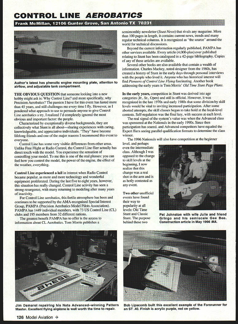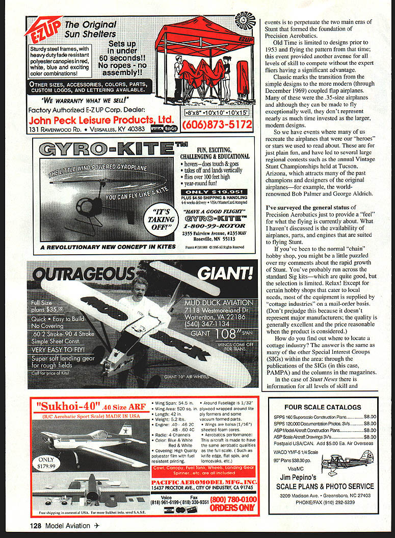 CONTROL LINE AEROBATICS u ll IX Cli THE OBVIOUS QUESTION someone looking new hobby might ask Control Line specifically Precision Aerobatics passion have event has lasted 45 years still challenges time fly However pondered what approach use persuade anyone give Control Line aerobatics try realized Id completely ignored obvious important factor people Characterized exceptionally diverse backgrounds collectively what Stunt aboutsharing experiences caring knowledgeable appreciative individuals have become lifelong friends major reasons recommend event everyone Control Line has some very visible differences other areas Unlike Free Flight Radio Control Control Line flier actually has direct touch model experience sensation controlling model real plusses can feel control model power engine effect weather everything Control Line experienced Jail interest Radio Control became popular more technology wonderful equipment proliferated During last five eight years however situation has really changed Control Line activity has seen strong resurgence returning modeling after years inactivity Control Line aerobatics fertile atmosphere has continues supported AMA-recognized Special Interest Group PAMPA Precision Aerobatics Model Pilots Association PAMPA has 1449 individual members 73 US Control Line CL clubs 195 members 32 different nations greatest benefit PAMPA has offer access information about CL Aerobatics Tom Morris publishes semimonthly newsletter Stunt News rivals magazine 100 pages length contains current news trends regular technical columns recognized source around world technical discussions Beyond current information regularly published PAMPA has other services available article 4000-plus ever published relating Stunt has catalogued 42-page bibliography Copies of articles available Several other books also available contain wealth information Charles Mackey noted designer 1960s has created history Stunt early days through personal interviews people lived Anyone has historical interest will find Pioneers Control Line Flying fascinating Another book addressing early years Tom Morris Old Time Stunt Page Plans early years competition Stunt derived age categories Jr Sr Open still official However recognized late 1970s early 1980s some division skill levels would vital inviting increased participation After some aborted attempts skill classes began take hold local-level contests Self-regulation final key success level real signal systems value Advanced class sponsored Nationals early 1990s Since participation has soared Advanced competitors have equaled Expert fliers seeing parallel qualification formats determine class winner 1996 Nationals will also have competition beginner level perhaps intermediate class Although opposed change skill levels beginning now realize change real shot arm hotly contested event Two other unofficial events have found way popularity levels Old Time Stunt Classic Stunt purpose behind two 126 Model Aviation ors latest has phenolic engine mounting plate attention airflow adjustable tank compartment Pat Johnston wife Julie friend Gringo semiscale Gee Bee Construction article May 1996 MA Jim Damarel repairing Nats Advancedwinning Pattern Master Excellent flying airplane well worth time repair Bob Lipscomb built excellent example Forerunner ST 40 Finish acrylic purple red yellow events perpetuate two main eras Stunt formed foundation Precision Aerobatics Old Time limited designs prior 1953 flying pattern time event provided another avenue levels skill compete expert fliers having significant advantage Classic marks transition simple designs modem through December 1969 coupled flap airplanes 35-size airplanes although can made fly exceptionally well dont represent nearly much time invested larger modem designs So have events us recreate airplanes heroes stars used read about just plain fun have led several large regional contests such annual Vintage Stunt Championships held Tucson Arizona attracts past champions designers original airplanesfor example worldrenowned Bob Palmer George Aldrich Ive surveyed general status Precision Aerobatics just provide feel what flying currently about What havent discussed availability airplanes parts engines suited flying Stunt youve normal chain hobby shop might little puzzled over comments about rapid growth Stunt Youve probably mn across standard Sig kitswhich quite good selection limited Relax Except certain hobby shops cater local needs equipment supplied cottage industries mail-order basis Dont prejudge because doesnt represent major manufacturers quality generally excellent price reasonable product considered find out locate cottage industry answer same other Special Interest Groups SIGs within area through publications SIGs case PAMPA columns magazines case Stunt News information levels skill Wing Span 545 nd Fuselage 1/32 Sukhoi4 0 40 Size ARF Wing Area 520 sq plnsood wrapped around its Length 42 inply formers some Weight 62 lbsvacuum formed parts Engine 40- 46 20 Wings balsa 1/16 48 6040 sheeted foam cores Radio 4 Channels batics performance Color Blue & White aircraft made have Red & White same aerobatic qualities Covering High Quality full scale polyester film fuel knife edge flat spin resistent printing lomcevalrs etcl PACIFIC AEROMODEL MFG INC 15437 PROCTO4 AVE CITY OF INDUSTRY CA 91745 VoiceFax800i00 18 961-6199 818 330-9351 800 7 z* ORDERSONI 128 Model Aviation 4WE WARRANTY WHAT WE SELLP Factory Authonzed E-Z UP Corp Dealer John Peck Leisure Products Ltu 606873-5172 131 RAVENWOOD RD AILLES KY 40383 FUN EXCITING CHAllENGING & EDUCATI0NM hoversdoes touch & goes takes off lands vertically flies over 100 feet high year-round fun PLUS $450 SIIIPPING & HANDLING 4-6ksdeUwry /MasterCuelAccsp5d JL4VE GOOD FLIGHT YR-KUTE 1-800-99 -ROTOR 2355 Fairview Avenue #235MAV RosevllleMN 55113 REVOLUTIONARY NEW CONCEPT IN KITES PsnttaIn cllslghsseservei FOUR SCALE CATALOGS SPPS 160 Superacaie Constnoton Plans$800 SPPS 120000 Documentatos Photos 3