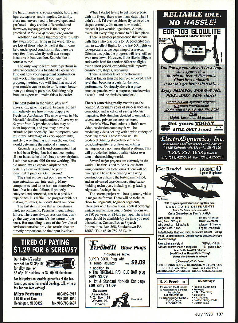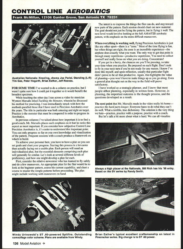 CONTROL LINE AEROBATICS FOR SOME TIME Ive wanted column practice wasnt quite sure could put together soit would benefit broadest spectrum teaching other day ran across video musician Wynton Marsalis titled Tackling Monster wherein discussed method practicing immediately struck methods paralled have used Precision Aerobatics over years title particular both amusing right target Practice monster must conquered order progress Aerobatics previous columns Ive talked about important find good coach Mr Marsalis places such emphasis ranks aspect important consider subjective Control Line Precision Aerobatics its easier understand important point can progress far own knowledge visualization pattern Frequent sessions coach produce framework build achieve personal best have have plan can set goals chart progress Starting process lot easier actually laying out usable plan person will need individualized plan essential elements comprising plan will generally similar Lets look several different levels proficiency might develop plan First consider relative newcomer has learned fly safely few maneuvers An appropriate plan flier would look beginner pattern assess current capability chart course master simple patterns before proceeding plan might include working maneuvers hand intent improve things flier can step toward new parts pattern session should chart out new material goal should just flying pattern flying well next level would involve looking full AIvIA/F2B aerobatic pattern emphasis difficult maneuvers everything working well flying Precision Aerobatics just Most t like other sportthere zone ime flying run things right zone incredible experiencethe airplane does exactly what want way get point through repetitionsproductive repetitions need collect yourself really focus what doing Concentrate get huny chances youll pressing take time practice prepared flight Dont rush fly next turn youre ready reason know Ive done myself upon reflection usually particular flight didnt prove productive Agaln highlights value planningyou wont have make things up go along general plan thought out way field will prove satisfactory have worked strategic planner know people abhor planning especially written form However planning important outcome thought process questions developed result next point Mr Marsalis made video really hit home practice hard parts longer Everyone hates what cant well What terrible true dichotomy solution very thing hatepractice practice purpose practice coach lets talk bit about what hard can visualize 136 Model Aviation * Australian Nationals Kneeling champ Joe Parisi Standing L-R Tim Gee Peter Hogarth Brian Eather Jeff Reeves Always high placer Nationals Bill Rich has 96 entry Based SV series Randy Smith Windy Urtnowskis ST 60-powered Spitfire Outstanding camouflage color scheme Plans available Windy Brian Eathers typical excellent craftsmanship latest Firecracker series Big change ST 60 power hard maneuvers square eights hourglass figures squares triangles Certainly maneuvers need developed perfectedthey differentiations However suggestion practiced end complete pattern Another hard thing us usually shy away flying wind lots fliers fly well home field under good conditions very few fliers fly well strange locations bad weather Sounds like contest way learn perform adverse conditions first-hand experience Find out equipment combination will work wind vary prop/engine/trim will find models can made fly much better thought possible Soliciting help expert will make lot easier next point video play expression gave pause because didnt immediately see would apply Precision Aerobatics answer Mr Marsalis detailed explanation Always try best practice session may seem important may have attitude just sport-fly improve must take advantage opportunity fly flight would determine national champion Recently good friend commented flying going all-out because didnt have new airplane said alibi working old model capable airplane certainly flew well enough pennit meaningful practice Get going slant next point learn mistakes interesting competitors tend hard themselves its fact failure properly analyzed corrected can positive experience Its difficult progress out making mistakes dont dwell last item sometimes hard optimistic Pessimism guarantees failure always sessions dont go way want its nature beast modeling few closed environments provides results directly proportional input involved 4-4Oxl/2 socket caps sell S435/1 00 oiioy steel S665/100 stainless S750/50 oluminum foir prices sensible quantities fas teners need model building call write fox free catalog Micro Fasteners800-892-6917 110 Hillcrest Rood908-806-4050 Flemington NJ 08822fax 908-788-2607 started trying get precise flying days didnt think Id ever able fly some shapes correctly No matter much pushed just wouldnt get Almost overnight everything seemed fall place another phenomenon occurs fliers practice lot good pilot can turn excellent flights first 50 flights especially beginning season Often point progress will level off turn down However flier diligent works hard another 200 flights over short period everything will improve consistency shapes everything another level performance higher best yet achieved level becomes basis next performance Obviously price practice practice purpose practice coachand circle complete Theres something really exciting horizon After years success both competitor editor Flying Models magazine Bob Hunt has decided embark several new private business ventures Robins View Productions Bobs new video-production company will producing videos dealing wide variety modeling topics videos will produced utilizing state-of-the-art nearbroadcast-quality resolution editing techniques nonlinear digital platform will provide highest-quality videos ever seen modeling world Several major projects currently works first tied Bobs lost-foam wing-construction techniques will two tapes basic tape dealing wing construction utilizing lost-foam