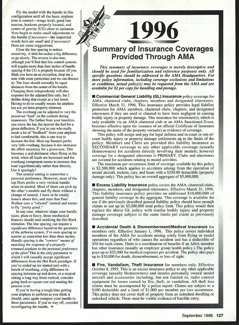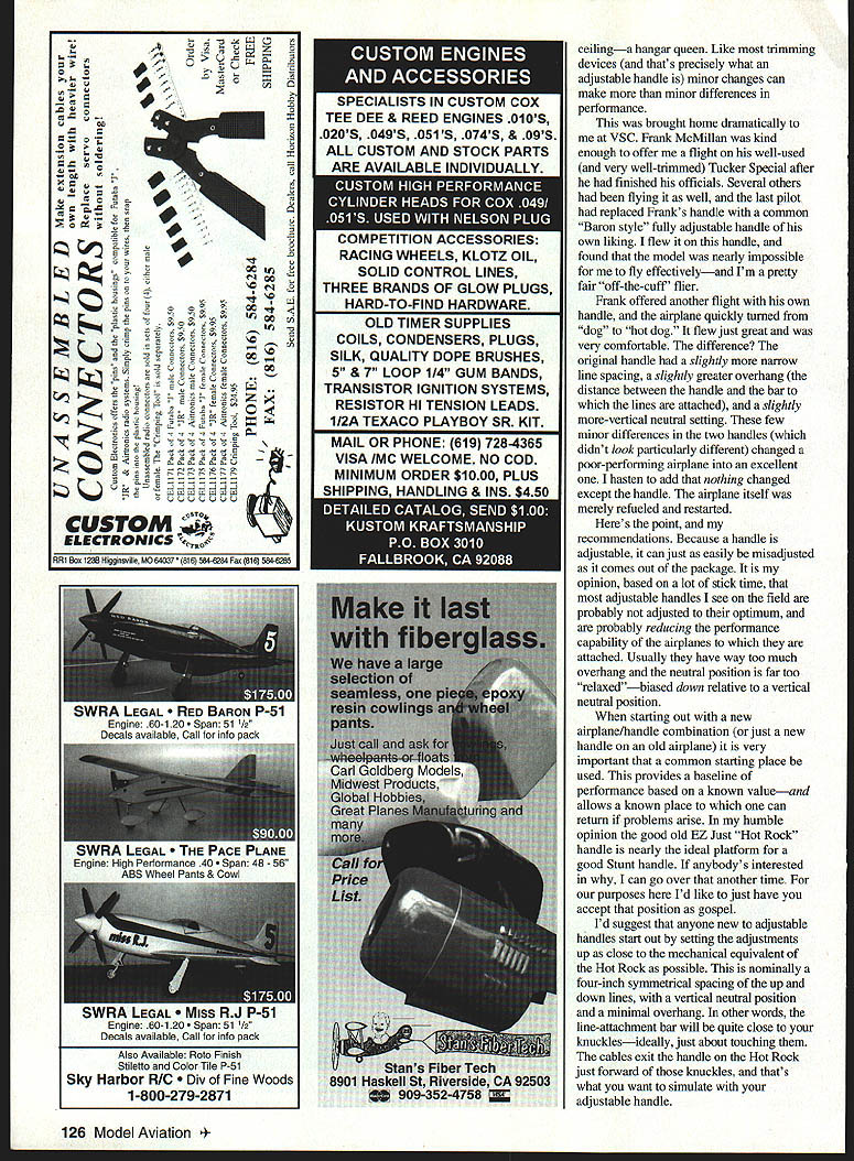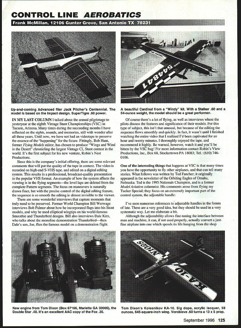 CONTROL LINE AEROBATICS IN MY LAST COLUMN talked about annual pilgrimage yestelyear eighth Vintage Stunt Championships VSC Tucson Arizona times during succeeding months have reflected sights sounds memories still wonder after years Until now have videotape preserve essence happening future Fittingly Bob Hunt former Flying Models editor has chosen produce Wings Wind Desert chronicling largest Vintage CL Stunt contest world Its first subject new venture Robins Nest Productions Since companys initial offering some relevant comments will put quality tape context video recorded high-end S-VHS tape edited digital editing system results professional broadcast-quality presentation popular VHS format An example system affects viewing flying segmentsthe level laps deleted complete Pattern segments focus maneuvers naturally drawn finer precise control digital editing feature sequence smooth editing almost invisible viewer some wonderful interviews capture moments truly need preserved Former World Champion Bill Werwage interviews Bob Palmer about incorporated flaps Stunt models used elliptical wingtips world-famous Smoothie Thunderbird designs Bill also interviews Dale Kim talks about monoline demonstration Thunderbirdthen Dales son Joe flies famous model demonstration flight course theres lot flying well interviews pilots discuss features significance models type subject isnt unusual because editing sequence flows smoothly quicldy fact wasnt until finished watching entire video realized Id captivated hour twenty minutes thoroughly enjoyed tape recommend highly warned however watch youll bitten VSC bug information contact Robins View Productions Inc Box 68 Stockertown PA 18083 Tel 610 7460106 interesting things happens VSC times have opportunity fly other nirplanes can tell stories What follows written Ted Fancher originally appeared newsletter Orbiting Eagles Omaha Nebraska Ted 1995 Nationals Champion former Model Aviation columnist comments arose flying Tucker Special focus extremely important part control system adjustable handle Ive seen numerous references adjustable handies forum late very good idea should used very systematic way Let elaborate bit Although adjustability allows fine-tuning interface between man machine can used properly actually convert justfine airplane spends its life hanging shop September 1996 125 Up-and-coming Advanced flier Jack Pitchers Centennial model based Impact design SuperTigre 60 power beautiful Cardinal Windy kit Stalker 60 54-ounce weight model should great performer New engine Tom Dixon Box 67166 Marietta GA 30066 Tom Dixons Kolesnikov KA-lO Sig dope acrylic lacquer 59 Double Star 40 Its excellent AAC copy Fox 35 ounces 645-square-inch wing Vorobieve 60 turns 13 x 5 prop # 2* r - - 5 no 5 o0 4J a0 C USTOM i ELECTRONICS 0000 0220 c 000oO 00000 00x SE2 2--0 0 j 0 C - -r 00 00 Q-O-~ 0 -vC 0 0 0 0 0 5 000000 S 0-iF2 ~2Q 00 02 RR1 Box 1238 Higgnsvile MO 64037 18161 84-0384 Fw 18161 58-e5 SWRA LEGAL PACE PLANE Engine High Performance 40 Span 48 56 ABSWheelPants&Cowl WHA LEGAL lIJ V-1 Engine 60-120 Span 511/2 Decals available Call info pack C -C ocmE~ f1oC 2 h 0X5 IC0 0 1J 00 00 0 COMPETITION ACCESSORIES RACING WHEELS KLOTZ OIL SOLID CONTROL LINES THREE BRANDS OF GLOW PLUGS HARD-TO-FIND HARDWARE OLD TIMER SUPPLIES COILS CONDENSERS PLUGS SILK QUALITY DOPE BRUSHES 5 & 7 LOOP 1/4 GUM BANDS TRANSISTOR IGNITION SYSTEMS RESISTOR HI TENSION LEADS 112A TEXACO PLAYBOY SR KIT MAIL OR PHONE 619 728-4365 VISA IMC WELCOME NO COD MINIMUM ORDER SIOOO PLUS ceilinga hangar queen Like trimming devices thats precisely what adjustable handle minor changes can make minor differences performance brought home dramatically VSC Frank McMillan kind enough offer flight well-used very well-trimmed Tucker Special after finished officials Several others flying well last pilot replaced Franks handle common Baron style fully adjustable handle own liking flew handle found model nearly impossible fly effectivelyand Im pretty fair off-the-cuff flier Frank offered another flight own handle airplane quickly turned dog hot dog flew just great very comfortable difference original handle slightly narrow line spacing slightly greater overhang distance between handle bar lines attached slightly more-vertical neutral setting few minor differences two handles didnt look particularly different changed poor-performing airplane excellent hasten add nothing changed except handle airplane itself merely refueled restarted Heres point recommendations Because handle adjustable can just easily misadjusted comes out package opinion based lot stick time adjustable handles see field probably adjusted optimum probably reducing performance capability airplanes attached Usually have way too much overhang neutral position far too relaxedbiased down relative vertical neutral position starting out new airplane/handle combination just new handle old airplane very important common starting place used provides baseline performance based known valueand allows known place can return problems arise humble opinion good old EZ Just Hot Rock handle nearly ideal platform good Stunt handle anybodys interested can go over another time purposes Id like just have accept position gospel Id suggest anyone new adjustable handles start out setting adjustments up close mechanical equivalent Hot Rock possible nominally four-inch symmetrical spacing up down lines vertical neutral position minimal overhang other words line-attachment bar will quite close knucklesideally just about touching cables exit handle Hot Rock just forward knuckles thats what want simulate adjustable handle 126 Model Aviation DEE & REED ENGINES 010S 020S 049S 051S 074S & 09S ALL CUSTOM AND STOCK PARTS ARE AVAILABLE INDIVIDUALLY WI1A LEGAL lIED ARON l-1 Engine 60-120 Span 511/2 flov10 osajlable Call info 000-I0 Also Available Rofo Finish Stiletto Color Tile P-Si Sky Harbor R/C Fine Woods 1-800-279-2871 Fly model handle configuration until basic airplane trim correctwings level