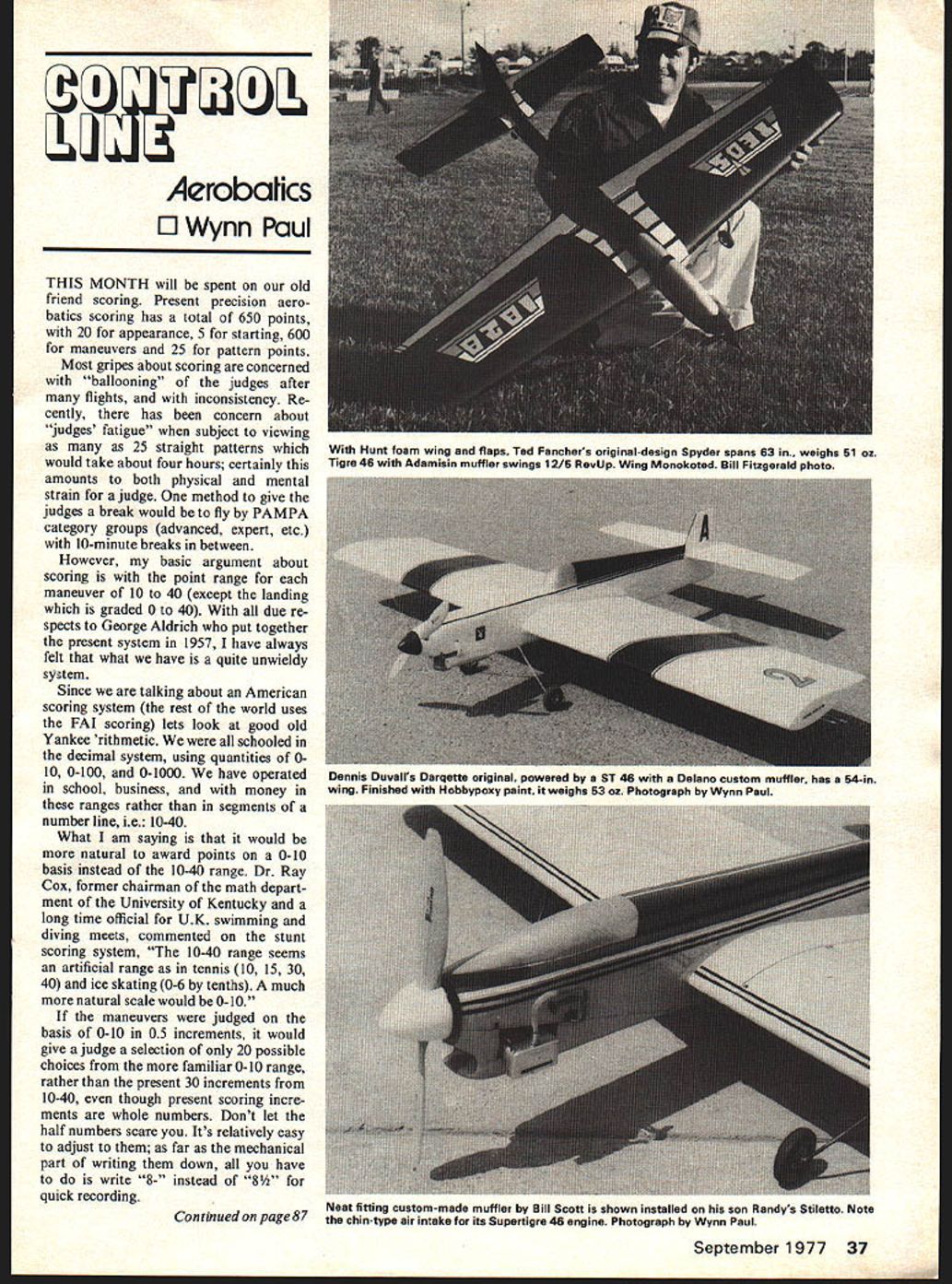 r Aerobahcs EJ Wynn Paul THIS MONTH will spent old friend scoring Present precision aero batics scoring has total 650 points 20 appearance 5 starting 600 maneuvers 25 pattern points Most gripes about scoring concerned ballooning judges after flights inconsistency Re cently has concern about judges fatigue subject viewing 25 straight patterns would take about four hours certainly amounts both physical mental strain judge method give judges break would fly PAMPA category groups advanced expert etc 10-minute breaks between However basic argument about scoring point range maneuver 10 40 except landing graded 0 40 due re spects George Aldrich put together present system 1957 have always felt what have quite unwieldy system Since talking about American scoring system rest world uses FAI scoring lets look good old Yankee rithmetic schooled decimal system using quantities 010 0-100 0-1000 have operated school business money ranges rather segments number line ie 10-40 What am saying would natural award points 0-10 basis instead 10-40 range Dr Ray Cox former chairman math depart ment University Kentucky long time official UK swimming diving meets commented stunt scoring system 10-40 range seems artificial range tennis 10 15 30 40 ice skating 0-6 tenths much natural scale would 0-10 maneuvers judged basis 0-10 05 increments would give judge selection 20 possible choices familiar 0-10 range rather present 30 increments 10-40 though present scoring incre ments whole numbers Dont let half numbers scare Its relatively easy adjust far mechanical part writing down have write 8- instead 8 quick recording Continued page 87 September 1977 37 Hunt foam wing flaps Tad Fanchers original-design Spyder spans 63 in. weighs 51 oz Tigre 46 Adamisin muffler swings 12/5 RavUp Wing Monokoted Bill Fitzgerald photo Dennis Duvalls Darqette original powered ST 46 Delano custom muffler has 54-in wing Finished Hobbypoxy paint weighs 53 oz Photograph Wynn Paul Neat fitting custom-made muffler Bill Scott shown installed son Randys Stiletto Note chin-type air intake its Supertigra 46 engine Photograph Wynn Paul HIGH POWER ULTRA SONIC CLEANER As shojon less cog & radio $8830 Chassis factory assembled $76 PISTON SETTING TOOL CDX 049 engines HARDENED STEEL-ANODIZED No TRA503$325 i LABLE SOONMufflers rear exhaust MUFF-L-IT SERIES Six eight Ob reduction noise engines Proportional voiumne expansion chamber Triple reflective intermediate chamber Large exhaust nozzle iow back pressure Little no loss power Available B C engines No 301 0919 $749 No 3122940$839 No 303 45-80 $949 NEW 112A MUFFLER Fits COX 049 engines new muffler gives significant noise reduction very little power lose Back facing nozzle No 300A049$549 No 3008051$549 SCHNOERLE enqines pretty throat catching Wildcat prewar markings circling 100 feet air sun shining through its covering created Ralph Kuenz 14645 Stahelin Detroit MI 48223 CL Aerobatics/Paul continued page 37 find very difficult attempt dif ferentiate between four five numbers given maneuver present system instance good maneuver seems very difficult contrast between 30-31-3233 especially actually com paring successive sets instance side squares 10 20 fliers about 10 minutes interval between decision 10-40 spread difficult find starting point median Twentyfive median starting point except landing know lot ofjudges use starting point good ma neuver gets graded up successively bad goes down 25 However lot latitude between 25 40 pick number good very good maneuver Using 0-10 range natural action think aver age median half way mark five number comes lot naturally picking 25 10-40 range competitive diving sport Ive familiar 15 years range judging very good 10 95 90 good 85 80 75 70 satisfactory 65 60 55 50 deficiency 45 40 35 30 unsatis factory 25 20 15 1005 failed 0 range category gives judge opportunity contrast within group ie judge can vary 70 85 good dive Granted diving degree difficulty separate dive 12 30 DD multiplied judges awards diver receives higher total tough dive easier dive aspect peculiar diving although have K fac tor FAI precision aerobatics scoring Lets remember stunt judge has about 7 seconds decide award write down feel too difficult mind categorize present award range 10-40 compared other maneuvers other stunt fliers pick between 30 choices just dont think reasonable us expect mind think over such large range numbers especially unfamiliar se quence range 10-40 word error counting system No dont think can count number time dont think can truly count actual number er rors 2-5 seconds takes maneuver illustrate consider inside squares poor entrytoo high too low rounding ityou deduct point very rapid succession must check first corner check ver tical sides check second corner same time checking overall shape size check 45-degree height also see second square same place first Also shouldnt some errors weighted others short dont think judge can count fast ac curately short time think have look overall impression maneuver noting above men tioned factors general impression would appear maneuver would have very different total number errors possible would think inside squares might have 16-20 errors four-leaf clover could have up 30 pos sible errors Advocates error-counting system overlook fact certain dividuals may think can score way what looking scoring system everybody can readily adjust rather easily feel big gest disadvantages error counting maneuver should have different number errors therefore ma neuver should have different set points Besides Al Rabe quick point out year error counting September1977 87 cleaner has patented Power Pump circuit nearly doubles power over cleaners same size Required top performance 2 & 4 quart sizes No 175 21 Quart $165 No 176 46 Quart $185 8 oz Detergent$195 qt Detergent$342 Lb THE INVADER 1/12th scale metal car revolution car technology Front rear wheel suspension Uses standard parts Car designed performance Patents applied MBH1O WACO ARISTOCRAFT 18 PLAN C02 Rubbe