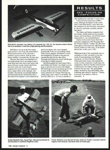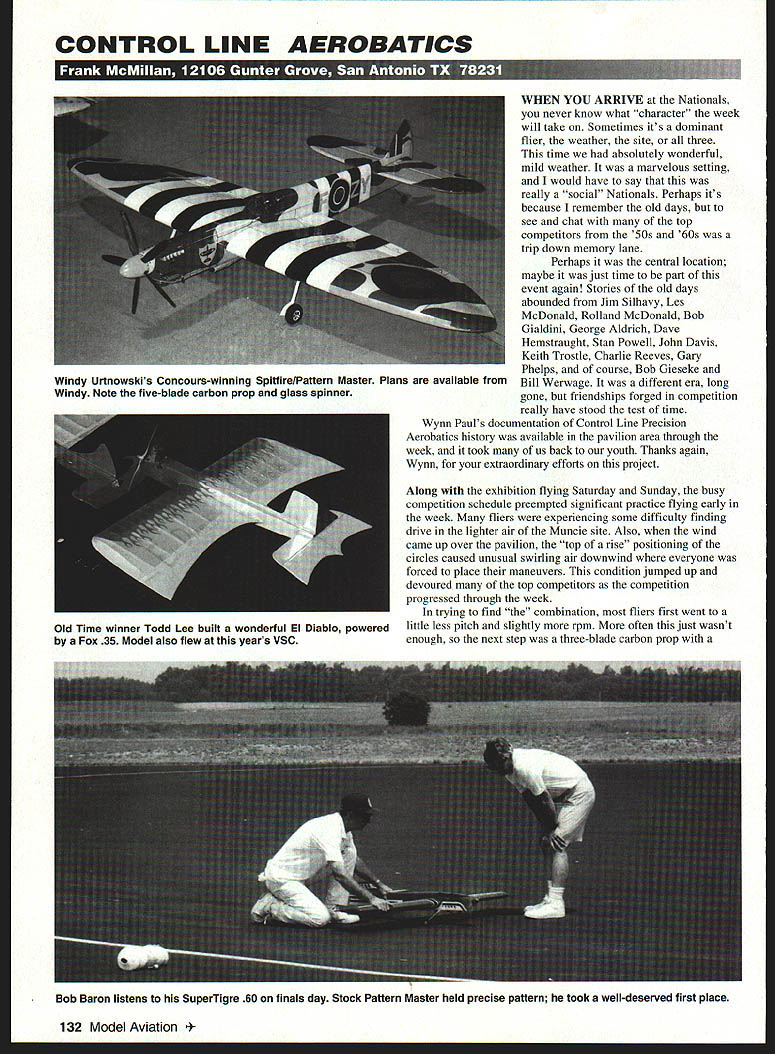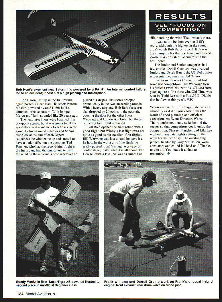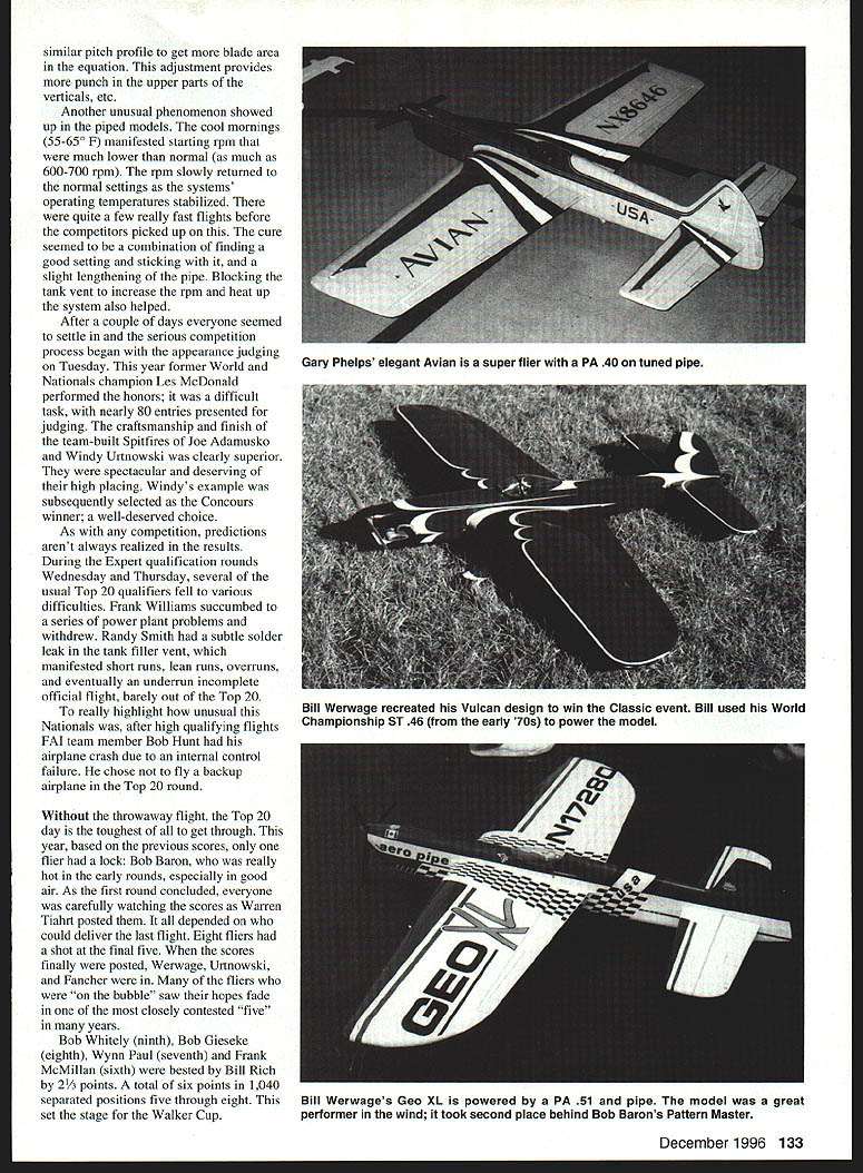 CONTROL LINE AEROBATICS 66. WHEN YOU ARRIVE Nationals never know what character week will take Sometimes its dominant flier weather site three time absolutely wonderful mild weather marvelous setting would have say really social Nationals Perhaps its because remember old days see chat top competitors 50s 60s trip down memory lane Perhaps central location maybe just time part event again Stories old days abounded Jim Silhavy Les McDonald Rolland McDonald Bob Gialdini George Aldrich Dave Hemstraught Stan Powell John Davis Keith Trostle Charlie Reeves Gary Phelps course Bob Gieseke Bill Werwage different era long gone friendships forged competition really have stood test time Wynn Pauls documentation Control Line Precision Aerobatics history available pavilion area through week took us back youth Thanks again Wynn extraordinary efforts project Along exhibition flying Saturday Sunday busy competition schedule preempted significant practice flying early week fliers experiencing some difficulty finding drive lighter air Muncie site Also wind came up over pavilion top rise positioning circles caused unusual swirling air downwind everyone forced place maneuvers condition jumped up devoured top competitors competition progressed through week trying find combination fliers first went little less pitch slightly rpm often just wasnt enough next step three-blade carbon prop 132 Model Aviation y Urtnowskis Concours-winning Spitfire/Pattern Master Plans available Windy Note five-blade carbon prop glass spinner Old Time winner Todd Lee built wonderful El Diablo powered Fox 35 Model also flew years VSC Bob Baron listens SuperTigre 60 finals day Stock Pattern Master held precise pattern took well-deserved first place similar pitch profile get blade area equation adjustment provides punch upper parts verticals etc Another unusual phenomenon showed up piped models cool mornings 5565O F manifested starting rpm much lower normal much 600-700 rpm rpm slowly returned normal settings systems operating temperatures stabilized quite few really fast flights before competitors picked up cure seemed combination finding good setting sticking slight lengthening pipe Blocking tank vent increase rpm heat up system also helped After couple days everyone seemed settle serious competition process began appearance judging Tuesday year former World Nationals champion Les McDonald performed honors difficult task nearly 80 entries presented judging craftsmanship finish team-built Spitfires Joe Adamusko Windy Urtnowski clearly superior spectacular deserving high placing Windys example subsequently selected Concours winner well-deserved choice As competition predictions aren t always realized results During Expert qualification rounds Wednesday Thursday several usual Top 20 qualifiers fell various difficulties Frank Williams succumbed series power plant problems withdrew Randy Smith subtle solder leak tank filler vent manifested short runs lean runs overruns eventually underrun incomplete official flight barely out Top 20 really highlight unusual Nationals after high qualifying flights FAI team member Bob Hunt airplane crash due internal control failure chose fly backup airplane Top 20 round Without throwaway flight Top 20 day toughest get through year based previous scores flier lock Bob Baron really hot early rounds especially good air As first round concluded everyone carefully watching scores Warren Tiahrt posted depended could deliver last flight Eight fliers shot final five scores finally posted Werwage Urtnowski Fancher fliers bubble saw hopes fade closely contested five years Bob Whitely ninth Bob Gieseke eighth Wynn Paul seventh Frank McMillan sixth bested Bill Rich 2 points total six points 1040 separated positions five through eight set stage Walker Cup December 1996 133 Gary Phelps elegant Avian super flier PA 40 tuned pipe Bill Werwage recreated Vulcan design win Classic event Bill used World Championship ST 46 early 70s power model Bill Werwages Geo XL powered PA 51 pipe model great performer wind took second place behind Bob Barons Pattern Master Bob Baron last up first round again posted clear lead stock Pattern Master powered ST 60 held compact precise pattern its open Merco muffler sounded like 20 years ago next three fliers bunched two-point spread going take good effort some luck get back game Between rounds Junior Senior also flew end Expert sequence wind came up started have major effect outcome Ted Fancher second-high flight first round misfortune have wind airplanes nose wherever placed shapes scores dropped dramatically two succeeding rounds heavy airplane Bob Barons scores also dropped 20 points poor air opening door other fliers Werwage Urtnowski closed gap big first flight remained Bill Rich opened final round good flight Windys last flight quite good excellent first flights Bill Werwage last up gave worst air finals really poured Vintage Werwage center stage thats what about Geo XL PA 51 smooth silk handling wind like wasnt however Bills score although highest round didnt catch Bob Barons total Bob champion first time earned ithe consistent accurate best Junior Senior categories few entries Dondi Garrison awarded Junior Derek Barry US FAI Junior representative awarded Senior Earlier week Classic Stunt some hot competition Bill Werwage flew Vulcan worlds ST 46 years ago first-time win Old Time won Todd Lee Fox 35 El Diablo flew years VSC event magnitude runs smoothly did know result good planning efficient execution As Event Director Warren Tiahrt performed tasks behind scenes competitors could enjoy competition Shareen Fancher Lila Lee worked late nights setting up work next day outstanding judges headed Gary McClellen consistent called dead Thanks made Nats remember Model Aviation Hunts excellent new Saturn its powered PA 51 An internal control failure led accident cost him high placing airplane Buddy MacSaIls flew SuperTigre 46-powered Kestrel Frank Williams Darrell Grunto work Franks unusual hybrid