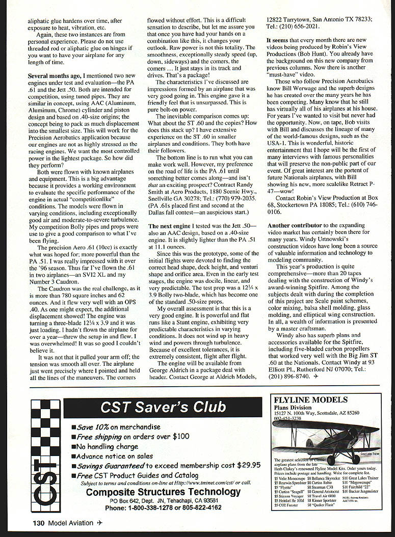 CONTROL LINE AEROBATICS OVER THE YEARS years case pick up bits technology work some dont work times approach seems surface exciting way solve problem just doesnt prove acceptable longterm solution Part equation Precision Aerobatics deal constant vibration longterm exposure heat ultraviolet rays prolonged high flight loads Faced environment need look longterm solutions engineering problems solutions last least years thousand flights philosophy simple Use what works over time evolve suits needs have approach engineering front end Randy Smith has Windy Urtnowski uses Big Jim Pattern Master style work also evolve over time Sometimes people tend reinvent problems because approach attractive its easy assume past away two areas solutions have recently proposed known fail thats what Id like address first use threaded rod adjusting device control systems availability heavy duty horns balllinks etc because larger-size RC activity builders have again looked attractiveness adjustment control system also approach using ball-links overcome perceived geometry problem control linkage Because peculiar environment recommend system uses threaded couplers flap/elevator/bellcrank system numerous examples threaded rod fatigues minor diameter causing loss good airplane dont fly lot can probably get away want ensure keeping good airplane use threaded couplersperiod second subject use aliphatic type glues attach RC hinges control surfaces glue very convenient wont jam hinges seems safe Ive lost airplane almost lost another because flap hinges loosened glue Epoxy works slow-set best have protect hinge barrels Vaseline its nice work doesnt come loose suspect February 1997 129 US gold medal winner Junior champion Derek Berry preparingDave Fitzgerald cleans up after last Finals flight David placed Finals flight Outstanding performancethird overall fine performance Paul Walker silver medal prepares Impact pits Eventual World Champs winner Han Xinping foreground Chinese World Championship team L-R Niu Anlin 12th place individual Han Xinping World Champion team anchor Wang Hong Wei fourth place aliphatic glue hardens over time after exposure heat vibration etc Again two instances personal experience Please use threaded rod aliphatic glue hinges want have airplane length time Several months ago mentioned two new engines under test evaluationthe PA 61 Jett 50 Both intended competition using tuned pipes similar concept using AAC Aluminum Aluminum Chrome cylinder piston design based 40-size origins concept being pack much displacement smallest size will work Precision Aerobatics application because engines highly stressed racing engines want controlled power lightest package So did perform Both flown known airplanes equipment big advantage because provides working environment evaluate specific performance engine actual competitionlike conditions models flown varying conditions including exceptionally good air moderate-to-severe turbulence competition Bolly pipes props use give good comparison what Ive flying precision Aero 61 10cc exactly what hoped powerful PA 51 really impressed over 96 season Thus far Ive flown 61 two airplanesan SVI2 XL Number 3 Caudron Caudron real challenge 780 square inches 62 ounces flew very well OPS 40 As might expect additional displacement showed engine turning three-blade 12 x 39 just loading hadnt flown airplane over yearthrew setup flew overwhelmed good couldnt believe pulled arm off tension smooth over airplane just went precisely pointed held lines maneuvers corners flowed effort difficult sensation describe let assure once have hands combination like changes outlook Raw power totality smoothness exceptionally steady speed up down sideways comers comers . just stays its track drives Thats package characteristics Ive discussed impressions formed airplane very good going engine gave friendly feel unsurpassed pure bolt-on power inevitable comparison comes up What about ST 60 copies does stack up have extensive experience ST 60 smaller airplanes conditions both have followers bottom line run what can make work well However preference road life PA 61 until something better comes alongand isnt exciting prospect Contract Randy Smith Aero Products 1880 Scenic Hwy Snellville GA 30278 Tel 770 979-2035 PA 61s placed first second Dallas fall contestan auspicious start next engine tested Jett 50 also AAC design based 40-size engine slightly lighter PA 51 111 ounces Since prototype some initial flights devoted finding correct head shape deck height venturi shape orifice area early test stages engine docile linear very predictable test prop 12 x 39 Bolly two-blade has become standard 50-size props overall assessment very good engine powerful flat runs like Stunt engine exhibiting very predictable characteristics varying conditions does wind up heavy wind powers through turbulence Because excellent tolerances extremely consistent flight after flight engine will available George Aldrich package deal header Contact George Aldrich Models 12822 Tarrytown San Antonio TX 78233 Tel 210 656-2021 seems month new videos being produced Robins View Productions Bob Hunt already have background new company previous columns Now another must-have video follow Precision Aerobatics know Bill Werwage superb designs has created over years has competing know still has virtually airplanes house years Ive wanted visit never opportunity Now tape Bob visits Bill discusses lineage of world-famous designs such USA-i wonderful historic entertainment hope will first interviews famous personalities will preserve non-public part event great interest portent future Nationals airplanes Bill showing new scalelike Retract P 47wow Contact Robins View Production Box 68 Stockertown PA 18085 Tel 610 7460 106 Another contributor expanding video market has certainly years Windy Urtnowskis construction videos have long source valuable information technology modeling community years production quite comprehensivemore 20 tapes dealing construction 