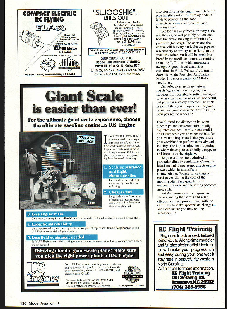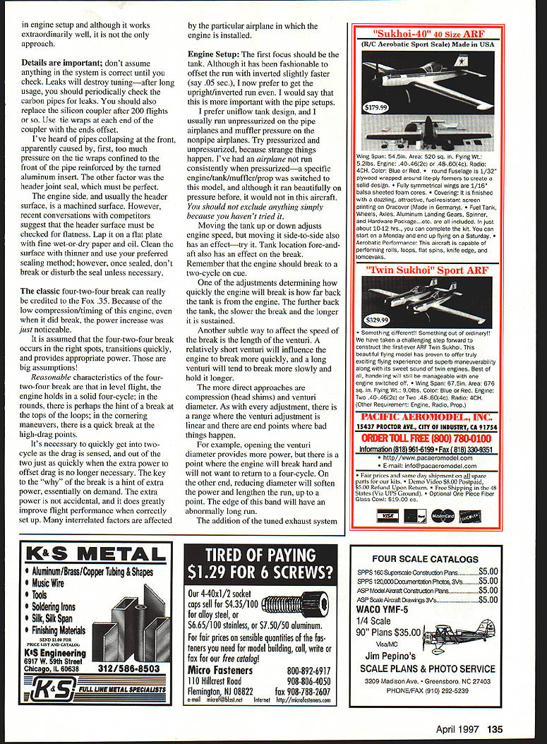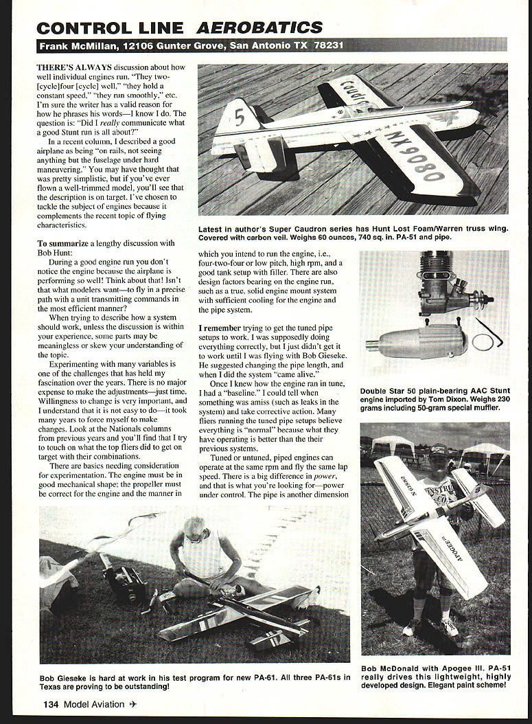 CONTROL LINE AEROBATICS THERES ALWAYS discussion about well individual engines run two [cycle]four [cycle] well hold constant speed run smoothly etc Im sure writer has valid reason phrases wordsI know question Did really communicate what good Stunt run about recent column described good airplane being rails seeing anything fuselage under hard maneuvering may have thought pretty simplistic youve ever flown well-trimmed model youll see description target Ive chosen tackle subject engines because complements recent topic flying characteristics summarize lengthy discussion Bob Hunt During good engine run dont notice engine because airplane performing well Think about Isnt what modelers wantto fly precise path unit transmitting commands efficient manner trying describe system should work unless discussion within experience some parts may meaningless skew understanding topic Experimenting variables challenges has held fascination over years no major expense make adjustmentsjust time Willingness change very important understand easy doit took years force myself make changes Look Nationals columns previous years youll find try touch what top fliers did get target combinations basics needing consideration experimentation engine must good mechanical shape propeller must correct engine manner intend run engine ie four-two-four low pitch high rpm good tank setup filler also design factors bearing engine run such true solid engine mount system sufficient cooling engine pipe system remember trying get tuned pipe setups work supposedly doing everything correctly just didnt get work until flying Bob Gieseke suggested changing pipe length did system came alive Once knew engine ran tune baseline could tell something amiss such leaks system take corrective action fliers running tuned pipe setups believe everything normal because what have operating better previous systems Tuned untuned piped engines can operate same rpm fly same lap speed big difference power what youre looking forpower under control pipe another dimension Double Star 50 plain-bearing AAC Stunt engine imported Tom Dixon Weighs 230 grams including 50-gram special muffler 134 Model Aviation st authors Super Caudron series has Hunt Lost FoamlWarren truss wing Covered carbon veil Weighs 60 ounces 740 sq PA-Si pipe Bob Gieseke hard work test program new PA-61 three PA-61s Texas proving outstanding Bob McDonald Apogee Ill PA-51 really drives lightweight highly developed design Elegant paint scheme engine setup although works extraordinarily well approach Details important dont assume anything system correct until check Leaks will destroy tuningafter long usage should periodically check carbon pipes leaks should also replace silicon coupler after 200 flights Use tie wraps end coupler ends offset Ive heard pipes collapsing front apparently caused first too much pressure tie wraps confined front pipe reinforced turned aluminum insert other factor header joint seal must perfect engine side usually header surface machined surface However recent conversations competitors suggest header surface must checked flatness Lap flat plate fine wet-or-dry paper oil Clean surface thinner use preferred sealing method however once sealed dont break disturb seal unless necessary classic four-two-four break can really credited Fox 35 Because low compression/timing engine did break power increase just noticeable assumed four-two-four break occurs right spots transitions quickly provides appropriate power big assumptions Reasonable characteristics fourtwo-four break level flight engine holds solid four-cycle rounds perhaps hint break tops loops cornering maneuvers quick break high-drag points Its necessary quickly get twocycle drag sensed out two just quickly extra power offset drag no longer necessary key break hint extra power essentially demand extra power accidental does greatly improve flight performance correctly set up interrelated factors affected particular airplane engine installed Engine Setup first focus should tank Although has fashionable offset run inverted slightly faster say 05 sec now prefer get upright/inverted run would say important pipe setups prefer uniflow tank design usually run unpressurized pipe airplanes muffler pressure nonpipe airplanes Try pressurized unpressurized because strange things happen Ive airplane run consistently pressurizeda specific engine/tank/muffler/prop switched model although ran beautifully pressure before would aircraft should exclude anything simply because havent tried Moving tank up down adjusts engine speed moving side-to-side also has effecttry Tank location fore-andaft also has effect break Remember engine should break two-cycle cue adjustments detenmning quickly engine will break far back tank engine further back tank slower break longer sustained Another subtle way affect speed break length venturi relatively short venturi will influence engine break quickly long venturi will tend break slowly hold longer direct approaches compression head shims venturi diameter As adjustment range venturi adjustment linear end points bad things happen example opening venturi diameter provides power point engine will break hard will want return four-cycle other end reducing diameter will soften power lengthen run up point edge band will have abnormally long run addition tuned exhaust system Sukhoi-4 0 40 Size ARF R/C Acrobatic Sport Scale Made USA g Span 54Sin Area 520 sq Flyir5 52lbs Engine 40-462c 48-604c Radio 4CH Color Blue Red d Fuselage 1/32 plywood wrapped around life-ply formats create solid design y symmetrical wings 1/16 balsa sheeted foam cores ring finished dazzling attractive fuel-resistant screen printing Oracover Made Germany Tank Wheels Axles Aluminum Landing Gears Spinner Hardware Package.etc included just about 10-12 hrs can complete kit can start Monday end up flying Saturday Aerobatic Performance aircraft capable performing rolls ioops flat spins knife edge loncevaks 329 9 Something u,erenu rainaryn have ta