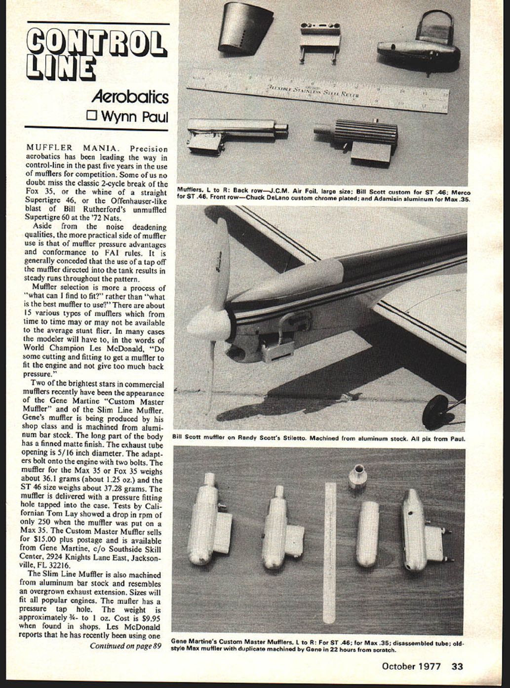Aero balks 0 Wynn RuI MUFFLER MANIA Precision aerobatics has leading way control-line past five years use mufflers competition Some us no doubt miss classic 2-cycle break Fox 35 whine straight Supertigre 46 Offenhauser-like blast Bill Rutherfords unmuffled Supertigre 60 72 Nats Aside noise deadening qualities practical side muffler use muffler pressure advantages conformance FAI rules generally conceded use tap off muffler directed tank results steady runs throughout pattern Muffler selection process what can find fit rather what best muffler use about 15 various types mufflers time time may may available average stunt flier cases modeler will have words World Champion Les McDonald some cutting fitting get muffler fit engine give too much back pressure' Two brightest stars commercial mufflers recently have appearance Gene Martine Custom Master Muffler Slim Line Muffler Genes muffler being produced shop class machined alumi num bar stock long part body has finned matte finish exhaust tube opening 5/16 inch diameter adapt ers bolt onto engine two bolts muffler Max 35 Fox 35 weighs about 361 grams about 125 oz ST 46 size weighs about 3728 grams muffler delivered pressure fitting hole tapped case Tests Cali fornian Tom Lay showed drop rpm 250 muffler put Max 35 Custom Master Muffler sells $1500 plus postage available Aene Martine Southside Skill Center 2924 Knights Lane East Jackson ville FL 32216 Slim Line Muffler also machined aluminum bar stock resembles overgrown exhaust extension Sizes will fit popular engines mufler has pressure tap hole weight approximately 3/4 1 oz Cost $995 found shops Les McDonald reports has recently using Continued page 89 October 1977 33 Mufflers H Back rowJCM Air Foil large size Bill Scott Custom ST 46 Merco ST 46 Front rowChuck Delano custom chrome plated Adamisin aluminum Max 35 Bill Scott muffler Randy Scotts Stiletto Machined eluminum stock pix Paul Gene Martines Custom Master Mufflers ST 46 Max 35 disassembled tube oldstyle Max muffler duplicate machined Gene 22 hours scratch HIGH POWER ULTRA SONIC CLEANER THE INVADER 1/12th scale metal car revolution car technology Front rear wheel suspension Uses alt standard parts Car designed performance Patents applied cteaner has patented Power Pump circuit nearly doubles power over cleaners same size Required top performance 2 & 4 quart sizes No 175 21 Quart No 176 46 Quart 8 oz Detergent qt Detergent As shown less eng & radio $8850 Chassis factory assembled $76a5 PISTON SETTING TOOL CDX 049 engines HARDENED STEELANODIZED No TRA503$325 $165 $185 $1 95 $342 MUFF-L-IT SERIES Six eight Db reduction noise moat engines Proportional votumne expansion chamber Triple reflective Intermediate chamber Large exhaust ~zzle low back pressure Little loss power Available B C engines No 301 09-19 $749 No 3229- 40$839 No 303 45-80 $949 NEW 1/2A MUFFLER FIts COX 049 engines new uffler gives significant noise reduction ith very little power loss Back facing ozzle No 300A049$549 No 3008051$549 rear eshaut SCIINIERLE ennines pecially dont know what whipping really have watch pilot es tablish point view just what center rotation see relation center rotation airplane looking pilot handle goes past center rotation before plane goes past edge circle whipping plane handle go past center rotation together whip ping plane goes before handle definitely slowing down plane can produce speed-change charts rather easily interest Ill draw up couple Goodyear Slow Rat Another approach might nomograph takes vari ables account directly Interested wrtte W R Lee 3S22 Tamarisk Lane Mis souri City TX 774S9 CL Aerobatics/Paul continued page 33 cannot feel much power loss stated shortens muffler has drilled some large holes end reduce back pressure address manufacturer available shops Slim Line Mufflers 8631 E Roanoke Scottsdale AZ 85257 product review product review product review BLADE ANDAILERON GUIDC PORWIRE Kwik Hinge Slotter Completely universal tool automatically aligns guides blade perfect hinge slots Three hardened steel blades Included two both large small hinges picker cleaning out slotsall fit No 2 X-Acto knife Nylon Alignment Jig Automatic jig features three snap-on guides two large small hinges drill guide hinges ail eron wire Fits 1/8 % balsa makes right size slot hole hinge market Alignment jig attachments cost $125 Replacement blades available 35 cents Du-Bro Products Inc 480 Bonner Rd Weuconda IL 50084 product review product review product review DuBro Universal MU 795 muffler has used several Nationals qualifiers both Max 35 ST 46 Bob Whitely Rich LeRoy have utilized some slight cutting drilling fitting Air Foil muffler JCM Specialties small size 19-25 package shaped like airfoil will bolt right ST 46 Some modification needed Max Fox Fox No 90222 muffler made Fox 35 course bolts right up Musumeci Connection father son has using its Fox after re moving inside tube creating large chamber Works well cuts weight popular mufflers past couple years has Art Adamisin creation aluminum bar stock However Art injured good hand production has stalled over winter want excellent mufflers would best write Art 22454 Fairfax Taylor MI 48180 mufflers have used Bob Hunt Gene Schaffer Les McDonald Dave Hemstrought Ted Fancher Bill Fitzgerald similarity between Adamisin muffler recent Gene Martine muffler Both excellent products Semco muffler no 202 CL 2940 engines priced $1295 will bolt right up Max ST 46 weight October1977 89 \ ft I AVAILABLE SDDN M,fflae fnr see local hobby dealer t$ 4 RUBBER & CO2 WINNER AT THE 5OthNATS 7 4101 22 I/2 WINGSPAN 5695 about two ounces extension youre looking some nose weight might try standard Supertigre muffler S29B ST 46 weighs about three oz sells $1295 Also newer type OS Max mufflers come engines good nose weight small Tatone will help front-end stability after some cutting hogging fit either Max Fox some areas Enya M-200 muffler ST 46 may still available fairly light item costing about $800 Bill Werwage used some time USA-I