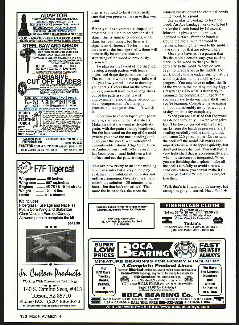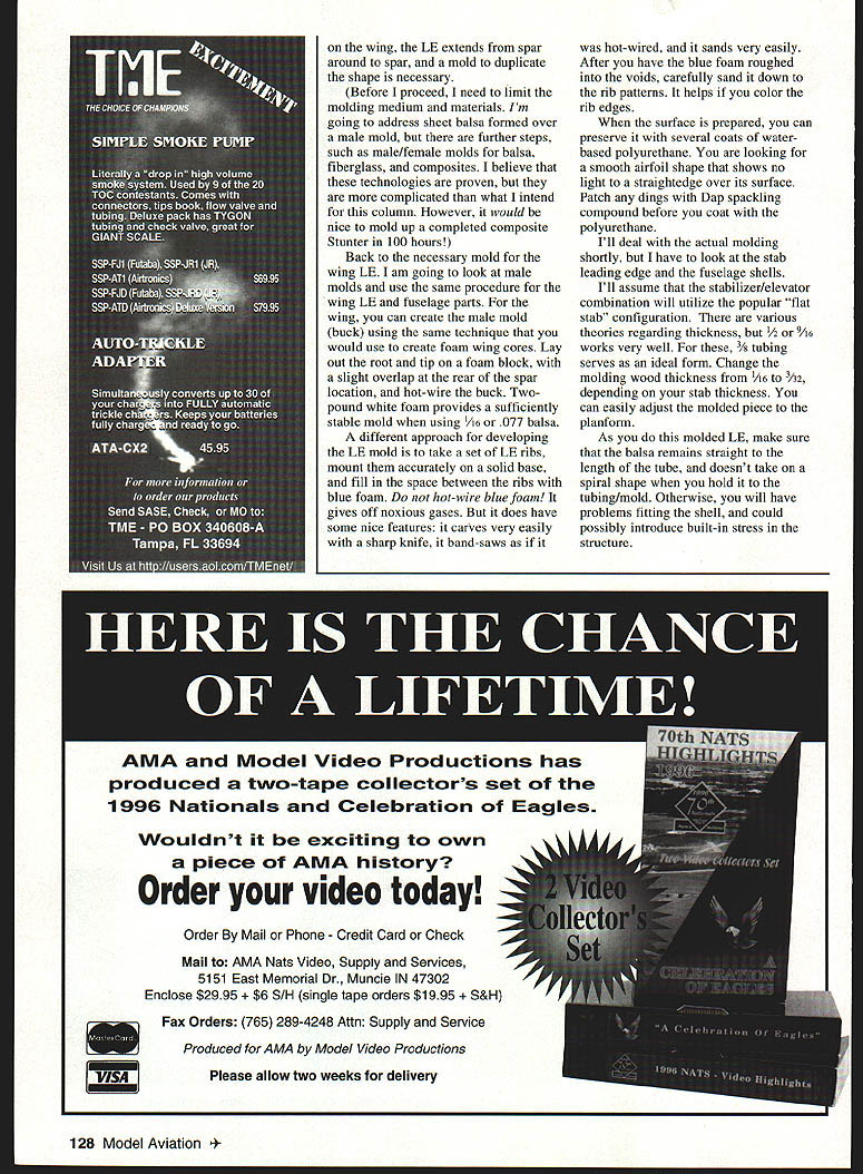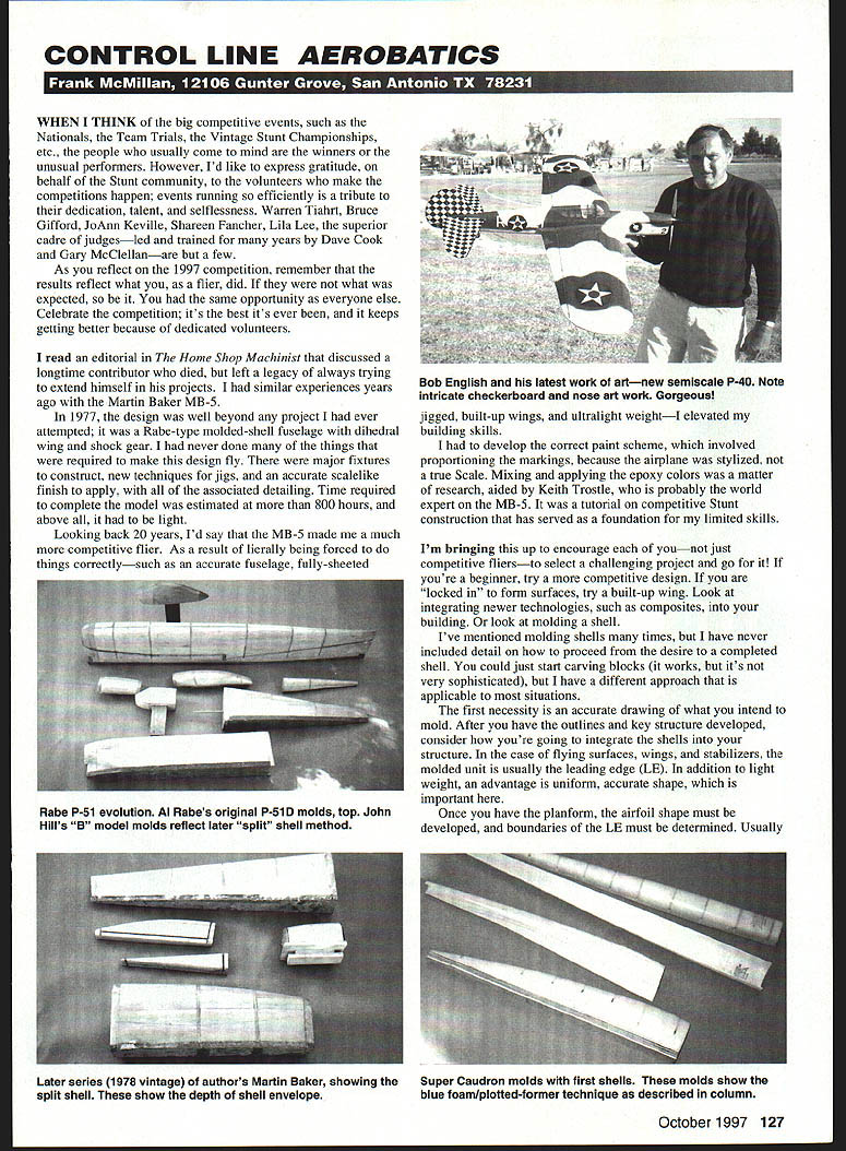 CONTROL LINE AEROBATICS WHEN THINK big competitive events such Nationals Team Trials Vintage Stunt Championships etc people usually come mind winners unusual performers However Id like express gratitude behalf Stunt community volunteers make competitions happen events running efficiently tribute dedication talent selflessness Warren Tiahrt Bruce Gifford JoAnn Keville Shareen Fancher Lila Lee superior cadre judgesled trained years Dave Cook Gary McClellanare few As reflect 1997 competition remember results reflect what flier did what expected same opportunity everyone else Celebrate competition its best its ever keeps getting better because dedicated volunteers read editorial Home Shop Machinist discussed longtime contributor died left legacy always trying extend himself projects similar experiences years ago Martin Baker MB-5 1977 design well beyond project ever attempted Rabe-type molded-shell fuselage dihedral wing shock gear never done things required make design fly major fixtures construct new techniques jigs accurate scalelike finish apply associated detailing Time required complete model estimated 800 hours above light Looking back 20 years Id say MB-5 made much competitive flier As result lierally being forced things correctlysuch accurate fuselage fully-sheeted jigged built-up wings ultralight weightI elevated building skills develop correct paint scheme involved proportioning markings because airplane stylized true Scale Mixing applying epoxy colors matter research aided Keith Trostle probably world expert MB-5 tutorial competitive Stunt construction has served foundation limited skills Im bringing up encourage younot just competitive fliersto select challenging project go youre beginner try competitive design locked form surfaces try built-up wing Look integrating newer technologies such composites building look molding shell Ive mentioned molding shells times have never included detail proceed desire completed shell could just start carving blocks works its very sophisticated have different approach applicable situations first necessity accurate drawing what intend mold After have outlines key structure developed consider youre going integrate shells structure case flying surfaces wings stabilizers molded unit usually leading edge LE addition light weight advantage uniform accurate shape important Once have planform airfoil shape must developed boundaries LE must determined Usually October1997 127 Bob English latest work artnew semiscale P-40 Note intricate checkerboard nose art work Gorgeous Rabe P-51 evolution Al Rabes original P-51 D molds top John Hills B model molds reflect later split shell method Later series 1978 vintage authors Martin Baker showing split shell show depth shell envelope Super Caudron molds first shells molds show blue foam/plotted-former technique described column wing LE extends spar around spar mold duplicate shape necessary Before proceed need limit molding medium materials Im going address sheet balsa formed over male mold further steps such male/female molds balsa fiberglass composites believe technologies proven complicated what intend column However would nice mold up completed composite Stunter 100 hours Back necessary mold wing LE am going look male molds use same procedure wing LE fuselage parts wing can create male mold buck using same technique would use create foam wing cores Lay out root tip foam block slight overlap rear spar location hot-wire buck Twopound white foam provides sufficiently stable mold using 1/16 077 balsa different approach developing LE mold take set LE ribs mount accurately solid base fill space between ribs blue foam hot-wire blue foam gives off noxious gases does have some nice features carVes very easily sharp knife band-saws AMA Model Video Productions has produced two-tape collectors set 1996 Nationals Celebration Eagles Wouldnt exciting own piece AMA history Order video today Order Mail Phone Credit Card Check Mail AMA Nats Video Supply Services 5151 East Memorial Dr Muncie IN 47302 Enclose $2995 /H single tape orders $1995 Fax Orders 765 289-4248 Attn Supply Service Produced AMA Model Video Productions Please allow two weeks delivery r hot-wired sands very easily After have blue foam roughed voids carefully sand down rib patterns helps color rib edges surface prepared can preserve several coats waterbased polyurethane looking smooth airfoil shape shows no light straightedge over its surface Patch dings Dap spackling compound before coat polyurethane Ill deal actual molding shortly have look stab leading edge fuselage shells Ill assume stabilizer/elevator combination will utilize popular flat stab configuration various theories regarding thickness /2 works very well /8 tubing serves ideal form Change molding wood thickness A6 /32 depending stab thickness can easily adjust molded piece planform As molded LE make sure balsa remains straight length tube doesnt take spiral shape hold tubing/mold Otherwise will have problems fitting shell could possibly introduce built-in stress structure 128 Model Aviation 4 develop molds fuselage shells have some accurate drafting Again starts good side view derive height forms have good top view best located above below side view Remember have include interior structure will impinge formers engine mounts doublers etc Now have width dimension digress bit consider former spacing Preference depends much intend shape fuselage change shape changesa decision have makeyou need more/closer-spaced formers However remember can make wood shell move much mold has accurately reflect shape want formers positioned want side view will necessary provide good smooth shape between formers As stated shell will form/deform much suggest least top consider designing forward aft section joined over special former located between hinge line wing wing high point bottom shell/shells depend shapes desire conventional airplane long shell satisfactory However true semiscale such P-51/P-40 MB-5 may have use mul