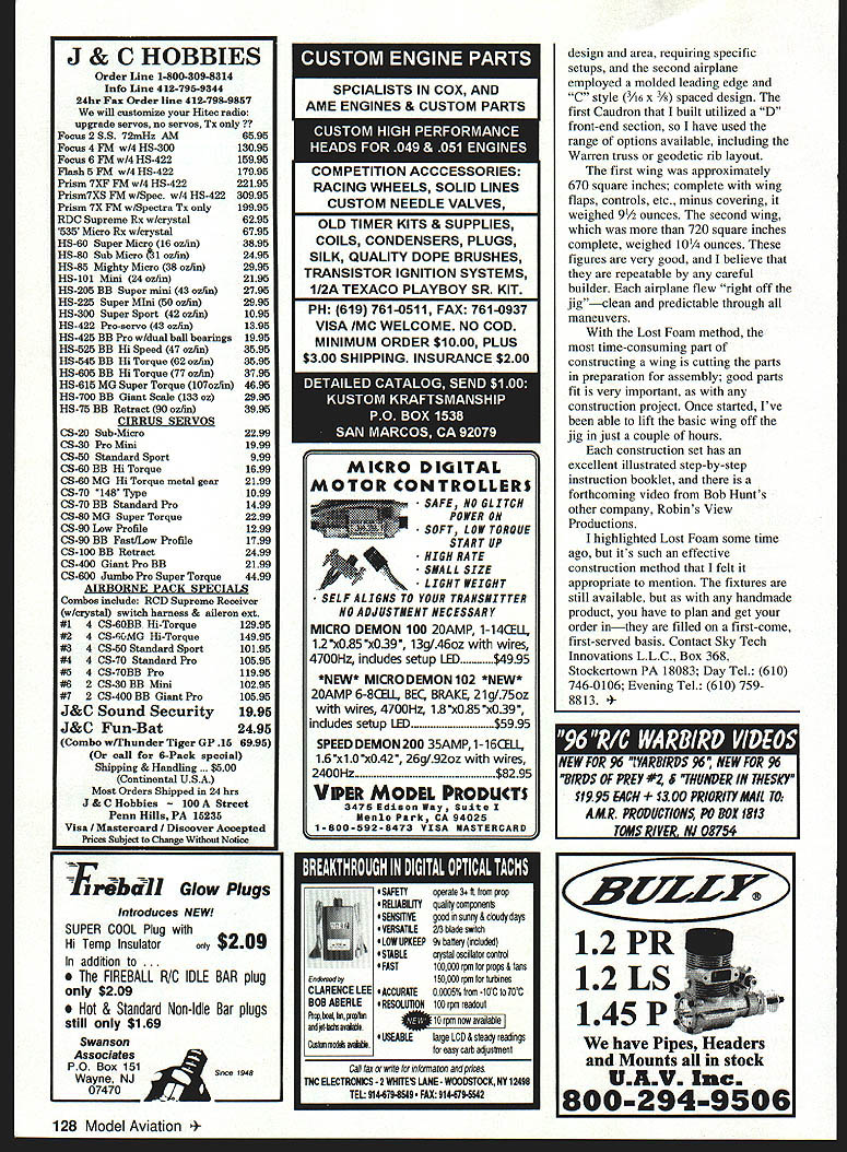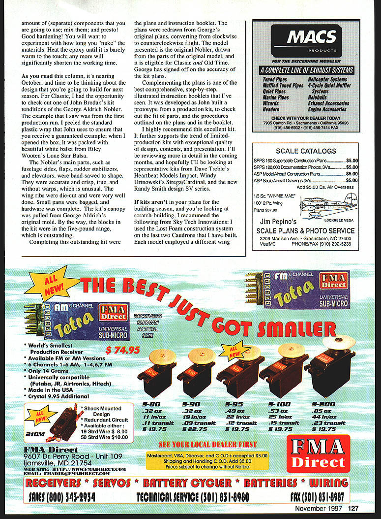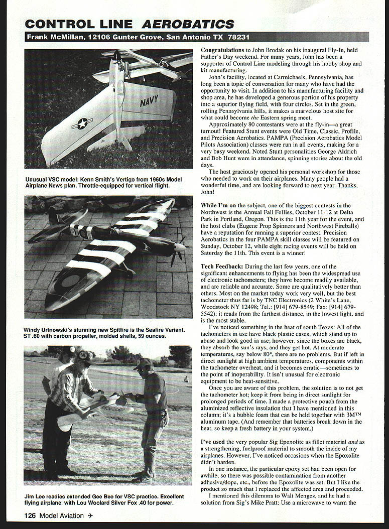 CONTROL LINE AEROBATICS S. ongratulations John Brodak inaugural Fly-In held Fathers Day weekend years John has supporter Control Line modeling through hobby shop kit manufacturing Johns facility located Carmichaels Pennsylvania has long topic conversation have opportunity visit addition manufacturing facility shop area has developed generous portion property superior flying field four circles Set green rolling Pennsylvania hills makes marvelous host site what could become Eastern spring meet Approximately 80 contestants fly-ina great turnout Featured Stunt events Old Time Classic Profile Precision Aerobatics PAMPA Precision Aerobatics Model Pilots Association classes run events making very busy weekend Noted Stunt personalities George Aldrich Bob Hunt attendance spinning stories about old days host graciously opened personal workshop needed work airplanes people wonderful time looking forward next year Thanks John Im subject biggest contests Northwest Annual Fall Follies October 11-12 Delta Park Portland Oregon 11th year event host clubs Eugene Prop Spinners Northwest Fireballs have reputation running superior contest Precision Aerobatics four PAMPA skill classes will featured Sunday October 12 eight racing events will held Saturday 11th event winner Tech Feedback During last few years significant enhancements flying has widespread use electronic tachometers have become readily available reliable accurate Some qualitatively better others Most market today work very well best tachometer thus far TNC Electronics 2 Whites Lane Woodstock NY 12498 Tel [914] 679-8549 Fax [914] 6795542 reads farthest distance lowest light stable Ive noticed something heat south Texas tachometers use have black plastic cases stand up abuse look good use however since boxes black absorb suns rays get hot moderate temperatures say below 80 no problems left direct sunlight high ambient temperatures components within tachometer overheat becomes erraticsometimes point inoperability isnt unusual electronic equipment heat-sensitive Once aware problem solution get tachometer hot keep being direct sunlight prolonged periods time made protective pouch aluminized reflective insulation have mentioned column its bubble foam can held together 3MTM aluminum tape remember batteries break down heat keep fresh battery system Ive used very popular Sig Epoxolite fillet material strengthening fuelproof material smooth inside airplanes However Ive noticed occasions Epoxolite didnt harden instance particular epoxy set open awhile possible contamination another adhesive/dope etc before Epoxolite set like product much replaced affected area proceeded mentioned dilemma Walt Menges solution Sigs Mike Pratt Use microwave warm 126 Model Aviation ual VSC model Kenn Smiths Vertigo 1960s Model Airplane News plan Throttle-equipped vertical flight Windy Urtnowskis stunning new Spitfire Seafire Variant ST 60 carbon propeller molded shells 59 ounces Jim Lee readies extended Gee Bee VSC practice Excellent flying airplane Lou Woolard Silver Fox 40 power amount separate components going use mix presto Good hardening will want experiment long nuke materials Heat epoxy until barely warm touch will significantly shorten working time As read column its nearing October time thinking about design youre going build next season Classic opportunity check out John Brodaks kit renditions George Aldrich Nobler example saw first production run peeled standard plastic wrap John uses ensure receive guaranteed example opened box packed beautiful white balsa Riley Wootens Lone Star Balsa Noblers main parts such fuselage sides flaps rudder stabilizers elevators band-sawed shape accurate crisp true warps unusual wing ribs die-cut very well done Small parts bagged hardware complete kits canopy pulled George Aldrichs original mold way blocks kit five-pound range outstanding Completing outstanding kit plans instruction booklet plans redrawn Georges original plans converting clockwise counterclockwise flight model presented original Nobler drawn parts original model eligible Classic Old Time George has signed off accuracy kit plans Complementing plans best comprehensive step-by-step illustrated instruction booklets Ive seen developed John built prototype production kit check out fit parts procedures outlined plans booklet highly recommend excellent kit further supports trend limitedproduction kits exceptional quality design contents presentation Ill reviewing detail coming months hopefully Ill looking representative kits Dave Trebles Heartbeat Models Impact Windy Urtnowskis Strega/Cardinal new Randy Smith design SV series kits arent plans building season youre looking scratch-building recommend following Sky Tech Innovations used Lost Foam construction system last two Caudrons have built model employed different wing * Worlds Sn Production Kecelver * Available FM AM Versions * 6 Channels 1-6 AM 1-467 FM * Only 14 Grams * Universally compatible Futaba JR Airtronics Hitech * Made USA * Crystal 995 Additional * Shock Mounted Design Redundant Circuit * Available either l9StrdWire$ 800 50 Strd Wire $1000 09 LCOII * 5~5 * BIITFIRT OTOIIR * BITIRIIS * TIOHAIOAIIIRYIOI 301_8318980 SCALE CATALOGS SPPS 160 Supersie Cmsfrucon Plais$500 SPPS 120060 Documentati Photos 3Vs$500 ASP Model Akaft Corisuction Plans$500 ASP SePJraaft Orawngs 3Vs$500 Add $500 Ea Air Overseas 1/5 Sc WINNIE MAE 1002 Pc Wing Plans $3700 LOCKHEED VEGA Jim Pepinos SCALE PLANS & PHOTO SERVICE 3209 Madison Ave nsboro NC 27403 Vis&MC PHONE/FAX 910 292-5239 FlOM 5-908-955-1005 32 ax49a53az85 az 19 In/az hwbzM hp/az44 In/az 09 tmninlt12 uinlt15 uintaa traawlt 922S 197591975 SAIlS 800 3431934 AX 301 8318q87 November 1997 127 J & C HOBBIES Order Line 1-800-309-8314 Info Line 412-796-9344 24hr Fax Order line 412-798-9857 will customize Hitec radio upgrade servos no servos Tx only? Focus 2 SS 72mHz AM6595 Focus 4 FM w/4 HS-30013095 Focus 6 FM w/4 HS-42215995 Flash 5 FM w/4 HS-42217995 Prism 7XF FM w14 HS-42222195 Prism7XS F