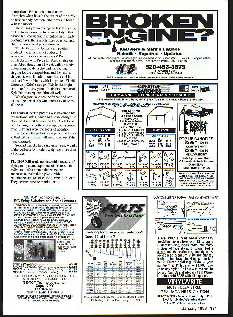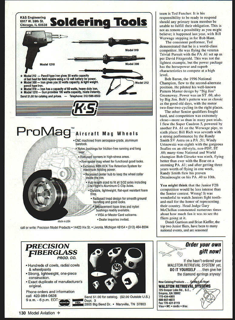 CONTROL LINE AEROBATICS THE US Control Line Precision Aerobatics community has new international F2B team As has become customary members selected International Aeromodeling Center Muncie Indiana during Labor Day weekend Operating according published rules team selection using AiNIA guidelines team selection comnuttee chose judges highly experienced cadre Head Judge Chief National Judge Gary McClellan previous Head Judge Dave Cook attendance assist training tabulating Warren Tiahrt Event Director Nationals Event Director ensured strict adherence FAT Federation Aeronautique Internationale rules superbly administered event run smoothly fairly best personnel AMA staff members did super job supporting event AMA president Dave Brown offered wise words pilots meeting Technical Director Steve Kaluf responded rapidly problem trials format similar Nationals qualifying day Senior participants case provide 10 best team selection round Four flights flown against two sets judges top flight against set counted determine finalists final day three rounds flown before set judges top two counted no canyover scores US will represented world national champions backed former national champions alternates trials some best flying years maybe ever As airplane packages get better flying elevated higher level Bill Werwages week flew well can recall Ive watched him 40 years focused patterns/geometry honed airplane driving through maneuvers no other field Bill flew fabulous P-47s powered Precision Aero 61 55 ounces no stretch appreciate packages exceptional performance Whats P-47 twins configured retracts second member team well-known respected competitor Paul Walker As familiar world Paul many-time National Champion former World Champion can dominant flier have ever seen year flying superlight 55-ounce version nowfamous Impact design example constructed directly Dave Tribles Heartbeat Models kits some added sophistication such molded carbon-fiber landing gear fuselage mounted weighed approximately ounce half comparable aluminum gear gear made mold Howard Rush heat-tempered believe 2500F Paul also used another sweet-running Precision Aero engine third member team twotime team member current national champion David Fitzgerald continued accurate pattern presentation ably coached dad time Nats judge Bill Fitzgerald Davids airplane familiar Star Gazer version Ted Fancher Trivial Pursuit model upgraded performance adding latest Precision Aero engine 10cc 61 Werwage diamondback tuned pipe Coupled new Eather three-blade heavily undercambered propellers Davids approach somewhat different what might considered norm 61 use PA 61 pipe set l6/4 inches plug first baffle plus minus 1/g Davids l73/4171/2 inches launch rpm 9600-9800 norm 1020010600 range primarily because increased load undercamber props holding static revolutions inflight unload revolutions performance awesome rattle pipe indicated hard tune Filling important first-alternate slot January1998 129 Former world national champ Paul Walker latest Impact Current national champion US team member David Fitzgerald 55 ounces Precision Aero power Allen Brickhaus photo Star Gazer Precision Aero 61 Werwage pipe Junior F2B competitors fathers L-R US team member Dondi Garrison Kyle Freeman Brian Kieffer Photo Allen Brickhaus 6917 W 59th St Tools Engineering Soldering Chicago IL 60638 U * Model 212 il type iron gives 30 watts capacity fast heat field repairs using 12 volt battery power * Model 300 Inn gives 30 watts capacity light weight pencil type iron * Model 910 Iron has capacity 0160 watts heavy duty iron * Model 1210 Gun provides 100 watts capacity heats instantly Send $100 catalog prices phone 31215868503 Model 9i0 Model 300 P2 212 P rOI\4-g Aircraft Mag Wheels CNC machined aerospace-grade aluminum barstock Tlylo bushings friction-free running long wear RadIusd corners high-stress areas Fiv@spoemag wheel functional good looks flCA Tire Retention System power nter hub keep wheel collar Hub lenth sized fit 5/32 axles including Lite-Flihts Aluminum C-Clip Axles lightweight flat-spot resistant foam Radiused tread design smooth ground ha g good looks lflPment foam tires nylon readily available VISA Master Card welcome Dealer inquiries invited call write Precision Model Products 3 Hix St nia Michigan 48154 313 464-8594 130 Model Aviation Ted Fancher responsibility ready respond should primary team member unable fulfill obligation remote possibility might believe happened last year Bill Werwage stepping Bob Hunt consistent performer Ted demonstrated world-class competitor flying veteran Trivial Pursuit PA 61 set up per David Fitzgerald lightest example power package has horsepower superb characteristics compete high level Bob Baron 1996 National Champion flew second-alternate position piloted well-known Pattern Master design Big Jim Greenaway Power ST 60 also Big Jim Bobs pattern classic good old days motor two-four-two-cycling right places other Senior qualifiers fought hard competition extremely closemore past trials flew Super Caudron 5 powered another PA 61 Werwage pipe sixth place Bill Rich seventh strong performance Randy Smith SV Astra PA 51 Windy Urtnowski eighth gorgeous Seafire old-style non-PDP ST 60 many-time National World champion Bob Gieseke ninth flying better ever Bear storming PA 61 after getting three years worth flying week Randy Smith flew proven Dreadnought PA 40 10th might think Junior F2B competition would less intense Senior contest Wrong wonderful watch Juniors fight toothand-nail honor representing country Head Judge Gary McClellan commented numerous times about much fun see fliers going Dondi Garrison Brian Kieffer top two Junior fliers have national events seasoned USA PRECISION FIBERGL Hundreds cowls radial cowls & wheelpants Strong lightweight one-piece construction Exact duplicate manufacturers original Phone orders information call 4239840828Send $100 catalog $200 Outside US 9 am 6 pm EDTiDept 3 V6A LWJ2805 Big Bend Dr ville TN 37803 Order your o
