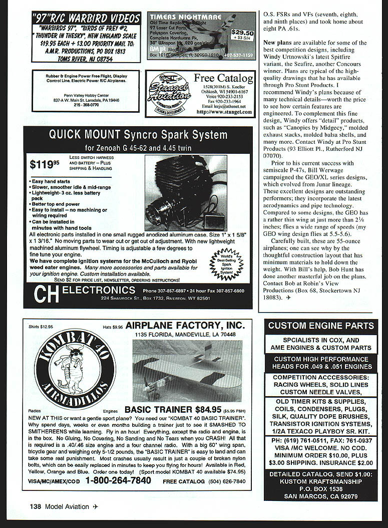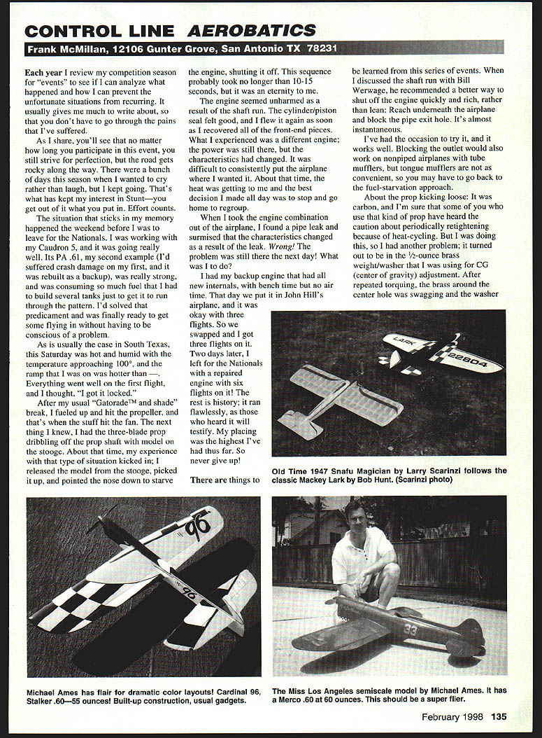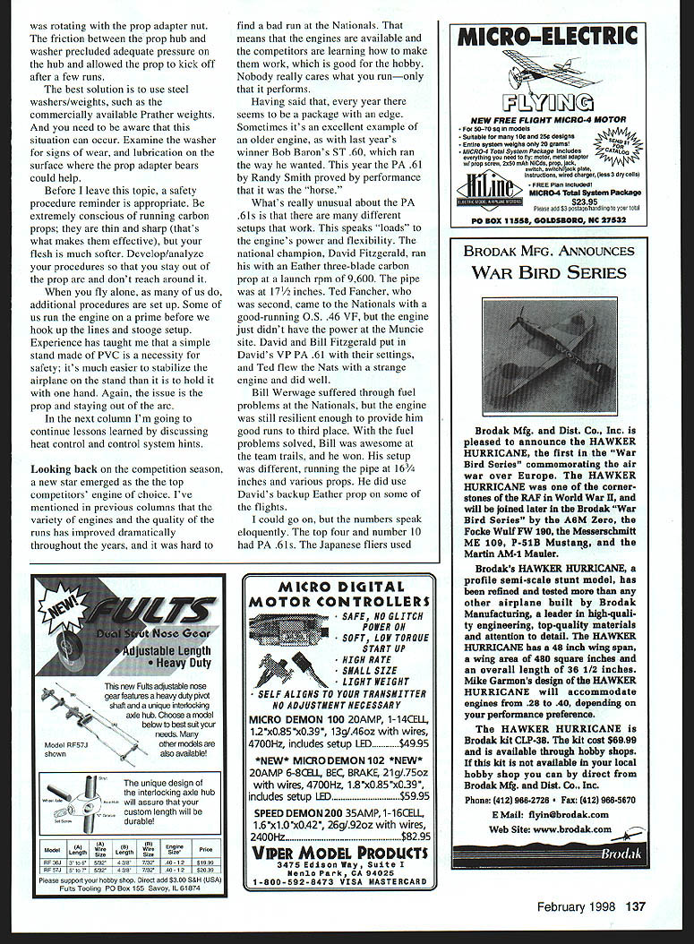 CONTROL LINE AEROBATICS year review competition season events see can analyze what happened can prevent unfortunate situations recurring usually gives much write about dont have go through pains Ive suffered As share youll see no matter long participate event still strive perfection road gets rocky along way bunch days season wanted cry rather laugh kept going Thats what has kept interest Stuntyou get out what put Effort counts situation sticks memory happened weekend before leave Nationals working Caudron 5 going really well Its PA 61 second example Id suffered crash damage first rebuilt backup really strong consuming much fuel build several tanks just get run through pattern Id solved predicament finally ready get some flying having conscious problem As usually case South Texas Saturday hot humid temperature approaching 1000 ramp was hotter ything went well first flight thought got locked After usual GatoradeTM shade break fueled up hit propeller thats stuff hit fan next thing knew three-blade prop dribbling off prop shaft model stooge About time experience type situation kicked released model stooge picked up pointed nose down starve engine shutting off sequence probably took no longer 10-15 seconds eternity engine seemed unharmed result shaft run cylinder/piston seal felt good flew again soon recovered front-end pieces What experienced different engine power still characteristics changed difficult consistently put airplane wanted About time heat getting best decision made day stop go home regroup took engine combination out airplane found pipe leak surmised characteristics changed result leak Wrong problem still next day What Ito backup engine new internals bench time no air time day put John Hills airplane okay three flights So swapped got three flights Two days later left Nationals repaired engine six flights rest history ran flawlessly heard will testify placing highest Ive thus far So never give up learned series events discussed shaft run Bill Werwage recommended better way shut off engine quickly rich rather lean Reach underneath airplane block pipe exit hole Its almost instantaneous Ive occasion try it works well Blocking outlet would also work nonpiped airplanes tube mufflers tongue mufflers convenient may have go back fuel-starvation approach About prop kicking loose carbon Im sure some use kind prop have heard caution about periodically retightening because heat-cycling doing another problem turned out 1/2-ounce brass weight/washer using CU center gravity adjustment After repeated torquing brass around center hole swagging washer February 1998 135 Old Time 1947 Snafu Magician Larry Scarinzi follows things classic Mackey Lark Bob Hunt Scarinzi photo Michael Ames has flair dramatic color layouts Cardinal 96 Miss Los Angeles semiscale model Michael Ames has Stalker 6055 ounces Built-up construction usual gadgets Merco 60 60 ounces should super flier rotating prop adapter nut friction between prop hub washer precluded adequate pressure hub allowed prop kick off after few runs best solution use steel washerslweights such commercially available Prather weights need aware situation can occur Examine washer signs wear lubrication surface prop adapter bears could help Before leave topic safety procedure reminder appropriate extremely conscious running carbon props thin sharp thats what makes effective flesh much softer Developanalyze procedures stay out prop arc dont reach around fly alone us additional procedures set up Some us run engine prime before hook up lines stooge setup Experience has taught simple stand made PVC necessity safety its much easier stabilize airplane stand hold hand Again issue prop staying out arc next column Im going continue lessons learned discussing heat control control system hints Looking back competition season new star emerged the top competitors engine choice Ive mentioned previous columns variety engines quality runs has improved dramatically throughout years hard new Fulls adjustable nose gear features heavy duty pIvot haft unique interlocidng sale hub Choose model obetuw best suit needs Model RF57Jother models shown-also availablel unique design interlocking axle hub will assure ustom length will durablel ModelA 1 BEnginepisc Length sineLengthsine RF35J 3 065/3243/57/3040- 12$1999 RF57J 51075/3243/8713240- 12$2039 Please support hobhy shop Direct add $300 5&H USAI Fulls Tooling P0 eox 155 Sasoy IL 61874 find bad run Nationals means engines available competitors learning make work good hobby Nobody really cares what runonly performs Having said year seems package edge Sometimes its excellent example older engine last years winner Bob Barons ST 60 ran way wanted year PA 61 Randy Smith proved performance horse Whats really unusual about PA 61s different setups work speaks loads engines power flexibility national champion David Fitzgerald ran Eather three-blade carbon prop launch rpm 9600 pipe 17/2 inches Ted Fancher second came Nationals good-running OS 46 VF engine just didnt have power Muncie site David Bill Fitzgerald put Davids VP PA 61 settings Ted flew Nats strange engine did well Bill Werwage suffered through fuel problems Nationals engine still resilient enough provide him good runs third place fuel problems solved Bill awesome team trails won setup different running pipe l6/4 inches various props did use Davids backup Eather prop some flights could go numbers speak eloquently top four number 10 PA 61s Japanese fliers used BRODAK MFG ANNOUNCES WAR BIRD SERIES Brodak Mfg Dist Co Inc pleased announce HAWKER HURRICANE first War Bird Series commemorating air war over Europe HAWKER HURRICANE corner stones RAE World War U will joined later Drodak War Bird Series A6M Zero Focke WuIf FW 190 Messerschmltt ME 109 P-SiB Mustang Martin AM-i Mauler Brodaks HAWKER HURRICANE profile semi-scale stunt model has refined tested other airplane built Brodak Manufacturing leader high-quali ty engineering top-quality materials attention detail HAWKER HURRICANE has 