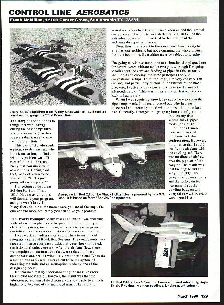 CONTROL LINE AEROBATICS U story solutions things went wrong during past competitive season continues trend suggests may next year before finish part tale needs preface demonstrate took long find out what problem root situation run assumptions Having said may wondering guy going off deep end Im getting Problem Solving Stunt Fliers 101 Making assumptions will devastate program wont know fliers aware traps quicker accurately can solve problem Real World Example years ago working full-scale airplanes helping develop prototype electronic systems install execute test programs ran major assumption created serious problem working major aircraft firm install integrate series Black Box Systems components mounted large equipment racks shock-mounted individual units After airplane flew equipment malfunctions related loose components broken wiresa vibration problem situation analyzed turned out system mounting units assumption made design engineers reasoned shock-mounting massive racks would vibrate However result vibration period shifted very low cycle much higher because increased mass vibration period very close component resource internal components electronics started failing individual boxes retrofitted racks problems disappeared like magic Stunt fliers subject same condition Trying troubleshoot problems examining whole picture beginning Everything must subject scrutiny Im going relate assumptions situation plagued several years knowing Although Im going talk about care feeding pipes scenario about heat cooling same principles apply conventional setups set stage Im very conscious cooling particularly airflow interior model Likewise typically pay close attention balance inlet/outlet areas assumption would come back haunt acquiring knowledge about make pipe setups work looked everybody successful mentally noted what installation looked like Generally merged grouping configuration used first successful all-piped model SV-12 As far knew no real problems configuration However did notice could fly airplane cowling off no directed airflow over pipe aft coupler result engine did act predictably power down slightly locked-in feel gone put cowling back everything went sweet good lesson March 1998 129 Leroy Blacks Spitfires Windy Urtnowski plans Excellent construction gorgeous East Coast finish Awesome Limited Edition Chuck Holtzapples powered two OS 35s based foam Bee Jay components Limited Edition has 3/2 custom horns hand-rubbed Sig dope finish Fine detail work cowlings landing gear treatment TO C Three-peat Jason Shulman wins Masters Championships 1996 1991 3W engine Bill Hemple Jr wins 1997 IMAC National Championship 3W engine can enjoy same reliability performance 3W engines featuring auto advance electronic ignition light weight easy starting year warran ty economical gas operation odeilmotoren world adeFn Giant Scale Motors Call - more information complete line motors 24cc 240cc single four cylinders Exclusive US Representative factory authorized service far 3W Modelimotoren Desert Aircraft PO Box 18038 Tucson AZ 85731 Phone 520722-0607 Fax 520 722-5622 rn - because showed what happens heating problem system Notice use system pipes have deal entire packageless muffler unless its enclosed problem stage yet manifest itself completely getting good engine runs different engines pipes wasnt aware anything significantly wrong However aware having patch holes pipes others having fewer problems stage starting question everything except what doing making subtle changes areas still having persistent leaks after fewer 100 flights Since flying order 300 flights year Id change pipes fix go After engine runs excellent About time also began using Super Caudron series designs very deep drop cowling resultant internal airflow changes As pipes have evolved during last 10 years Stunt have become much reliable What brought problem surface like ballistic missile sub launch past Nationals team trials After contest checked pipes found major leaks didnt pick up quickly because PA 61 broad power tolerant factors wanted some flying waiting pipes repaired used older design pipe coated JB Weld epoxy good high-temperature gray-colored epoxy point story light bulb comes PA 61 ran extremely well older pipe slightly smaller designed 51 After eight wonderful runs happy until returned home checked pipe severely discolored front coupler back about six inches about same time Bill Werwage told interior pipes resin burned away hit hard major heat problem although Id wanting ignore pinpoint another matter needed find way check airflow really looked what I still didnt think could Maybe some holes would better However Id already tried pipe discolored unacceptable go doubt stop think set hair dryer cold fixed air inlet cowling reasonable fit dont want bleed air around coupling What found really surprised air literally dumping out bottom through hole over manifold coupling couldnt detect flow back So thought right track blocked hole tried again time small cutout aft major opening blasting out air Still no flow back blocked small hole tried again time /4-inch holes Id put side cowling cosmetics releasing air much surprise After blocking holes got strong air flow back Looking cowling shape suspected severe droop caused air flow follow bottom cowling curve exit openings After flying revised setup couldnt detect signs discoloration runs excellent always believe problem solved reliability will significantly increased Theres no magic procedure hair dryer direct air cowling worked well would recommend everyone surprised could show problem dont know exists gross level look airflow think should go surprise wasnt going should have refined level may able make adjustments improve situation Reading airflow dependent touch tried little heat yes raised some bubbles Next Im going look something such smoke could get airflow give better visual indication Any ideas out being smoker couldnt come up something convenient right away New Items As complement avail