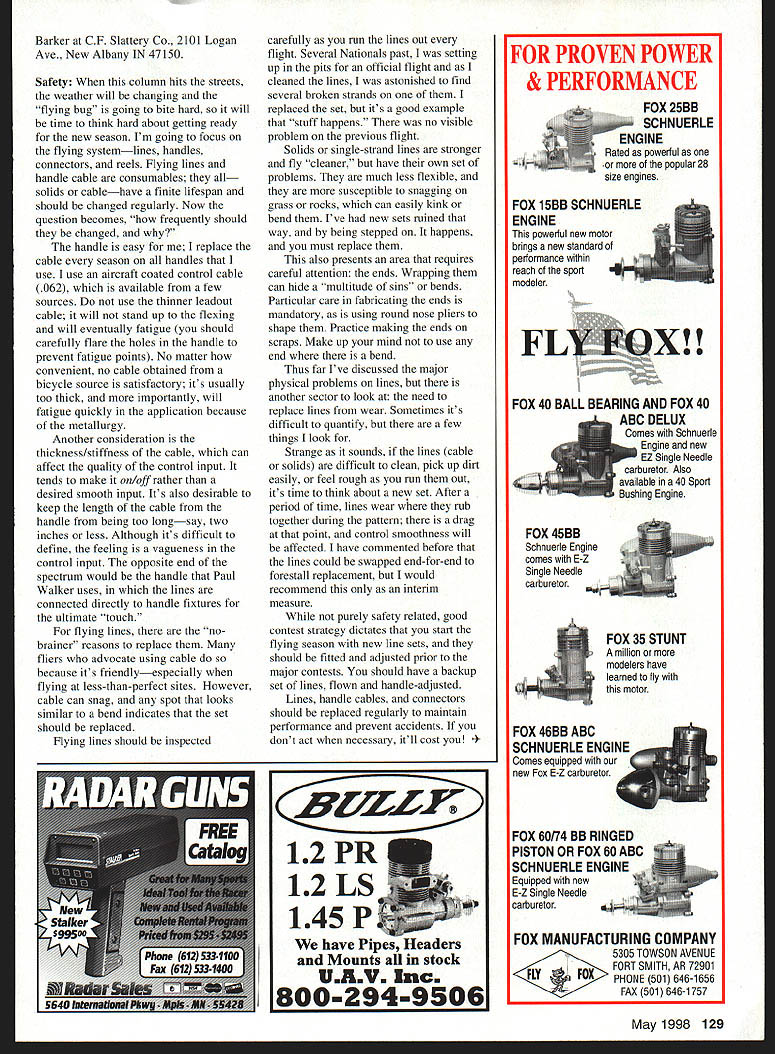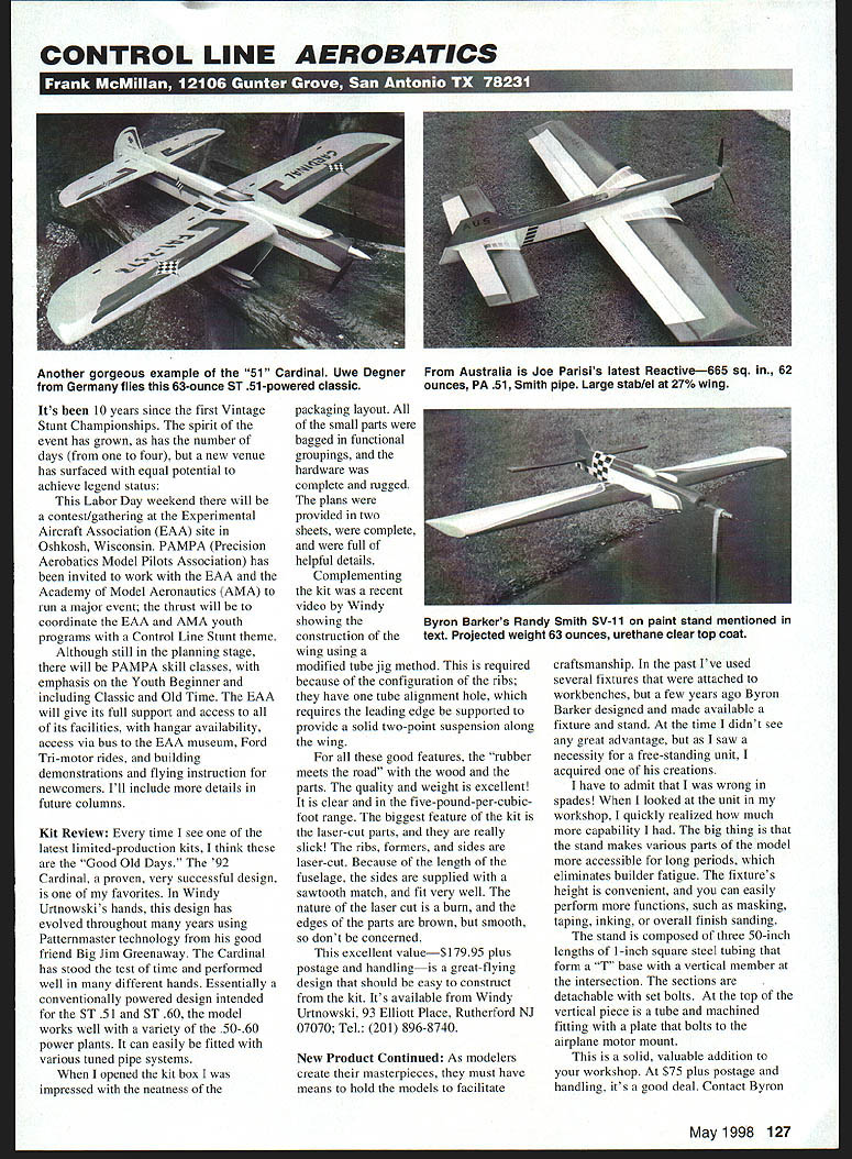 CONTROL LINE AEROBATICS U IU Its 10 years since first Vintage Stunt Championships spirit event has grown has number days four hut new venue has surfaced equal potential achieve legend status Labor Day weekend will contest/gathering Experimental Aircraft Association EAA site Oshkosh Wisconsin PAMPA Precision Aerobatics Model Pilots Association has invited work EAA Academy Model Aeronautics AMA run major event thrust will coordinate EAA AMA youth programs Control Line Stunt theme Although still planning stage will PAMPA skill classes emphasis Youth Beginner including Classic Old Time EAA will give its full support access its facilities hangar availability access via hus EAA museum Ford Tn-motor rides building demonstrations flying instruction newcomers Ill include details future columns Kit Review time see latest limited-production kits think Good Old Days 92 Cardinal proven very successful design favorites Windy Urtnowskis hands design has evolved throughout years using Patternmaster technology good friend Big Jim Greenaway Cardinal has stood test time performed well different hands Essentially conventionally powered design intended ST 51 ST 60 model works well variety 50-60 power plants can easily fitted various tuned pipe systems opened kit box impressed neatness packaging layout small parts bagged functional groupings hardware complete rugged plans provided two sheets complete full helpful details Complementing kit recent video Windy showing construction wing using modified tube jig method required because configuration ribs have tube alignment hole requires leading edge supported provide solid two-point suspension along wing good features rubber meets road wood parts quality weight excellent clear five-pound-per-cubicfoot range biggest feature kit laser-cut parts really slick ribs formers sides laser-cut Because length fuselage sides supplied sawtooth match fit very well nature laser cut burn edges parts brown smooth dont concerned excellent value$ 17995 plus postage handlingis great-flying design should easy construct kit Its available Windy Urtnowski 93 Elliott Place Rutherford NJ 07070 Tel 201 896-8740 New Product Continued As modelers create masterpieces must have means hold models facilitate craftsmanship past Ive used several fixtures attached workbenches few years ago Byron Barker designed made available fixture stand time didnt see great advantage saw necessity free-standing unit acquired creations have admit wrong spades looked unit workshop quickly realized much capability big thing stand makes various parts model accessible long periods eliminates huilder fatigue fixtures height convenient can easily perform functions such masking taping inking overall finish sanding stand composed three 50-inch lengths 1-inch square steel tubing form T base vertical member intersection sections detachable set bolts top vertical piece tube machined fitting plate bolts airplane motor mount solid valuable addition workshop $75 plus postage handling its good deal Contact Byron May1998 127 Another gorgeous example 51 Cardinal Uwe Degner Australia Joe Parisis latest Reactive665 sq 62 Germany flies 63-ounce ST 51-powered classic ounces PA 51 Smith pipe Large stab/el 27% wing Byron Barkers Randy Smith SV-11 paint stand mentioned text Projected weight 63 ounces urethane clear top coat Barker CF Slattery Co 2101 Logan Ave New Albany IN 47150 Safety When column hits streets weather will changing flying bug going bite hard will time think hard about getting ready new season Im going focus flying systemlines handles connectors reels Flying lines handle cable consumables solids cablehave finite lifespan should changed regularly Now question becomes frequently should changed handle easy replace cable season handles use use aircraft coated control cable 062 available few sources use thinner leadout cable will stand up flexing will eventually fatigue should carefully flare holes handle prevent fatigue points No matter bow convenient no cable obtained bicycle source satisfactory its usually too thick importantly will fatigue quickly application because metallurgy Another consideration thickness/stiffness cable can affect quality control input tends make on/off rather desired smooth input Its also desirable keep length cable handle being too longsay two inches less Although its difficult define feeling vagueness control input opposite end spectrum would handle Paul Walker uses lines connected directly handle fixtures ultimate touch flying lines no brainer reasons replace fliers advocate using cable because its friendlyespecially flying less-than-perfect sites However cable can snag spot looks similar bend indicates set should replaced Flying lines should inspected carefully run lines out flight Several Nationals past setting up pits official flight cleaned lines astonished find several broken strands replaced set its good example stuff happens no visible problem previous flight Solids single-strand lines stronger fly cleaner have own set problems much less flexible susceptible snagging grass rocks can easily kink bend Ive new sets ruined way being stepped happens must replace also presents area requires careful attention ends Wrapping can hide multitude sins bends Particular care fabricating ends mandatory using round nose pliers shape Practice making ends scraps Make up mind use end bend Thus far Ive discussed major physical problems lines another sector look need replace lines wear Sometimes its difficult quantify few things look Strange sounds lines cable solids difficult clean pick up dirt easily feel rough run out its time think about new set After period time lines wear rub together during pattern drag point control smoothness will affected have commented before lines could swapped end-for-end forestall replacement would recommend interim measure purely safety related good contest strategy dictates start flying season new line sets should fitted adjusted prior major contests should have backup set line